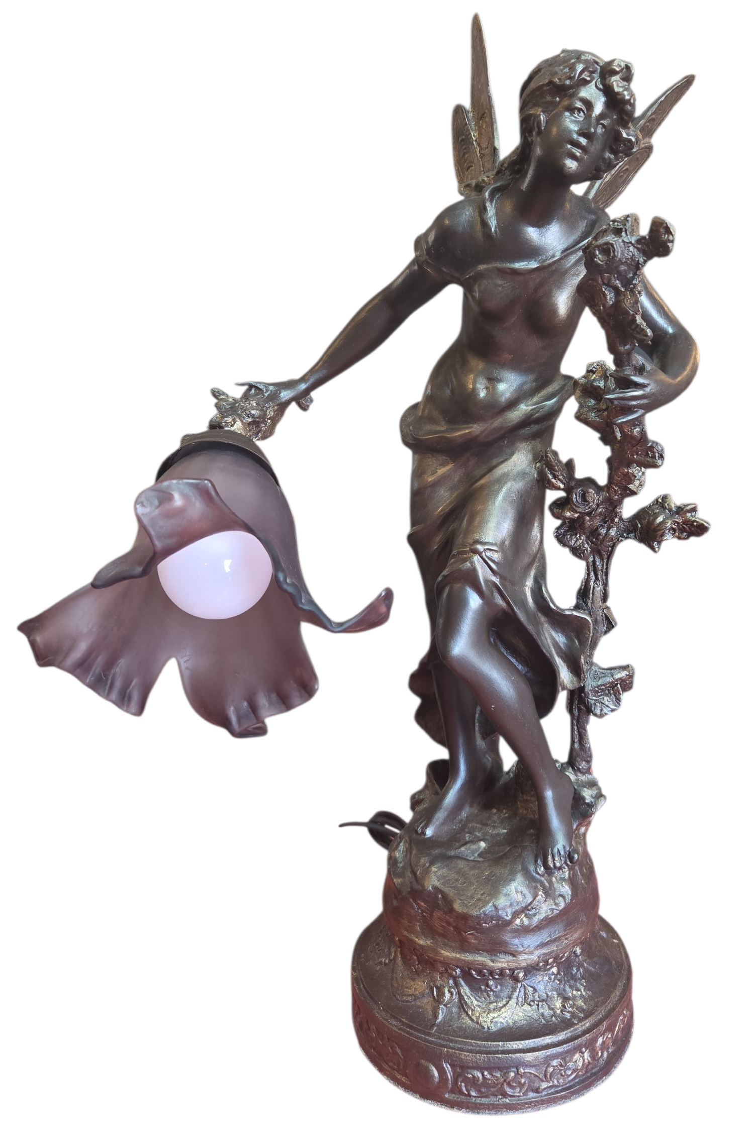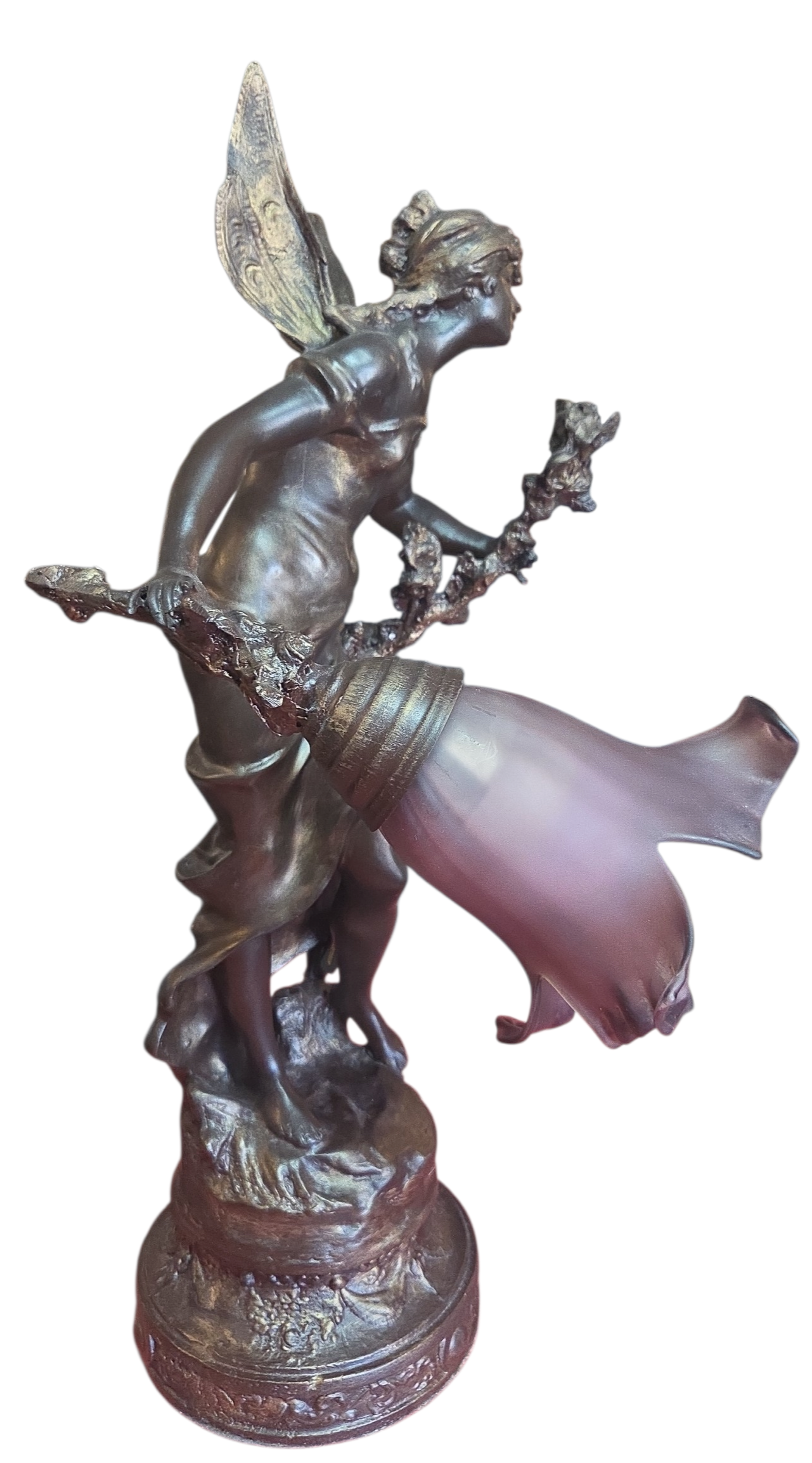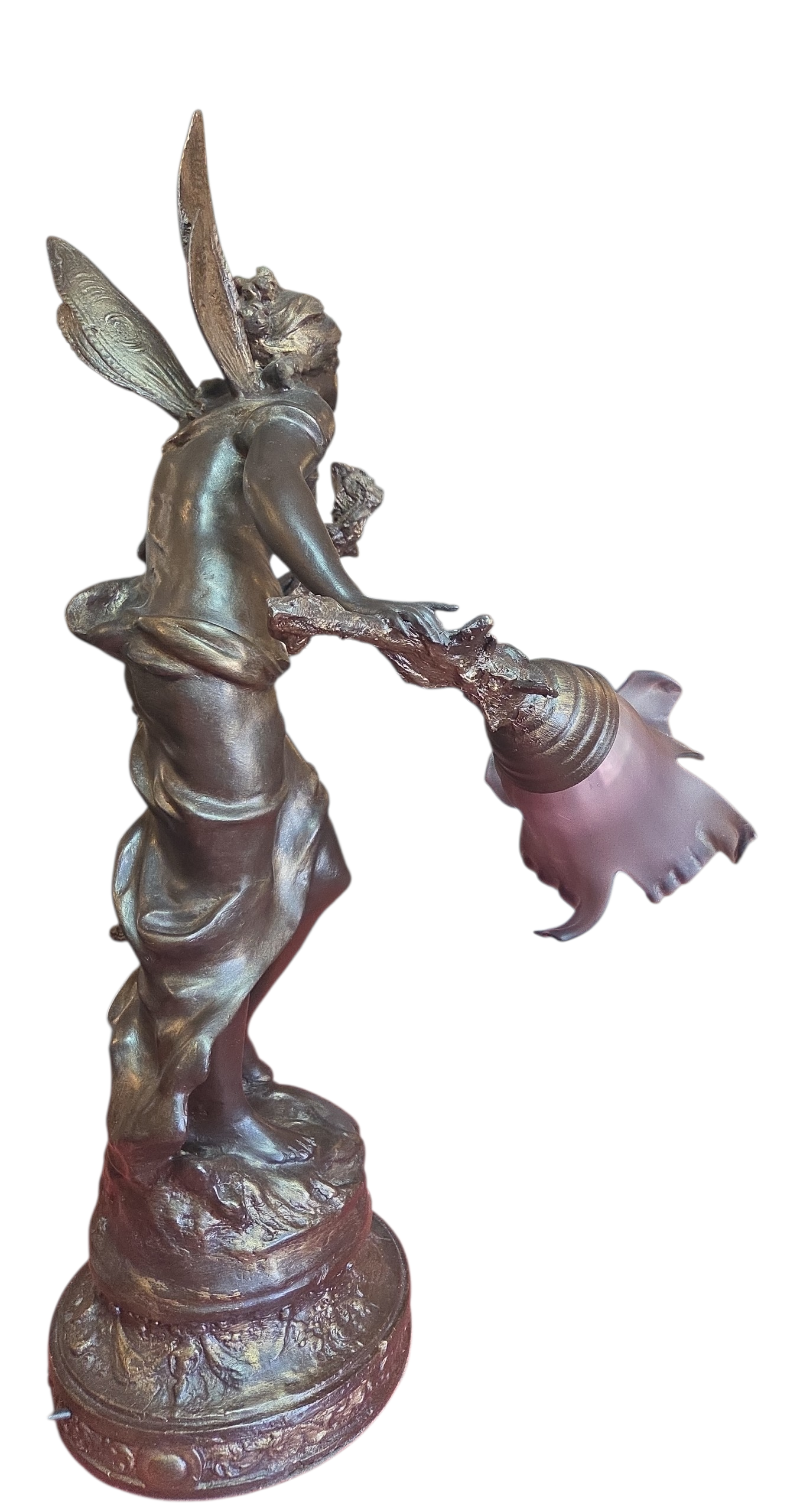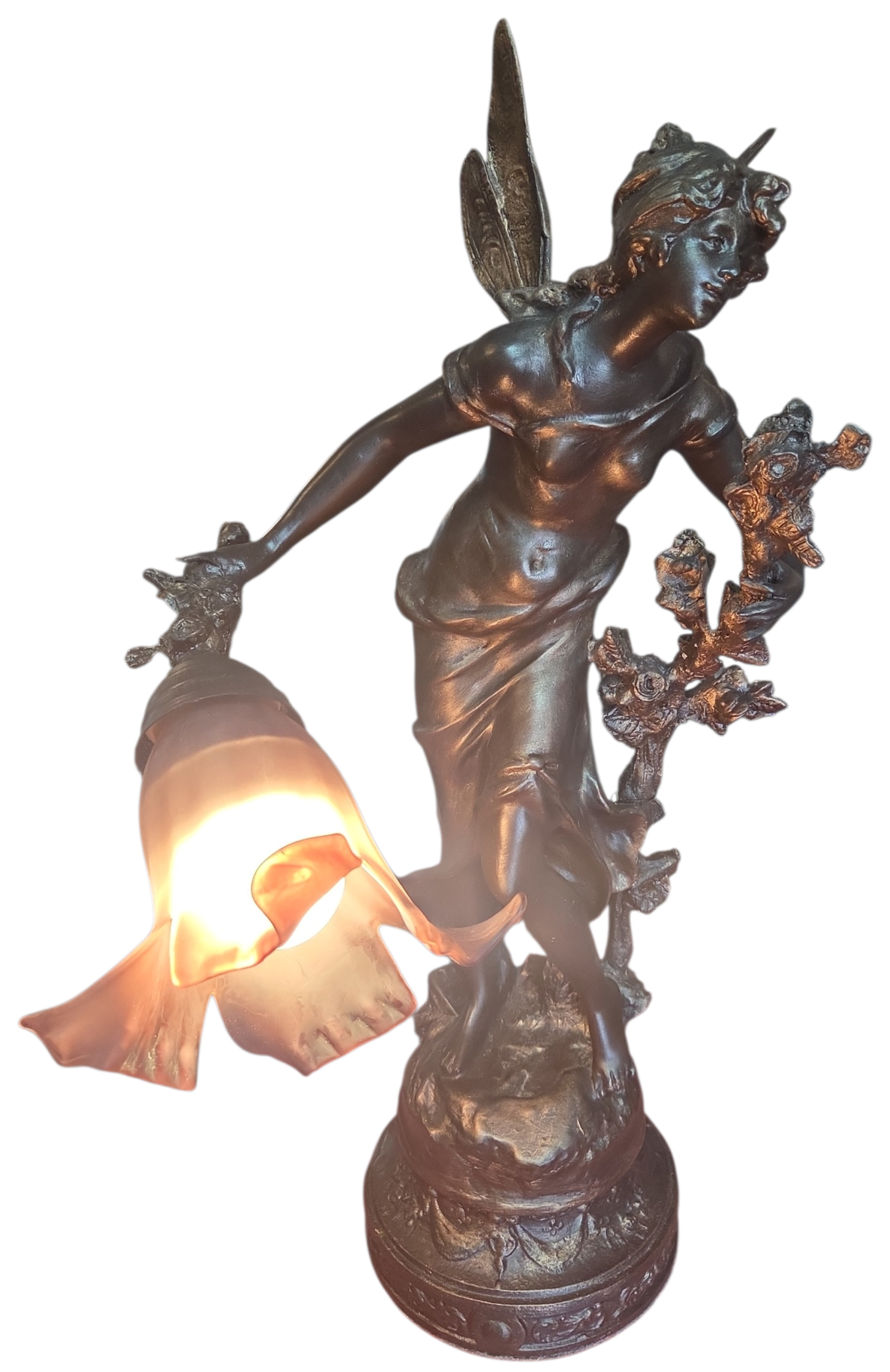 Apresentamos esta magnífica luminária escultura confeccionada em petit bronze, uma peça que une funcionalidade e o refinamento das artes decorativas clássicas. A escultura retrata uma figura feminina alada, com detalhes expressivos na face, cabelos e vestimenta fluida.