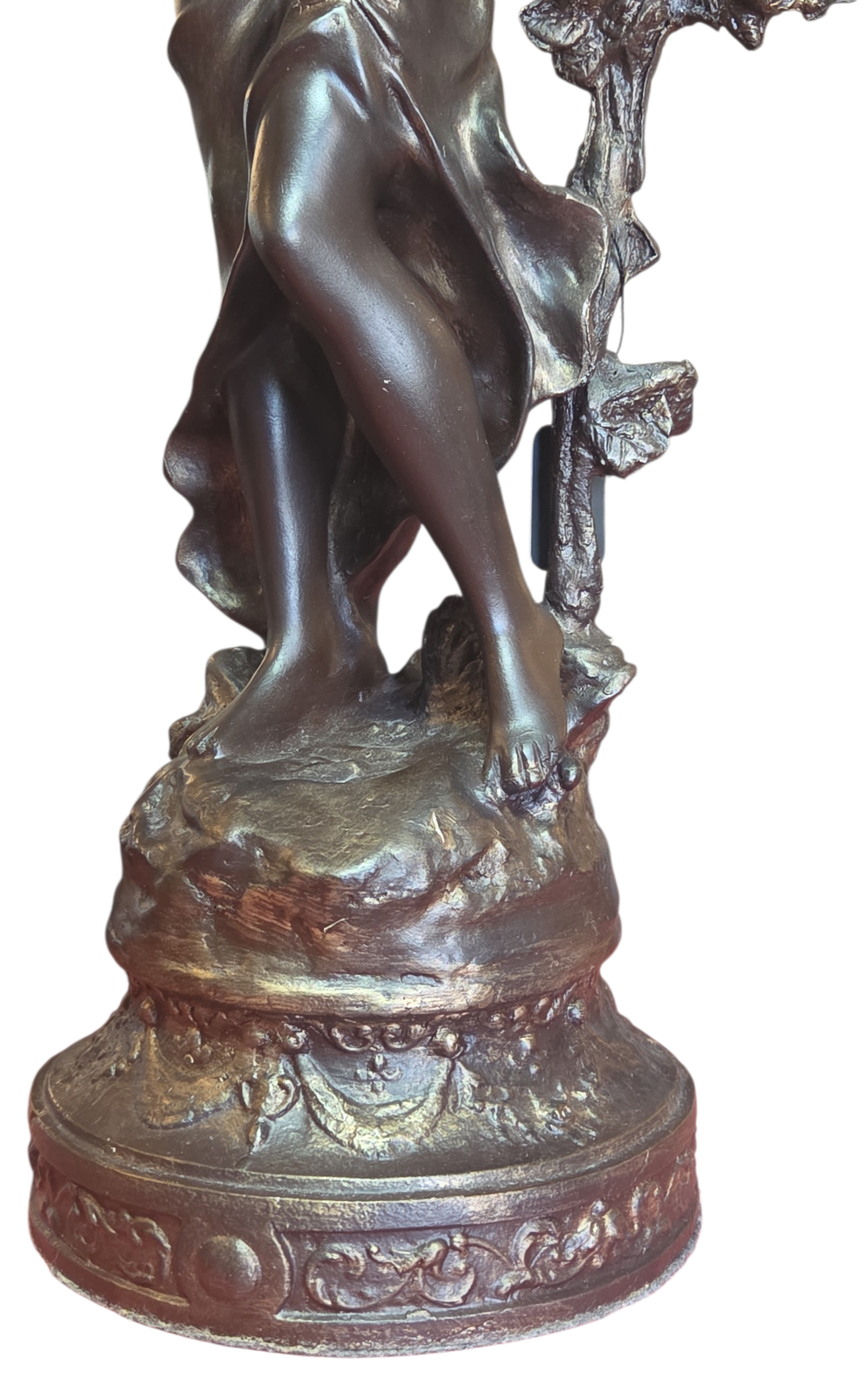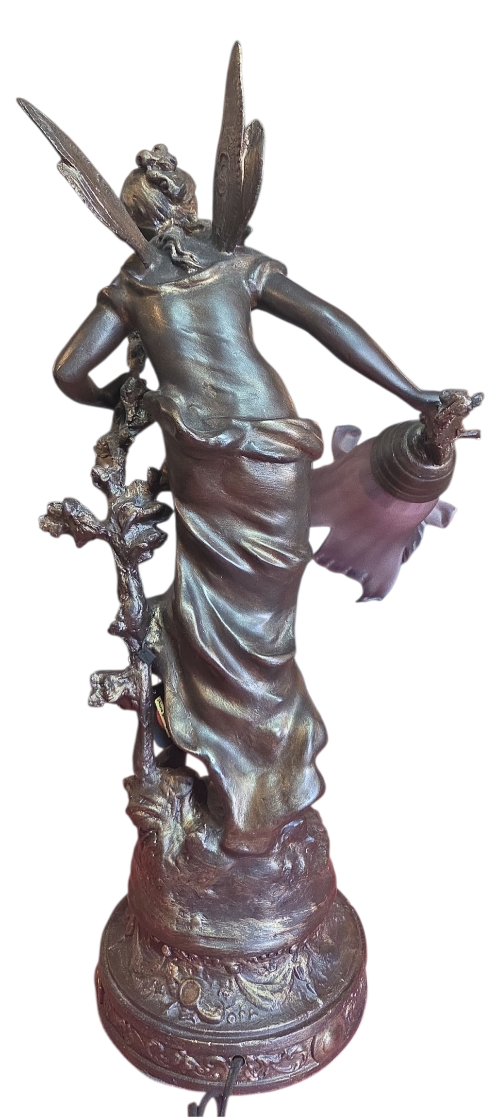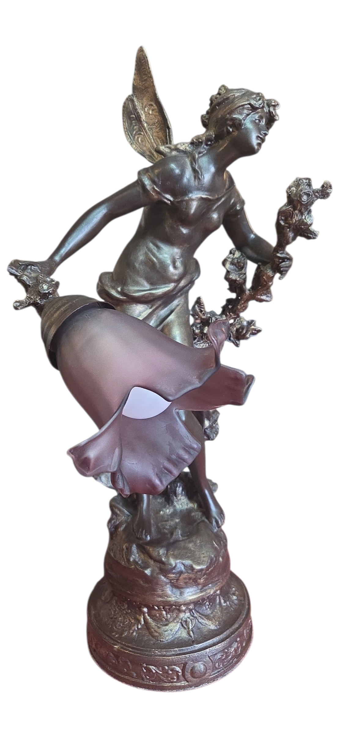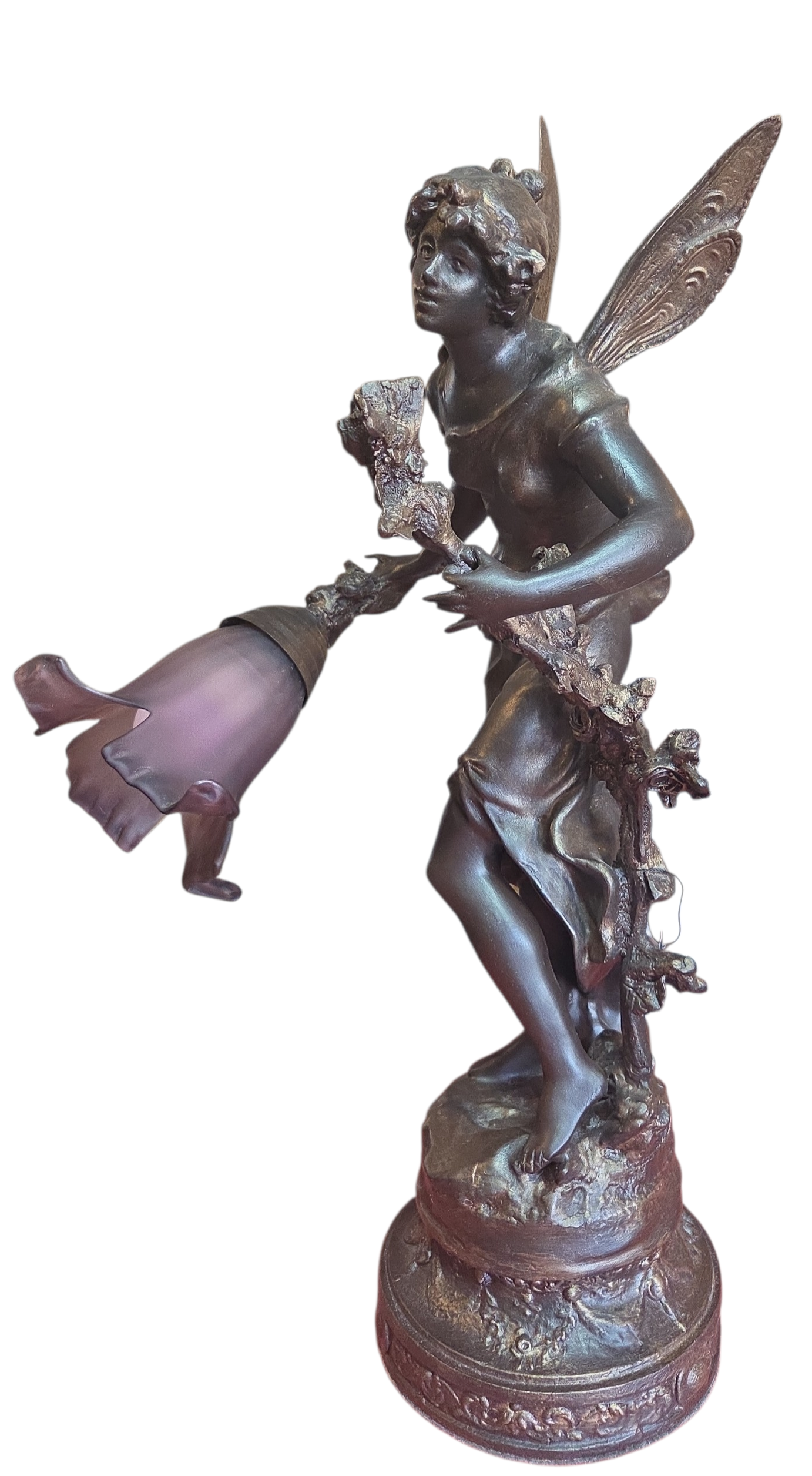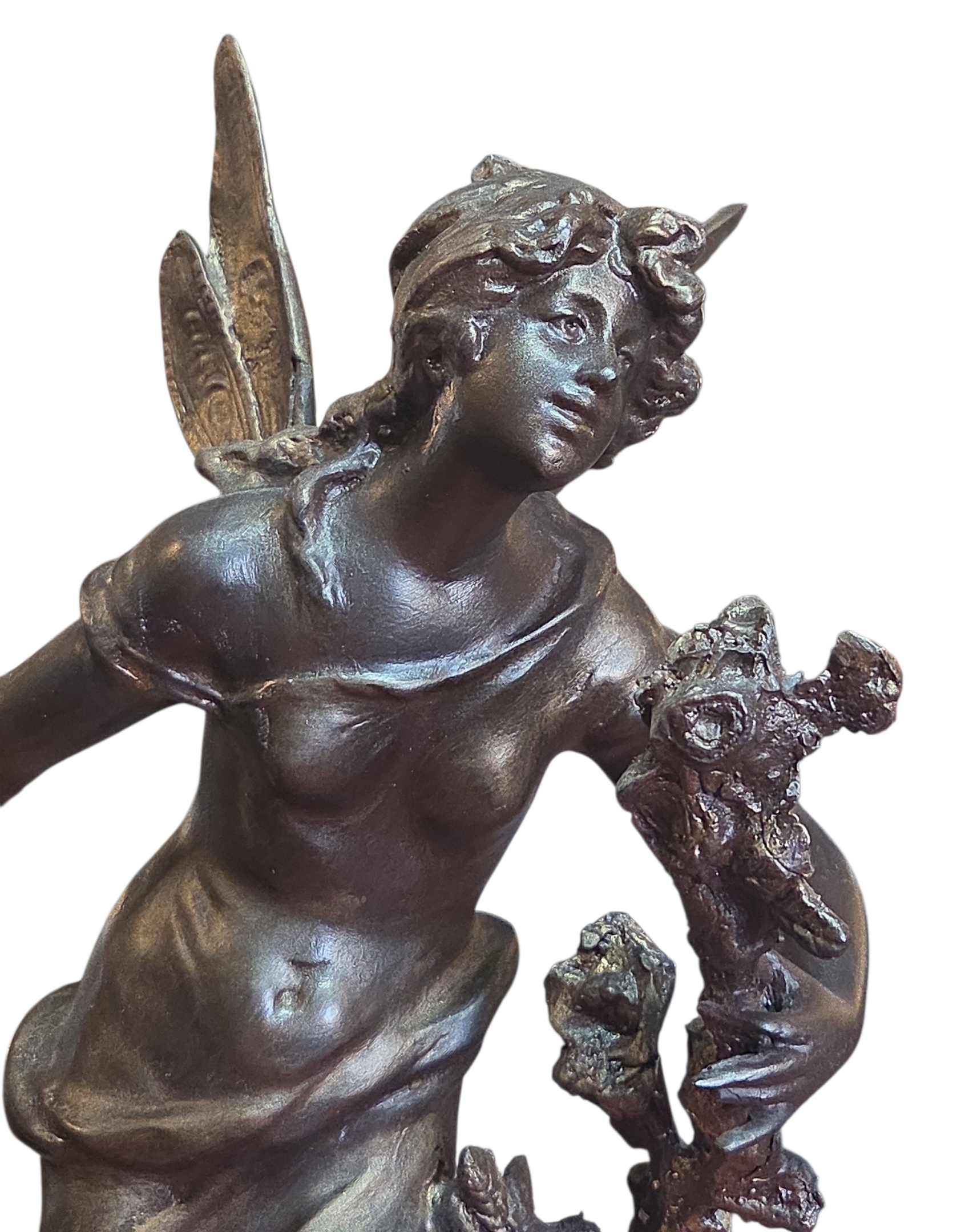 Apresentamos esta magnífica luminária escultura confeccionada em petit bronze, uma peça que une funcionalidade e o refinamento das artes decorativas clássicas. A escultura retrata uma figura feminina alada, com detalhes expressivos na face, cabelos e vestimenta fluida.