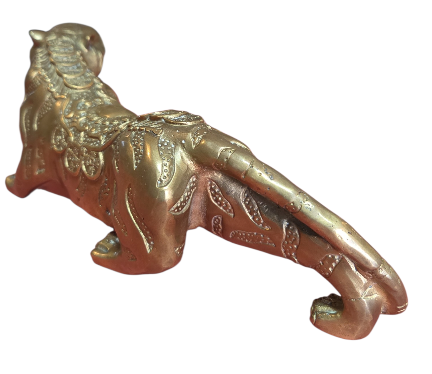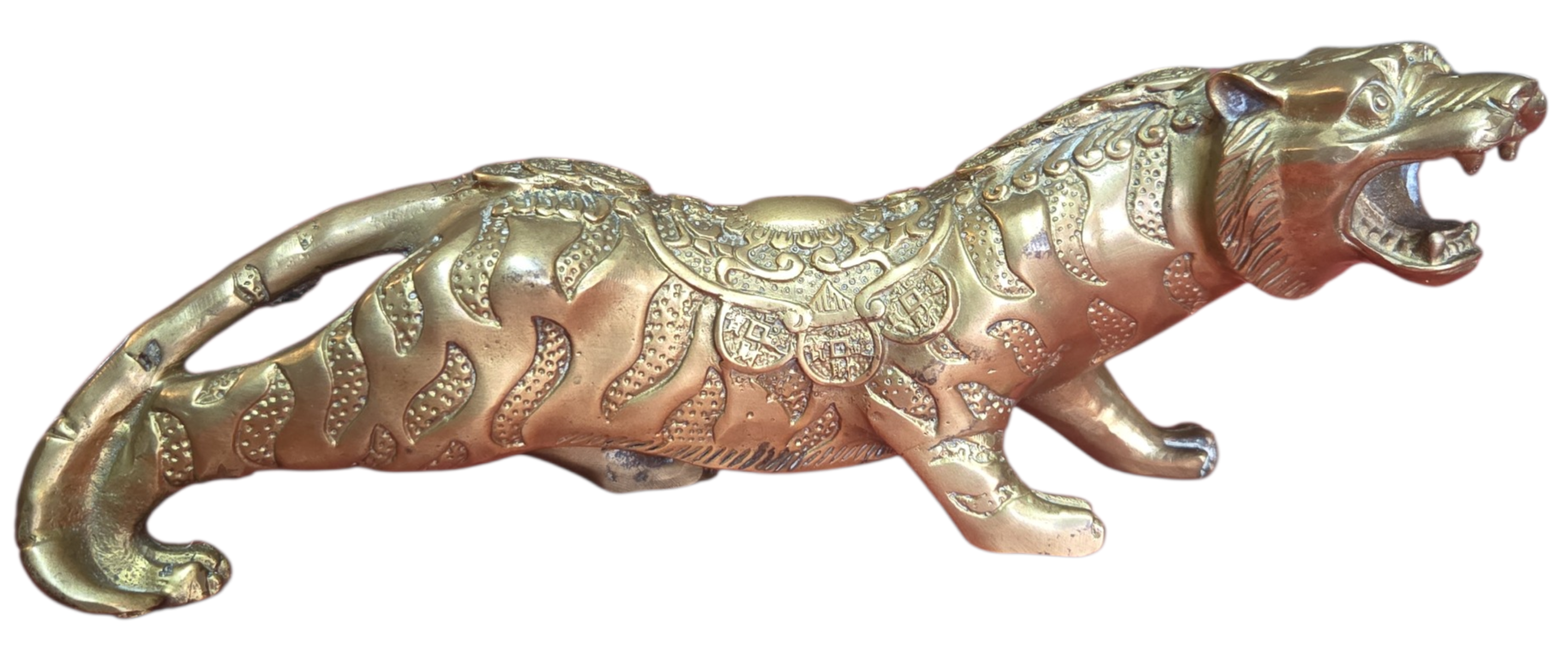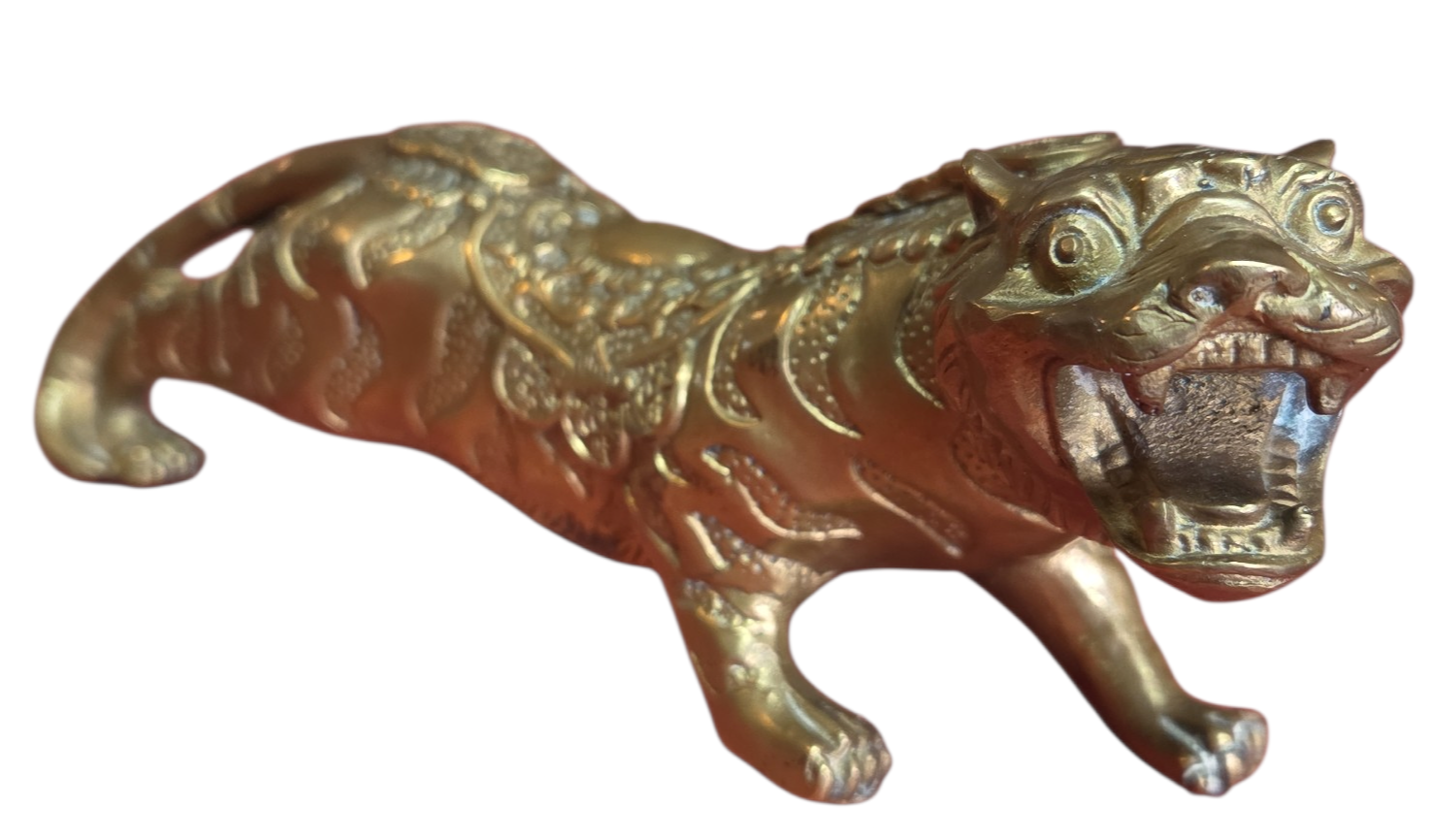 Esta é uma peça imponente e rica em detalhes, ideal para colecionadores e amantes de decoração clássica. A escultura apresenta um tigre em postura de ataque ou rugido, capturando a força e o dinamismo do animal com grande expressividade.