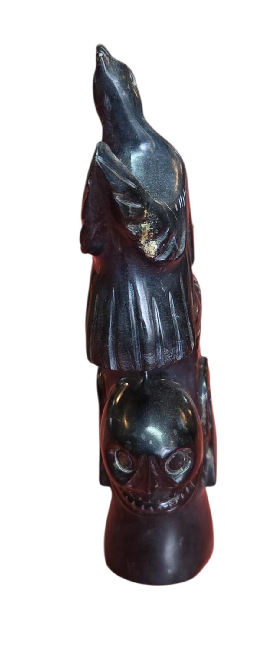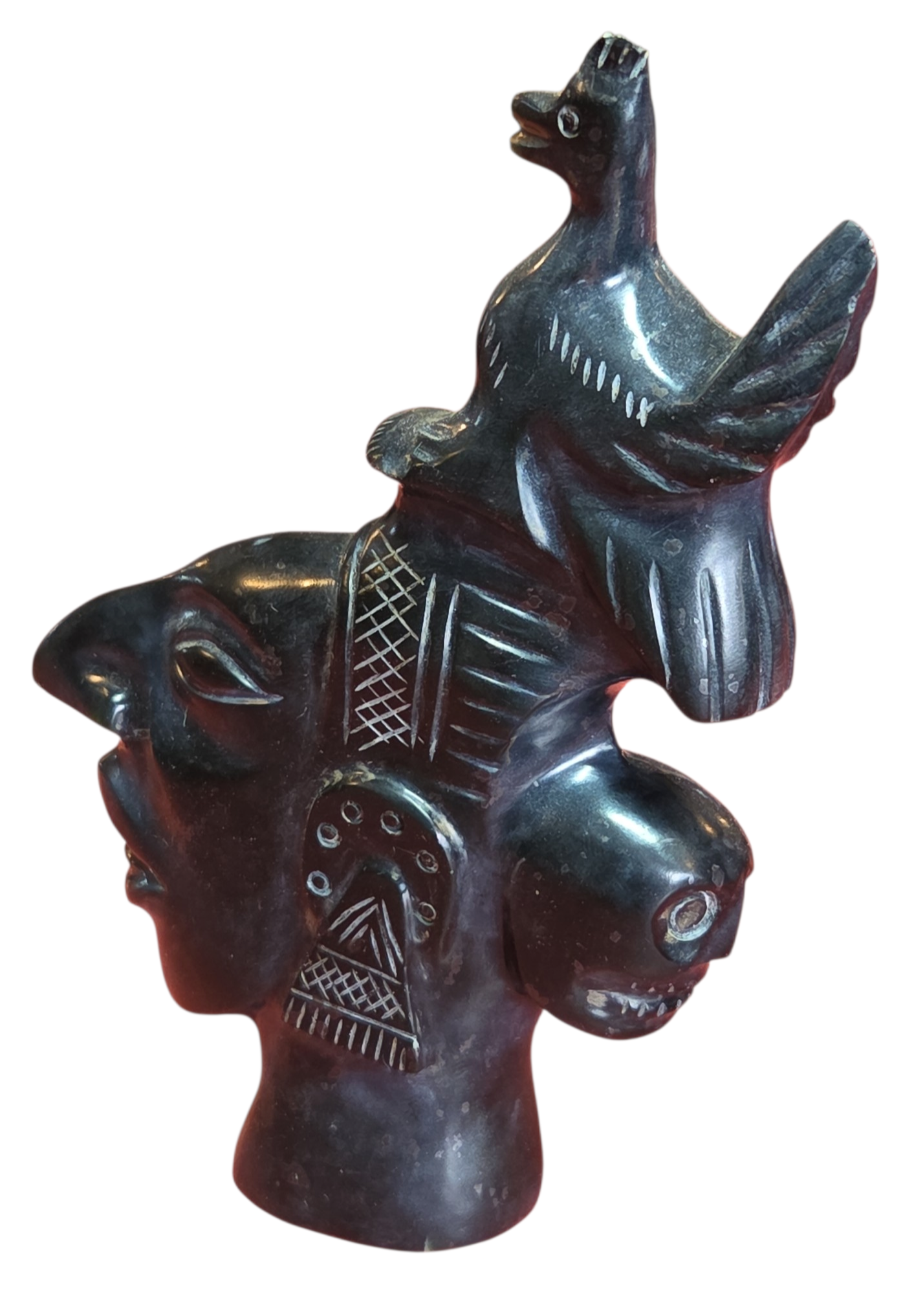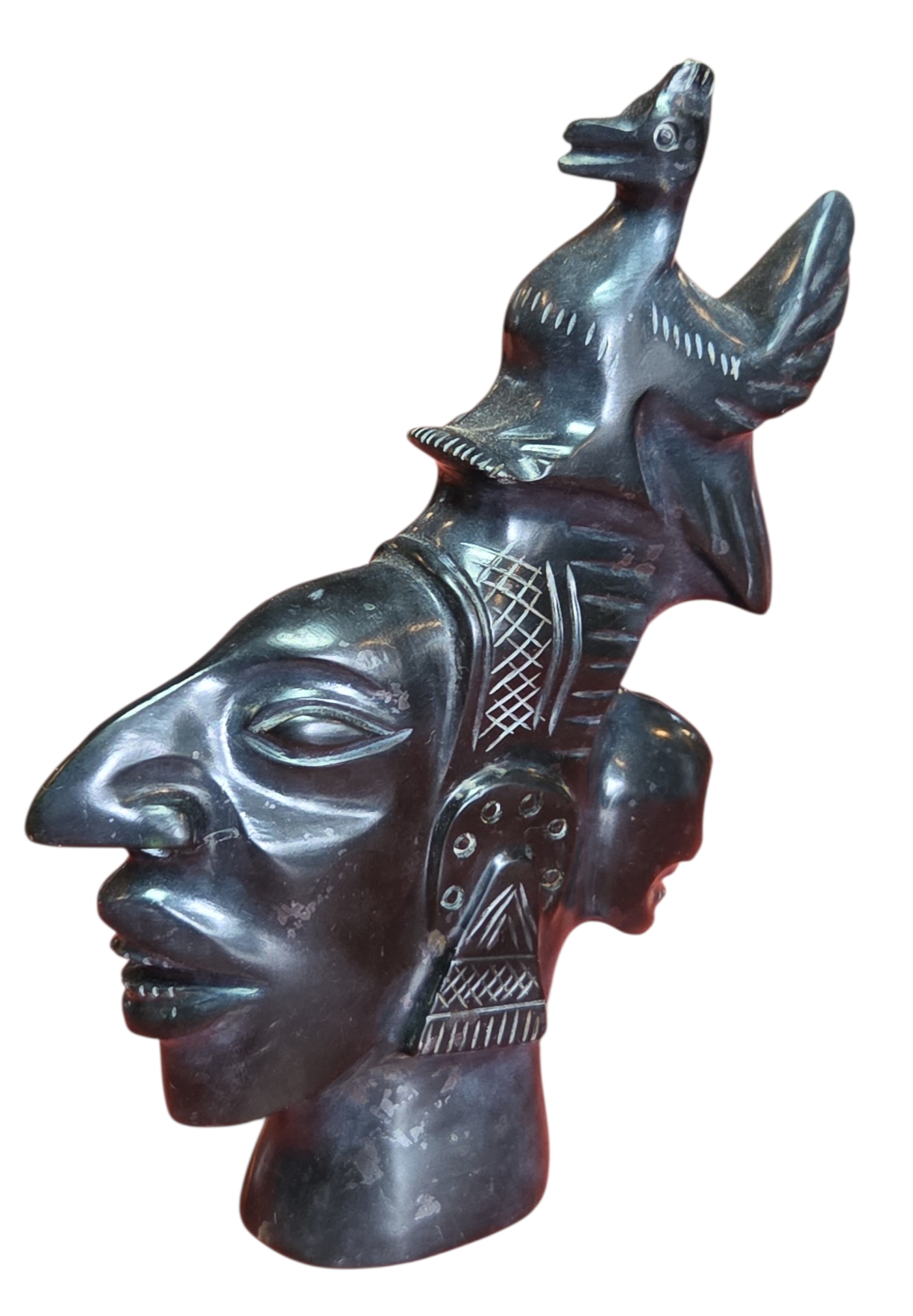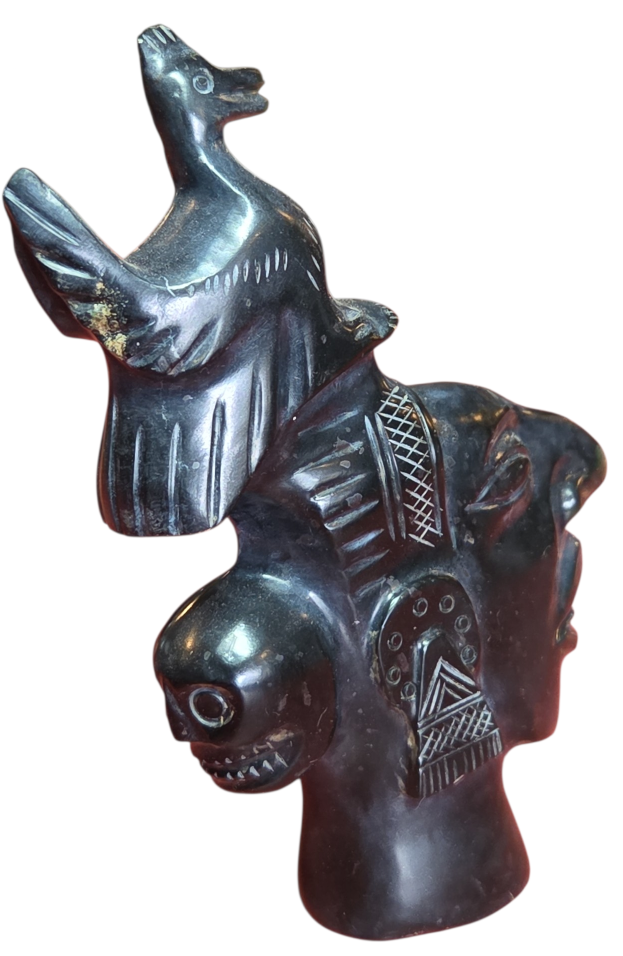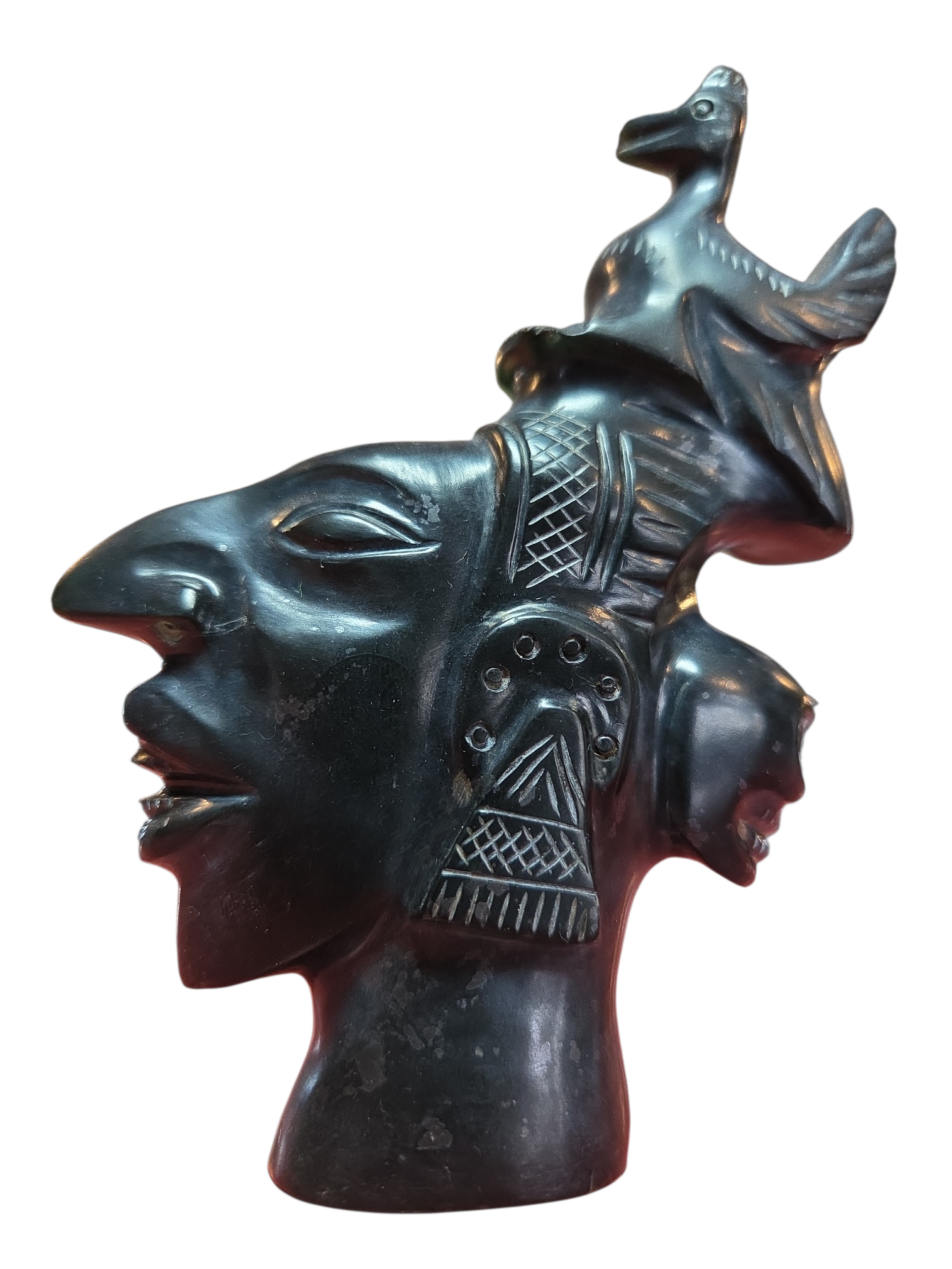 Magnífica escultura entalhada em ônix negro (pedra vulcânica polida), apresentando uma composição rica em simbolismo e detalhes mitológicos. A peça exibe uma figura principal de perfil com traços marcantes, adornada por uma figura aviária (pássaro) no topo e uma face secundária na parte posterior, evocando a dualidade característica das artes Maia e Asteca.