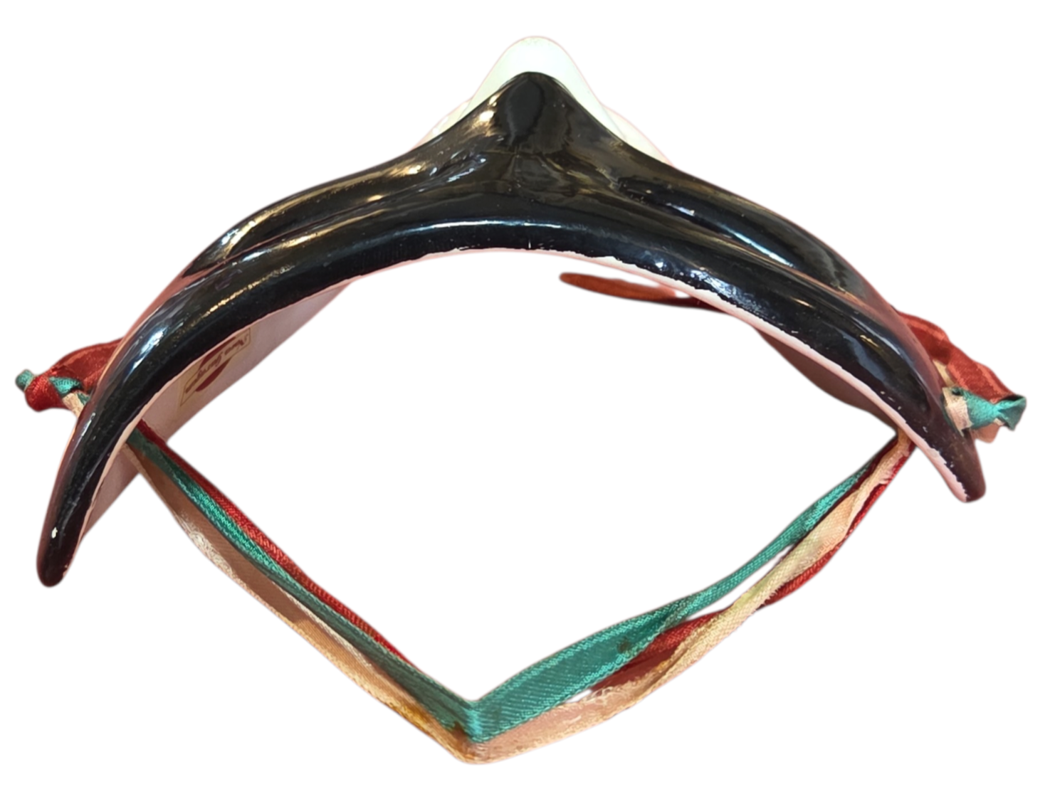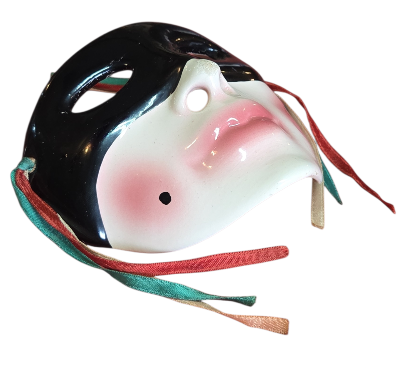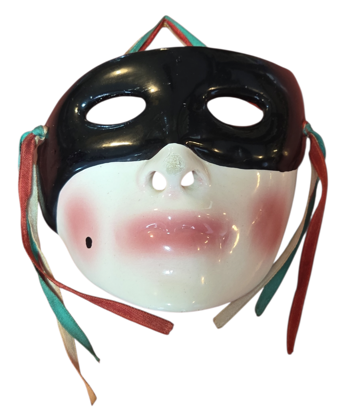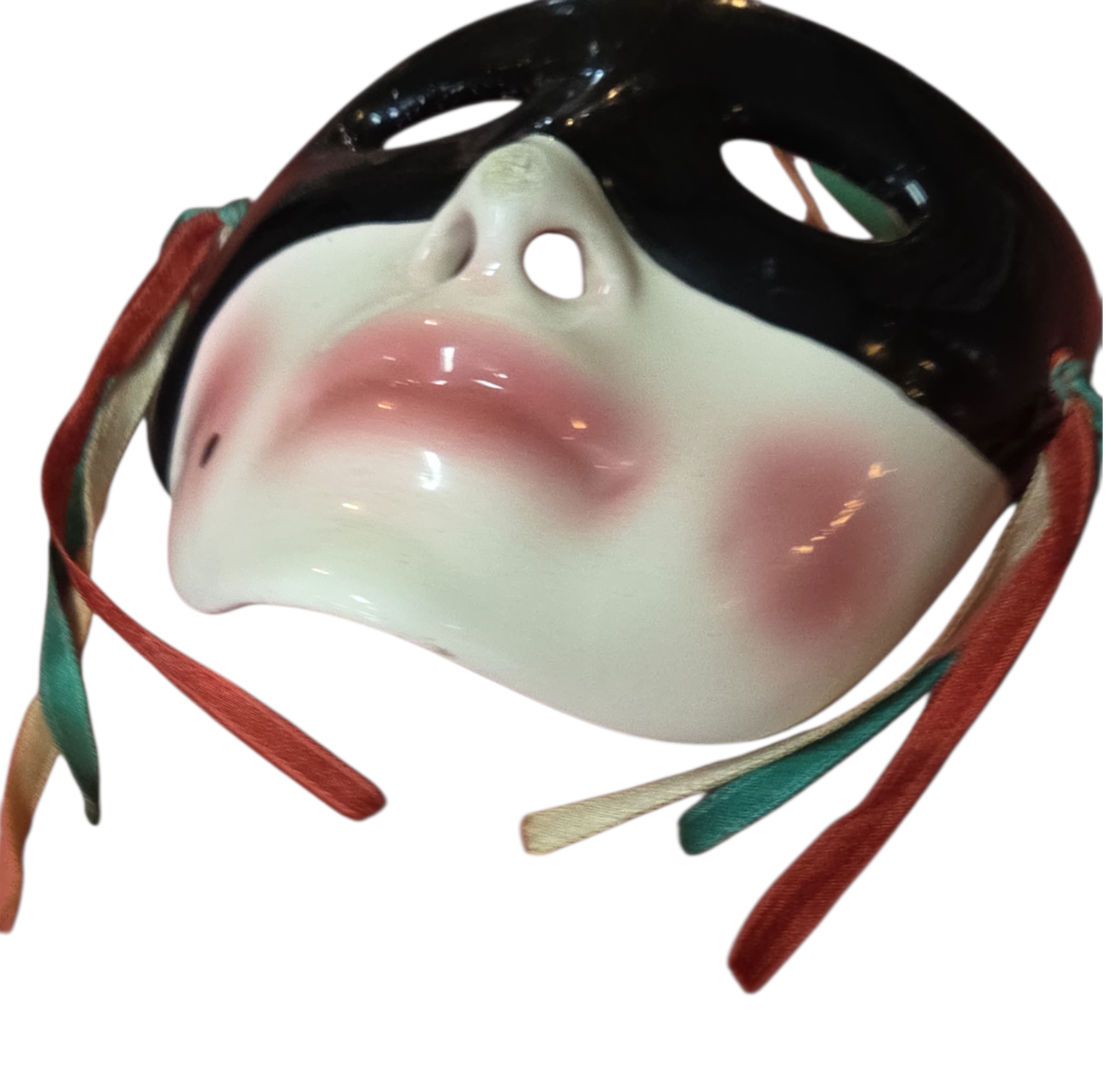 Esta belíssima máscara decorativa captura a essência do teatro clássico italiano. Feita em porcelana de alto brilho, a peça apresenta o design icônico da "Colombina", cobrindo parcialmente o rosto para um visual enigmático e sofisticado.