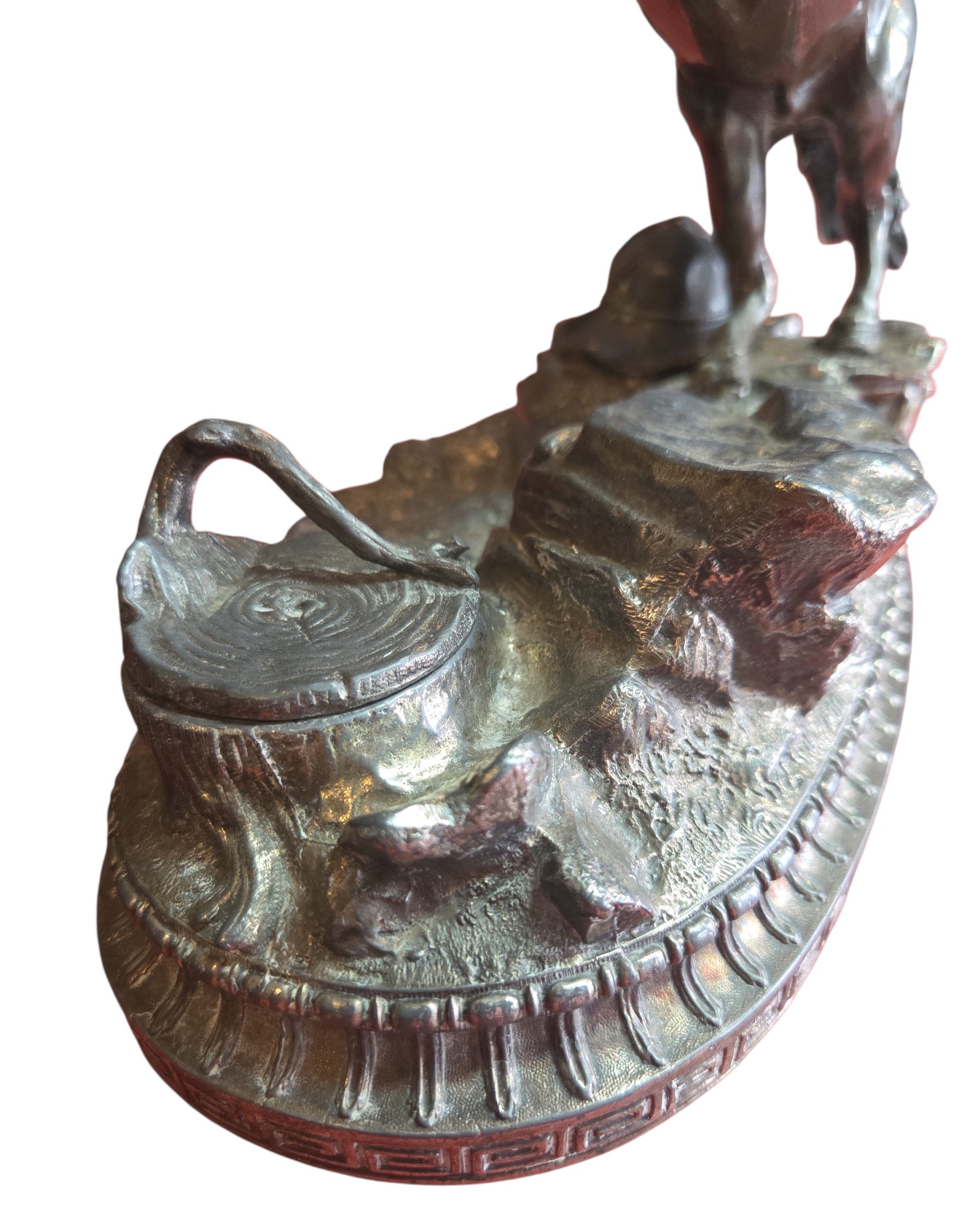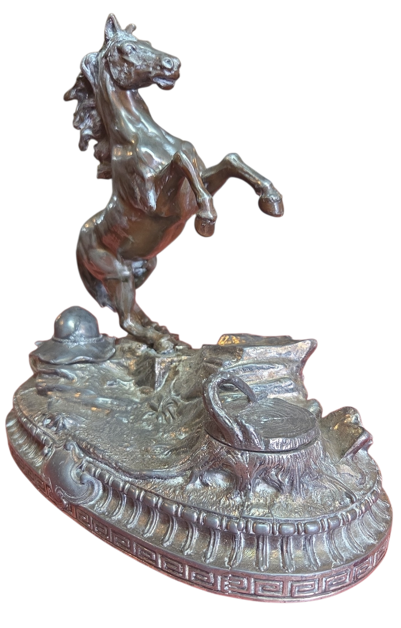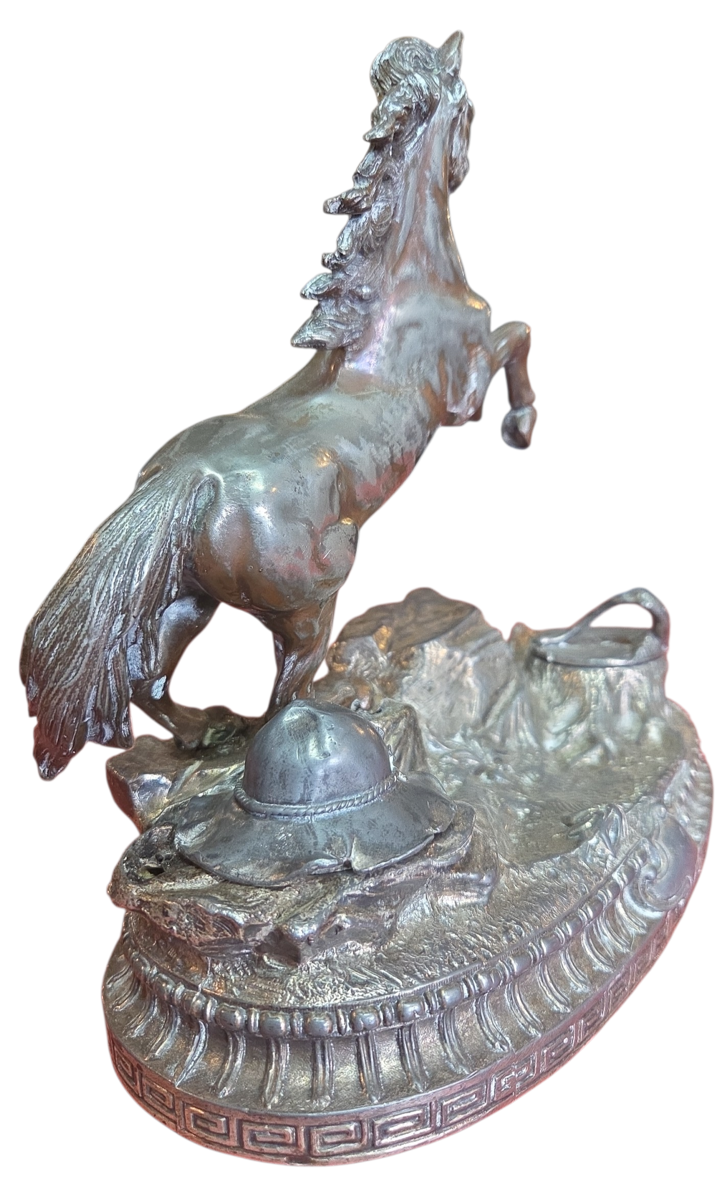 Uma peça rara que une funcionalidade e arte escultural. Este tinteiro de mesa é encimado por uma figura de cavalo meticulosamente detalhada, fundida com o prestigiado banho de Prata 90, que confere à peça um brilho acetinado e uma durabilidade excepcional. A base robusta acomoda o reservatório de tinta, transformando um objeto utilitário em um símbolo de status e erudição.