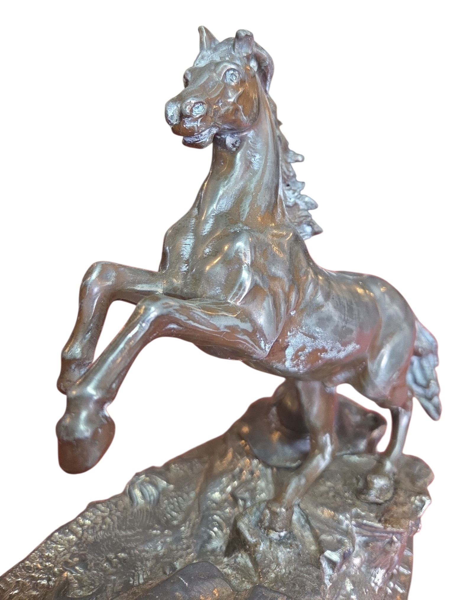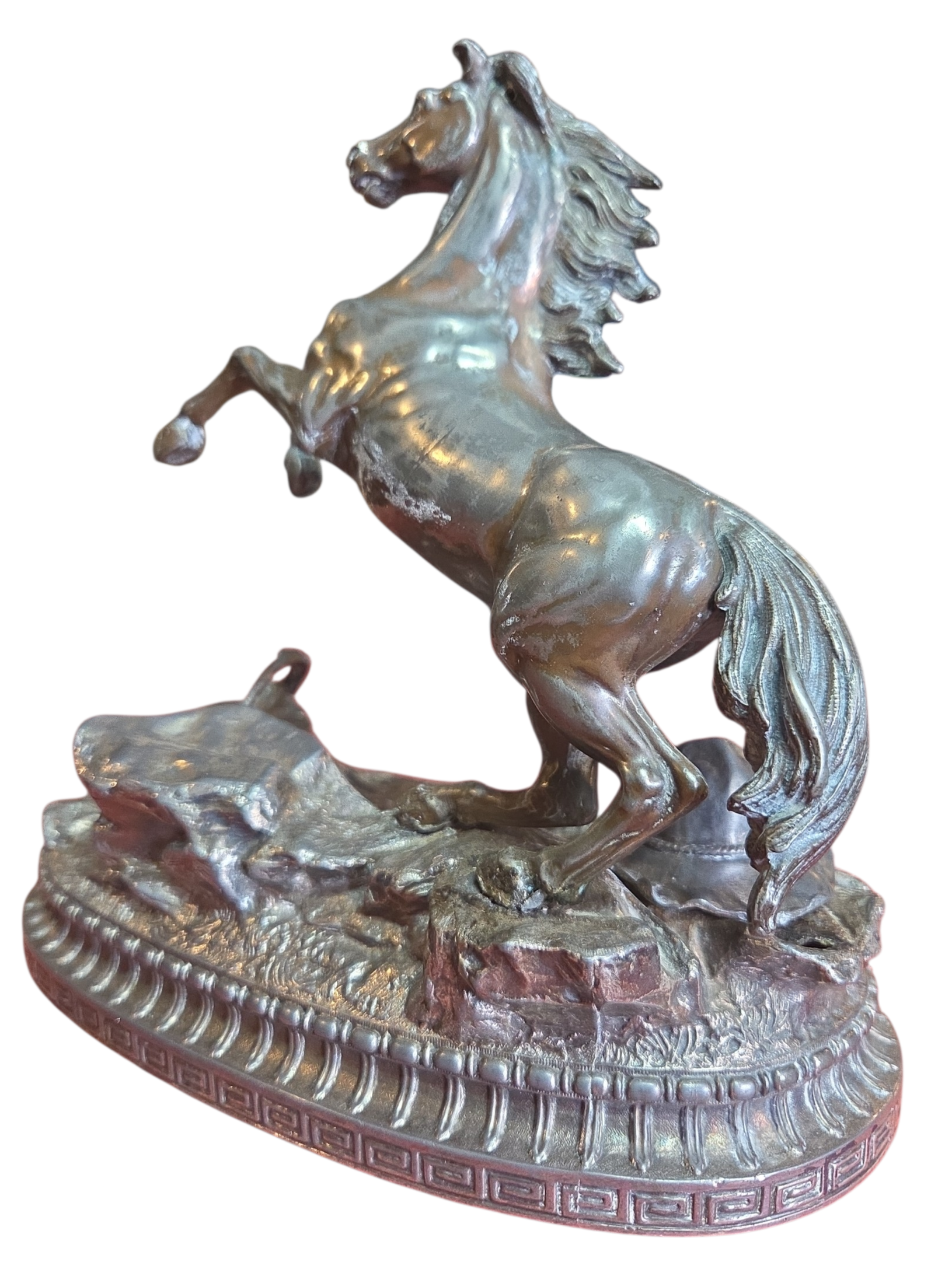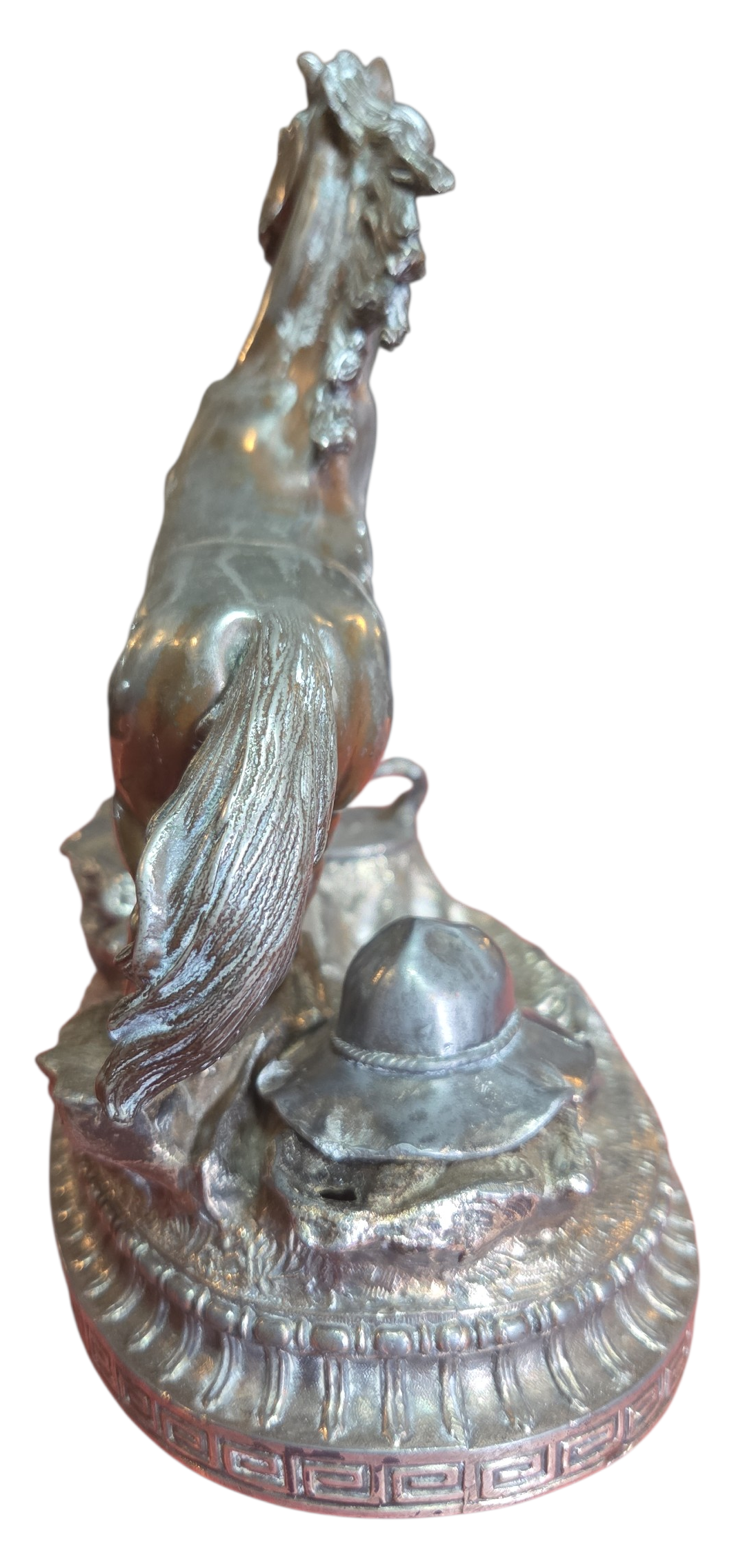 Uma peça rara que une funcionalidade e arte escultural. Este tinteiro de mesa é encimado por uma figura de cavalo meticulosamente detalhada, fundida com o prestigiado banho de Prata 90, que confere à peça um brilho acetinado e uma durabilidade excepcional. A base robusta acomoda o reservatório de tinta, transformando um objeto utilitário em um símbolo de status e erudição.