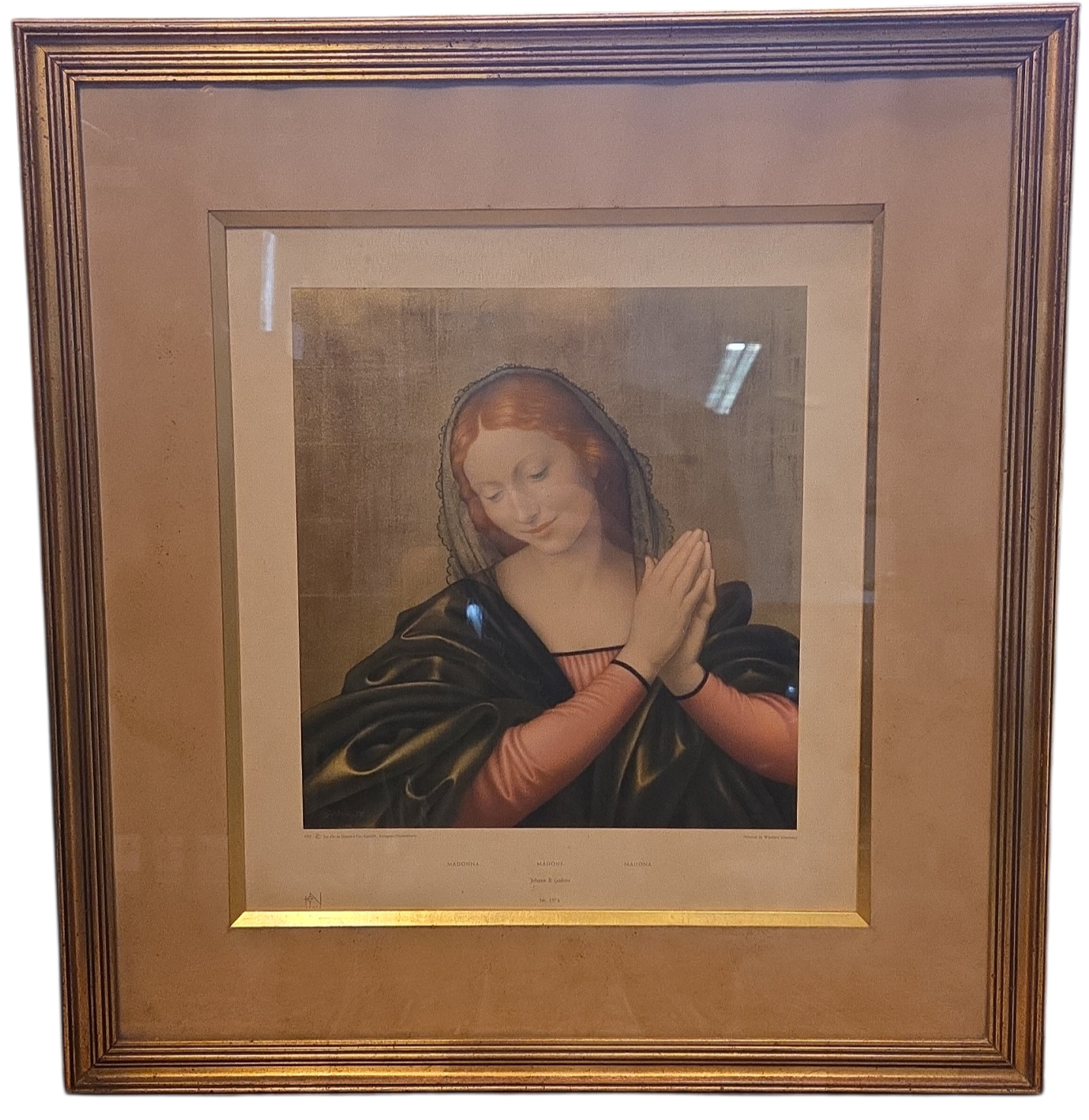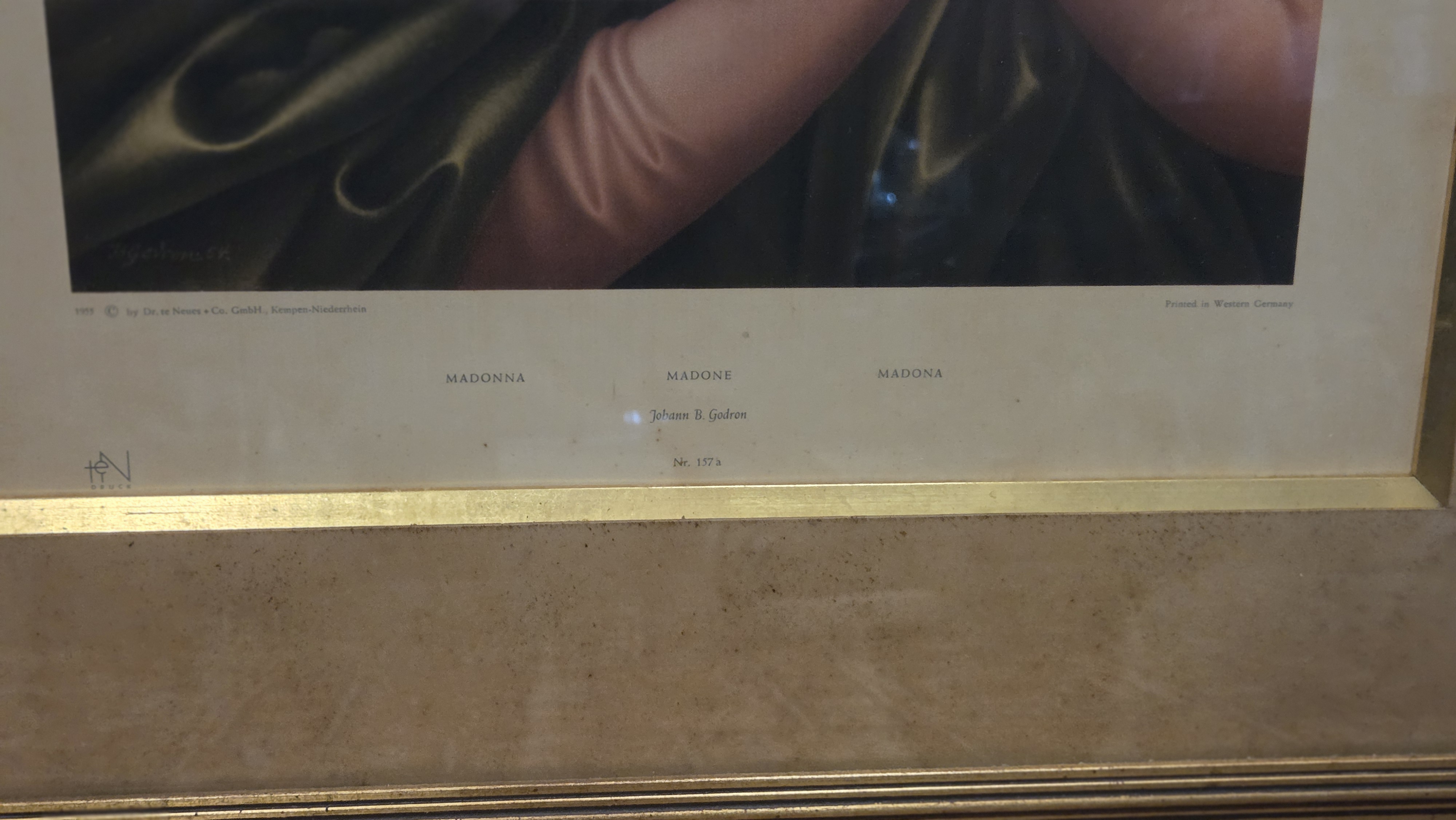 Uma peça de colecionador que une fé e história. Esta gravura da Madonna (Virgem Maria), datada de 1955, é um exemplar autêntico da produção artística da Alemanha Ocidental, período em que a manufatura de impressões litográficas e gravuras alemãs era referência mundial em qualidade de cor e papel.