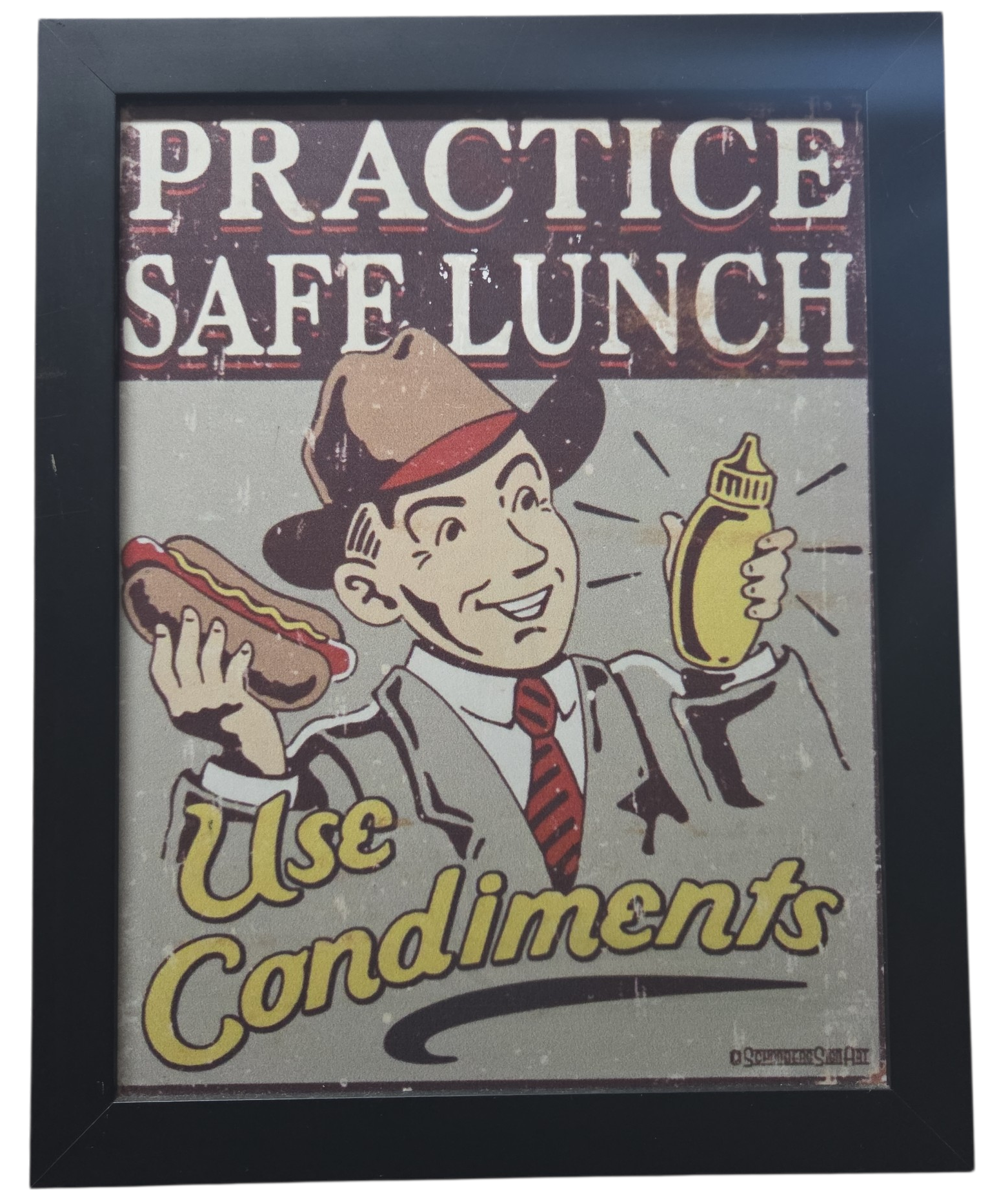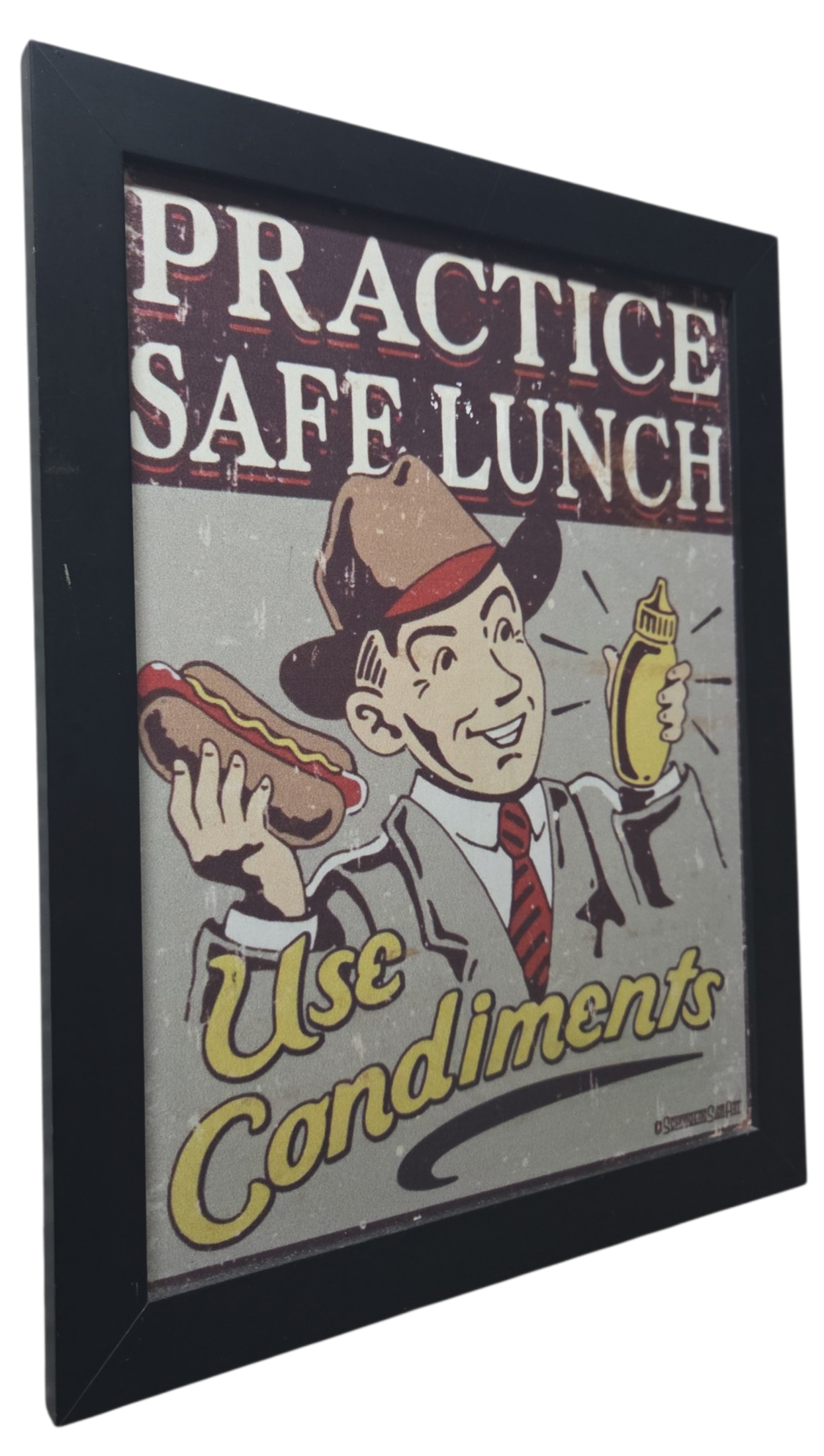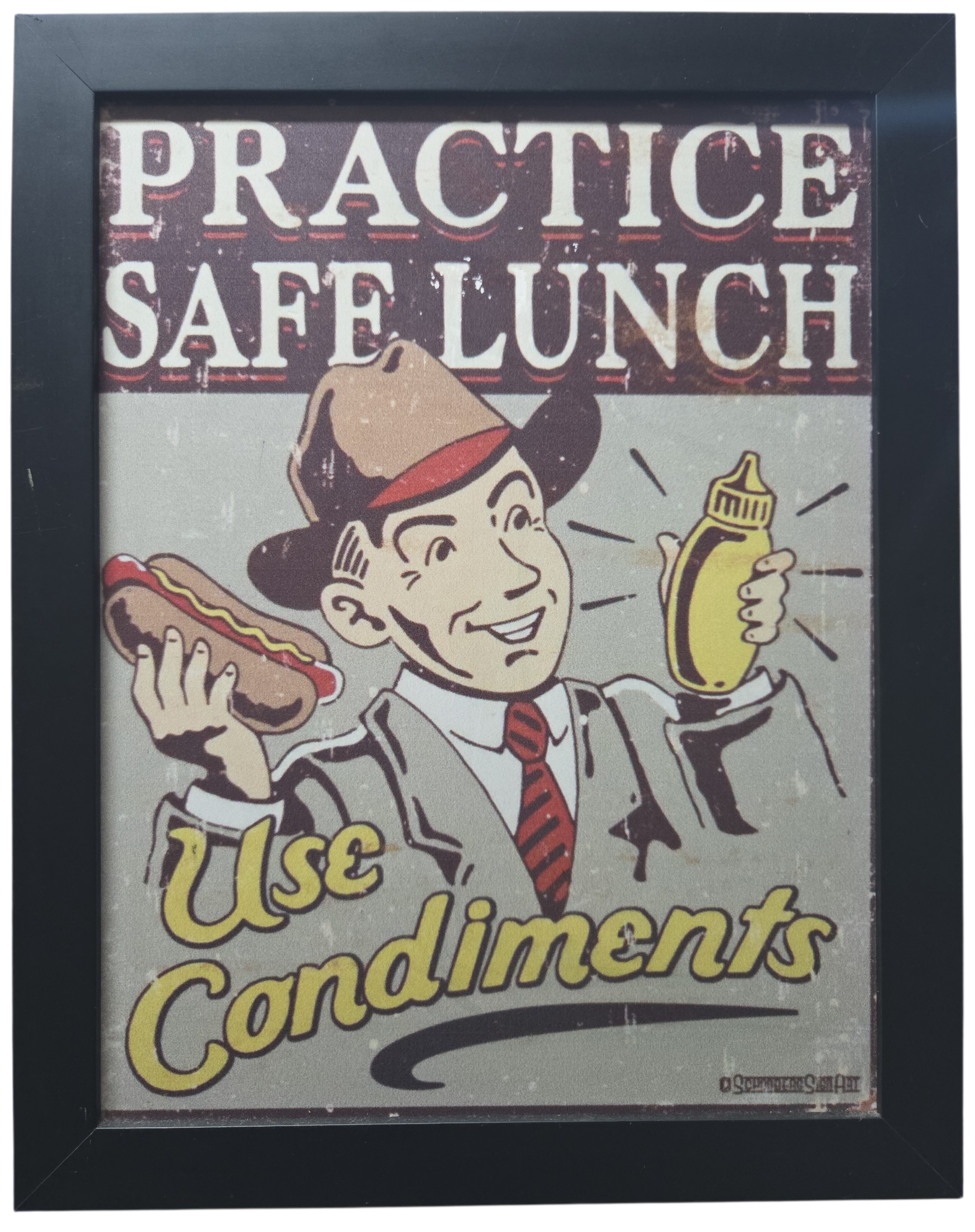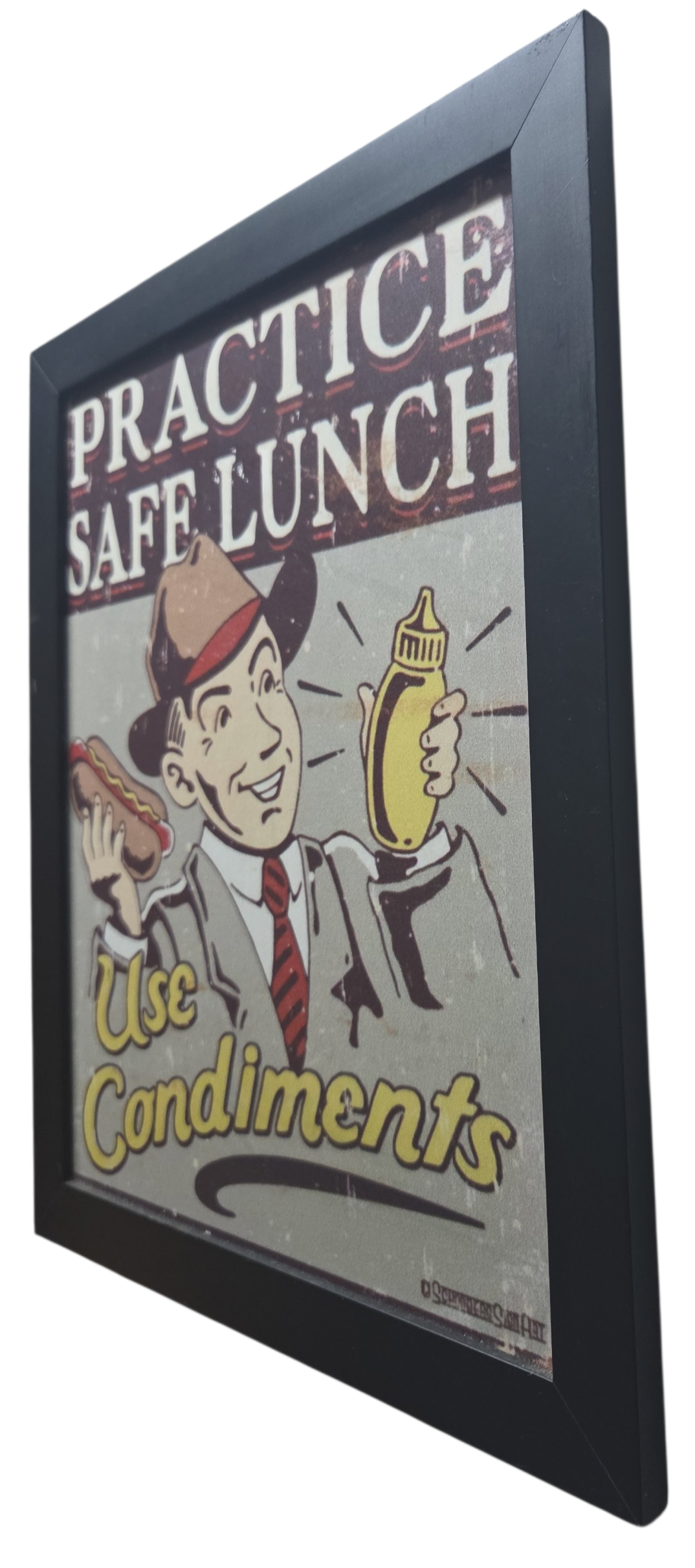 Dê um toque de humor retrô e personalidade ao seu ambiente com este quadro decorativo de estilo vintage. A peça apresenta uma ilustração clássica inspirada nas publicidades dos anos 50, com um trocadilho inteligente e divertido.