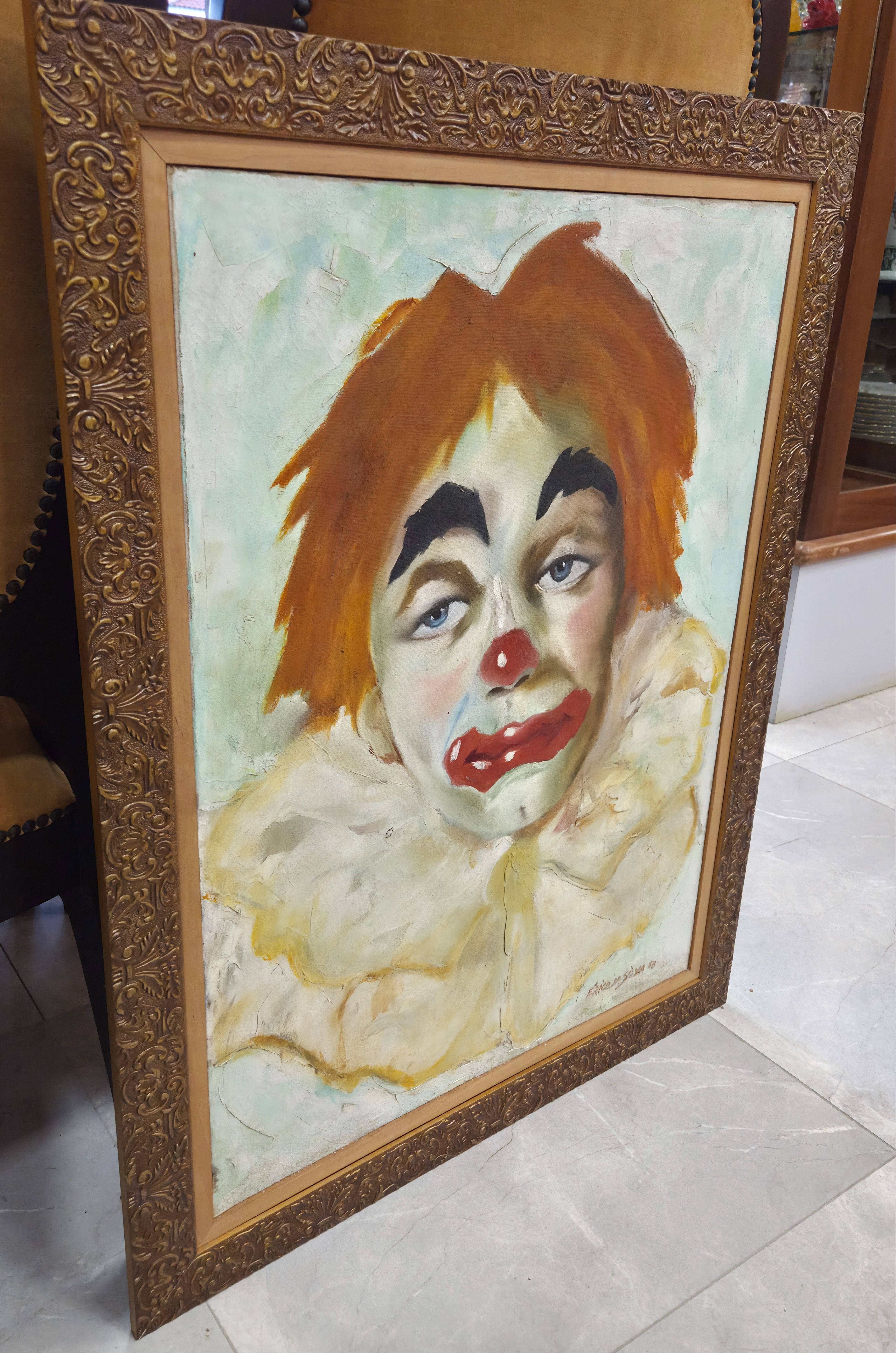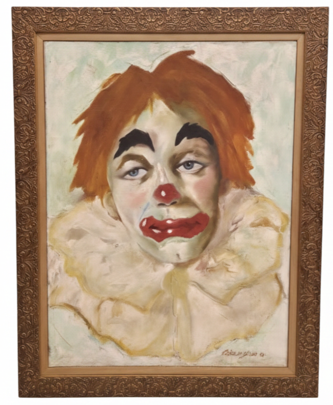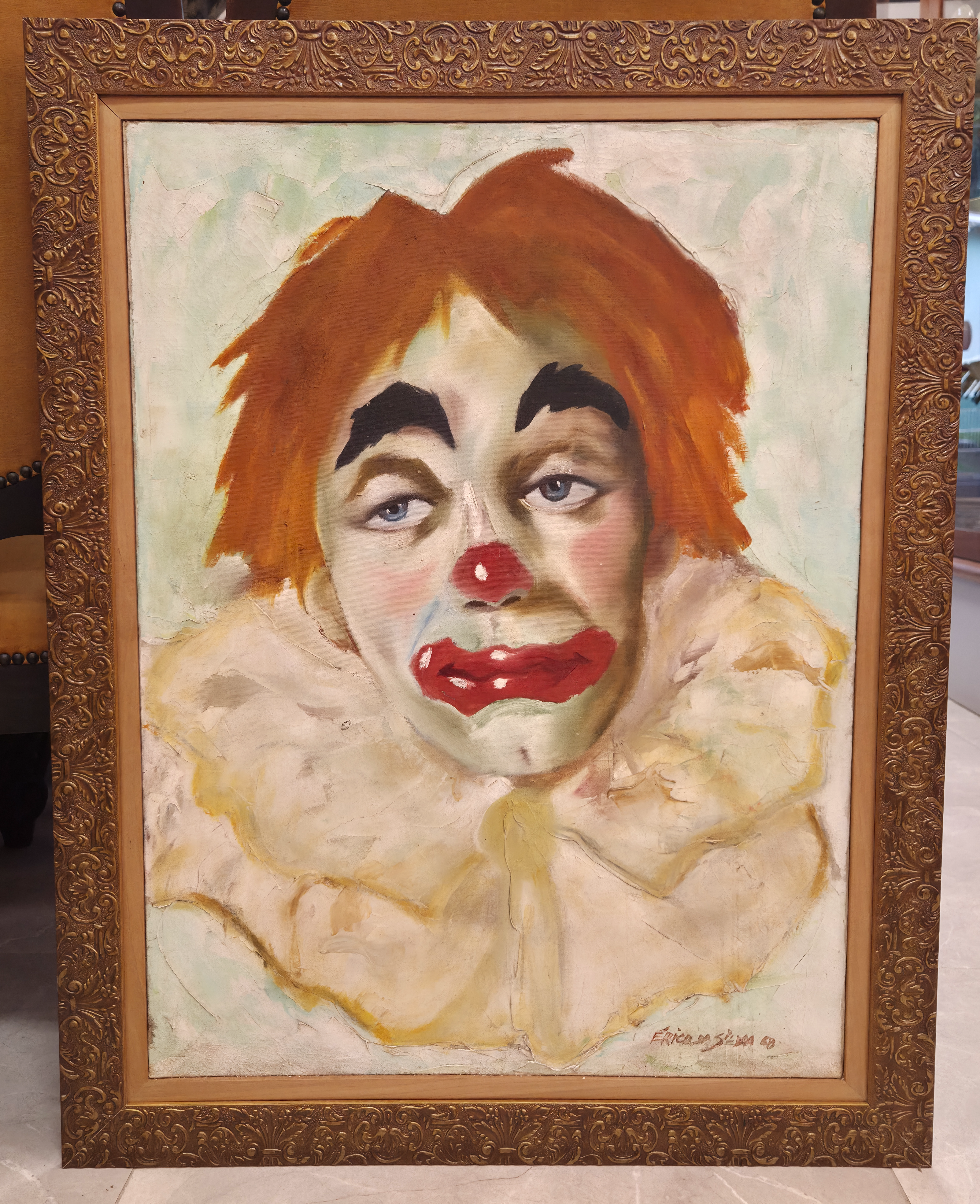 Belíssimo quadro assinado por Erico da Silva, representando um palhaço com expressão melancólica e profunda. A obra possui uma iluminação suave e tons terrosos que conferem sobriedade e elegância ao ambiente. Acompanha uma moldura imponente com detalhes ornamentais em dourado, pronta para decorar salas, escritórios ou bibliotecas.