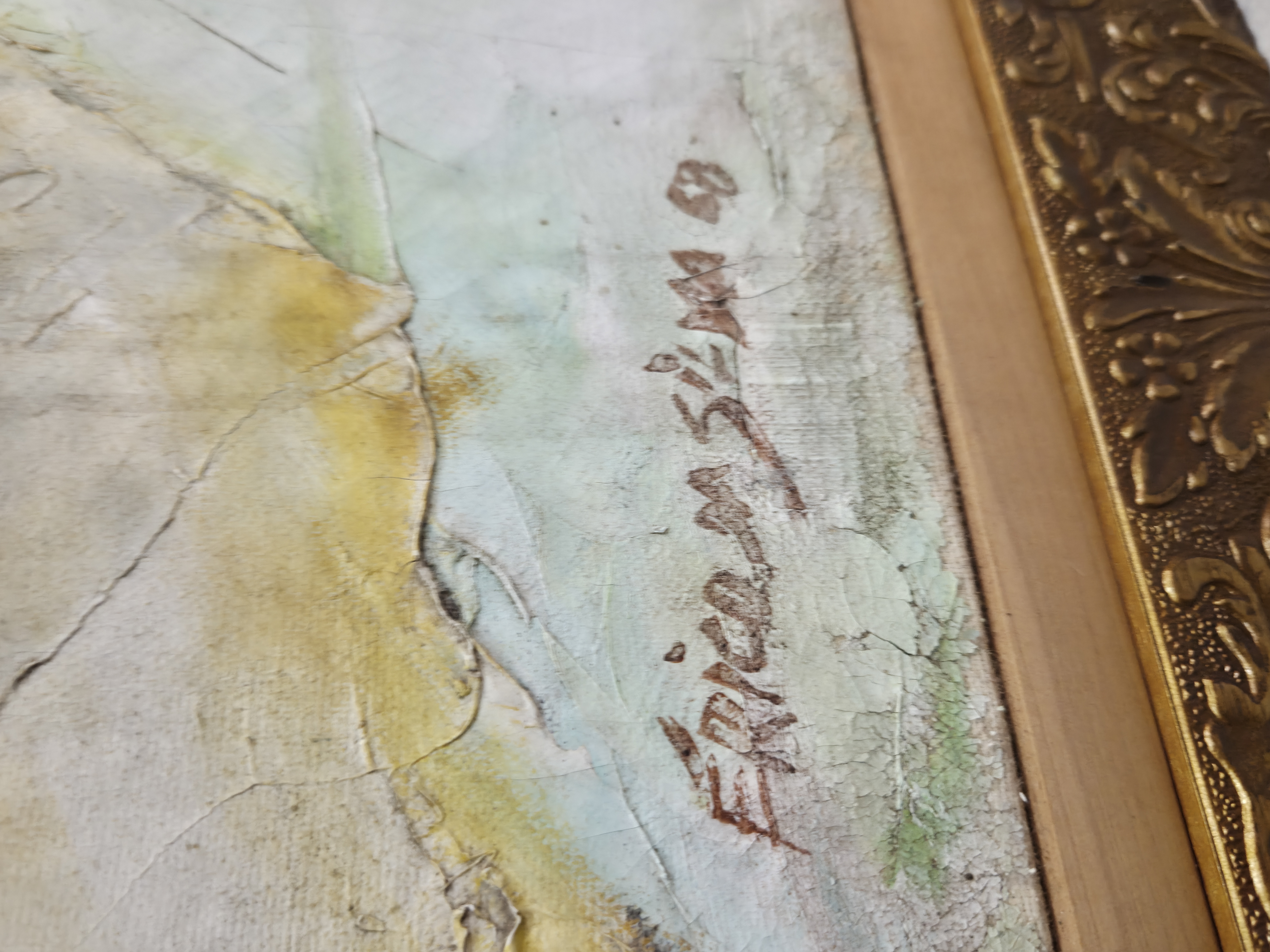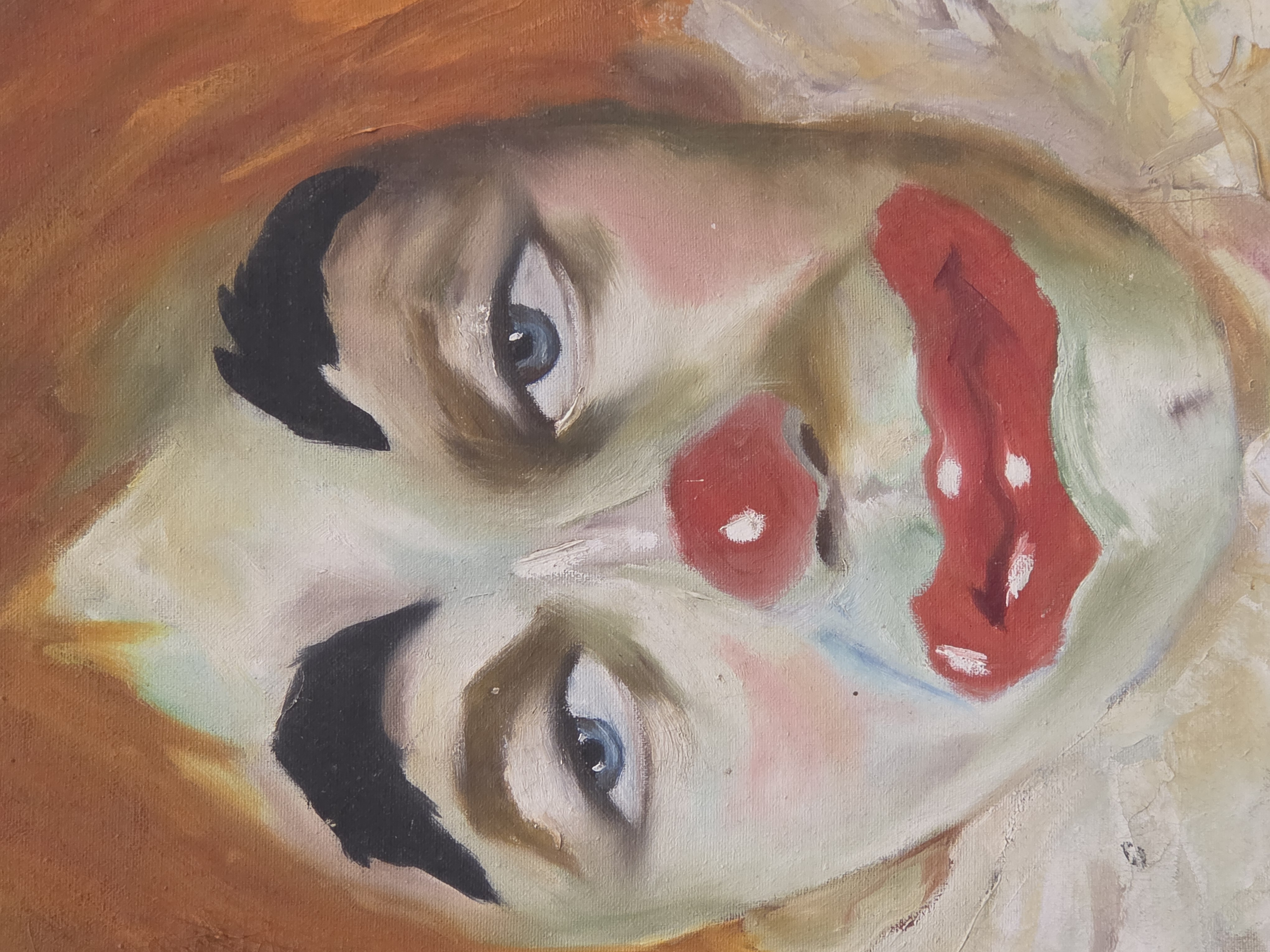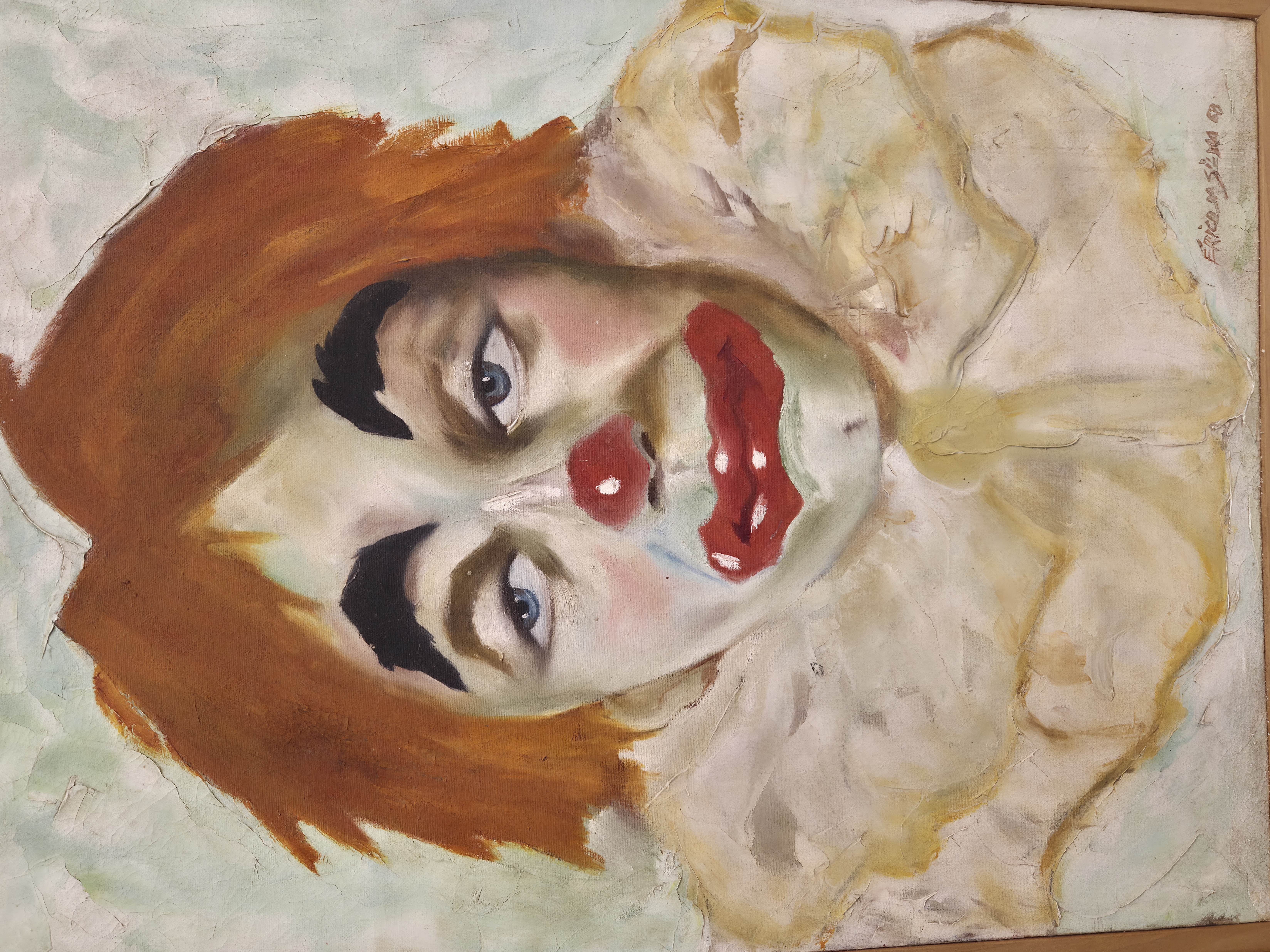 Belíssimo quadro assinado por Erico da Silva, representando um palhaço com expressão melancólica e profunda. A obra possui uma iluminação suave e tons terrosos que conferem sobriedade e elegância ao ambiente. Acompanha uma moldura imponente com detalhes ornamentais em dourado, pronta para decorar salas, escritórios ou bibliotecas.