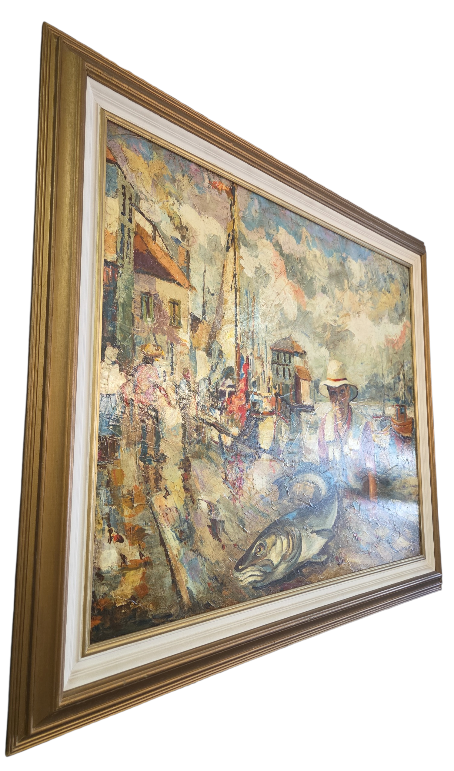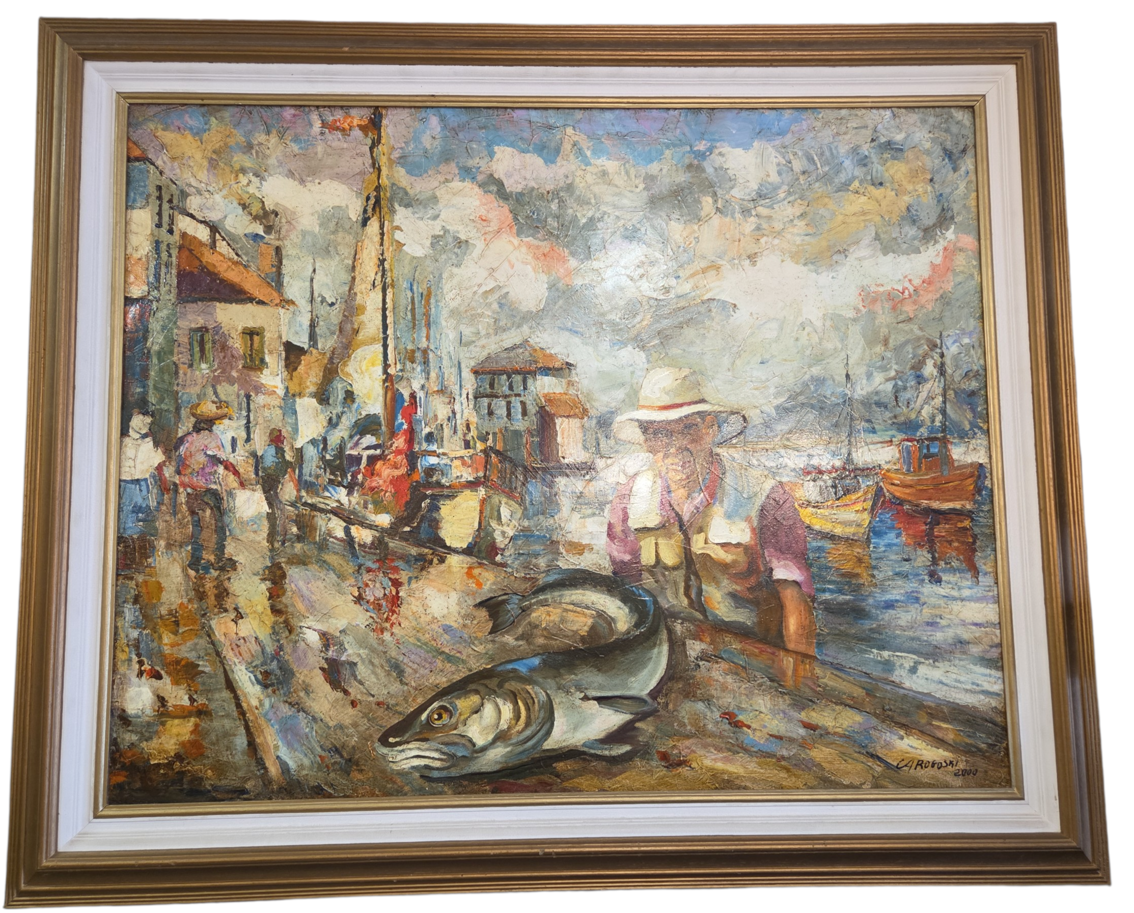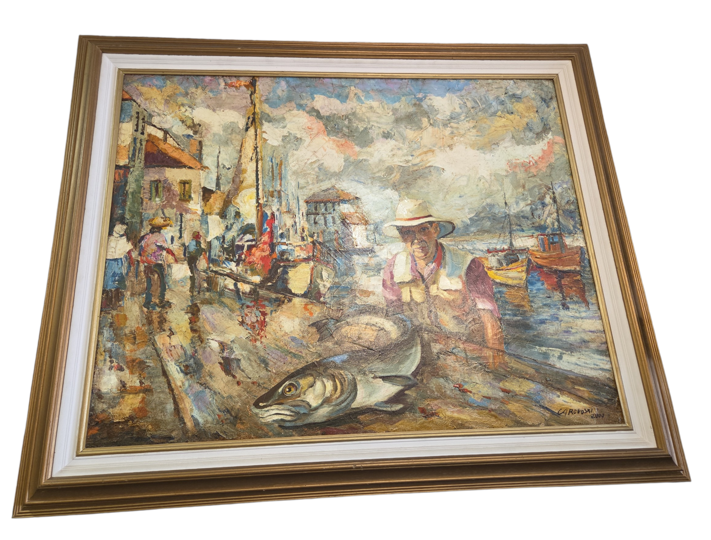 Rara e belíssima obra de arte original, executada na técnica óleo sobre tela pelo renomado artista Rogoski. A pintura retrata com maestria a figura solitária e resiliente do pescador, utilizando uma paleta de cores que harmoniza perfeitamente a luz e as texturas da vida no mar. A pincelada característica do autor confere profundidade e realismo à cena. Uma peça indispensável para colecionadores e apreciadores de arte figurativa clássica.