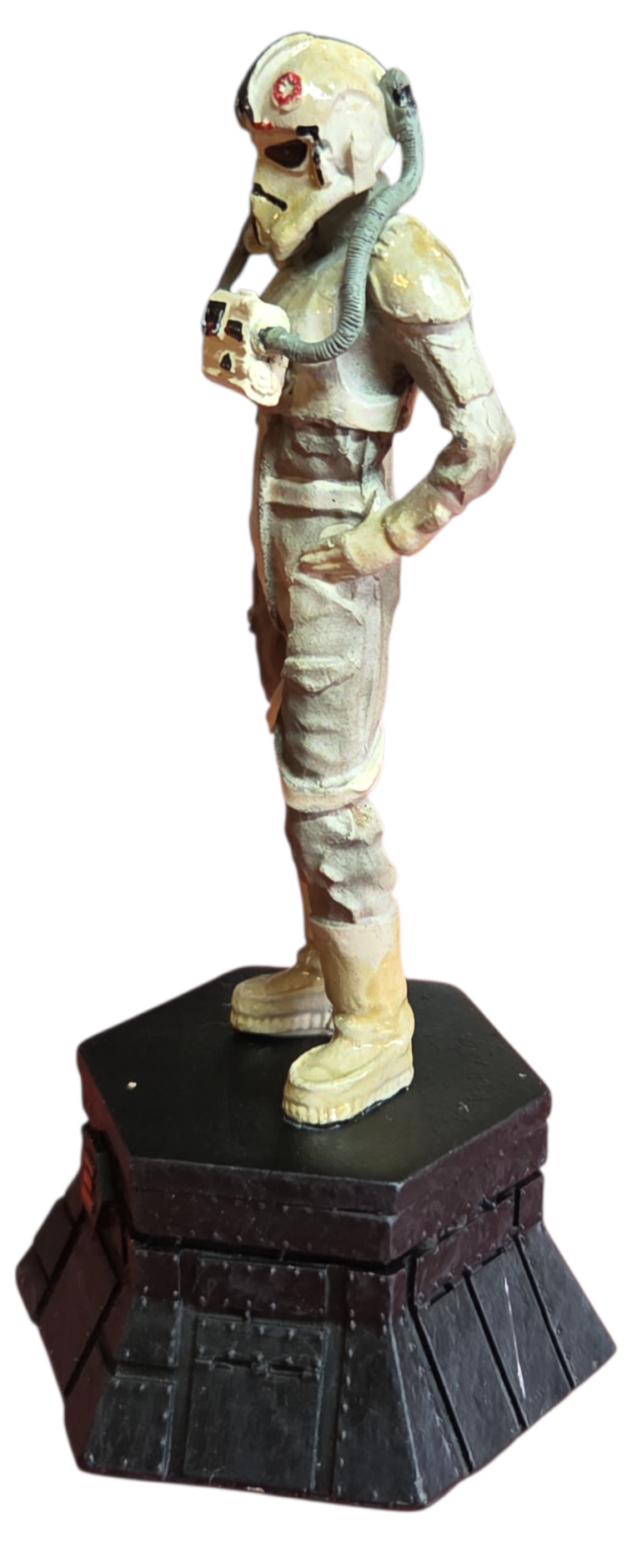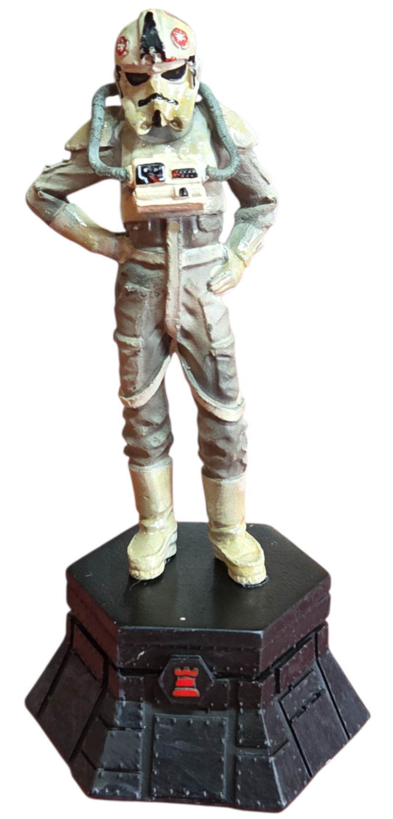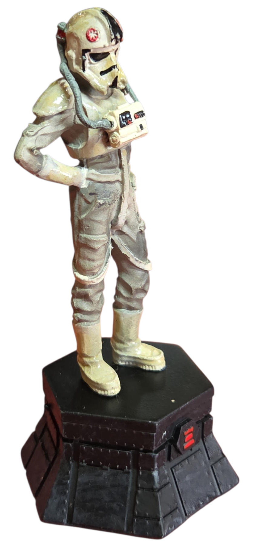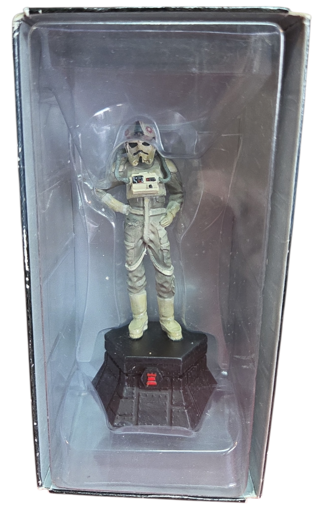 Esta peça faz parte da prestigiada coleção oficial de xadrez Star Wars, representando a Torre Negra (Black Rook). A figura detalha com precisão o uniforme e o capacete característico dos pilotos imperiais que operam os transportes blindados em planetas como Hoth.