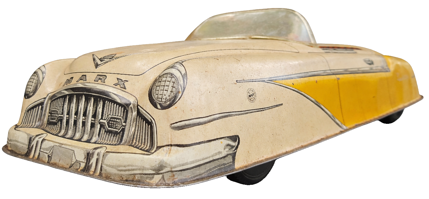Autêntico carrinho americano da renomada fabricante Marx, produzido entre as décadas de 1940 e 1950. Peça original de época, representando fielmente o design e o charme dos brinquedos metálicos do pós-guerra.