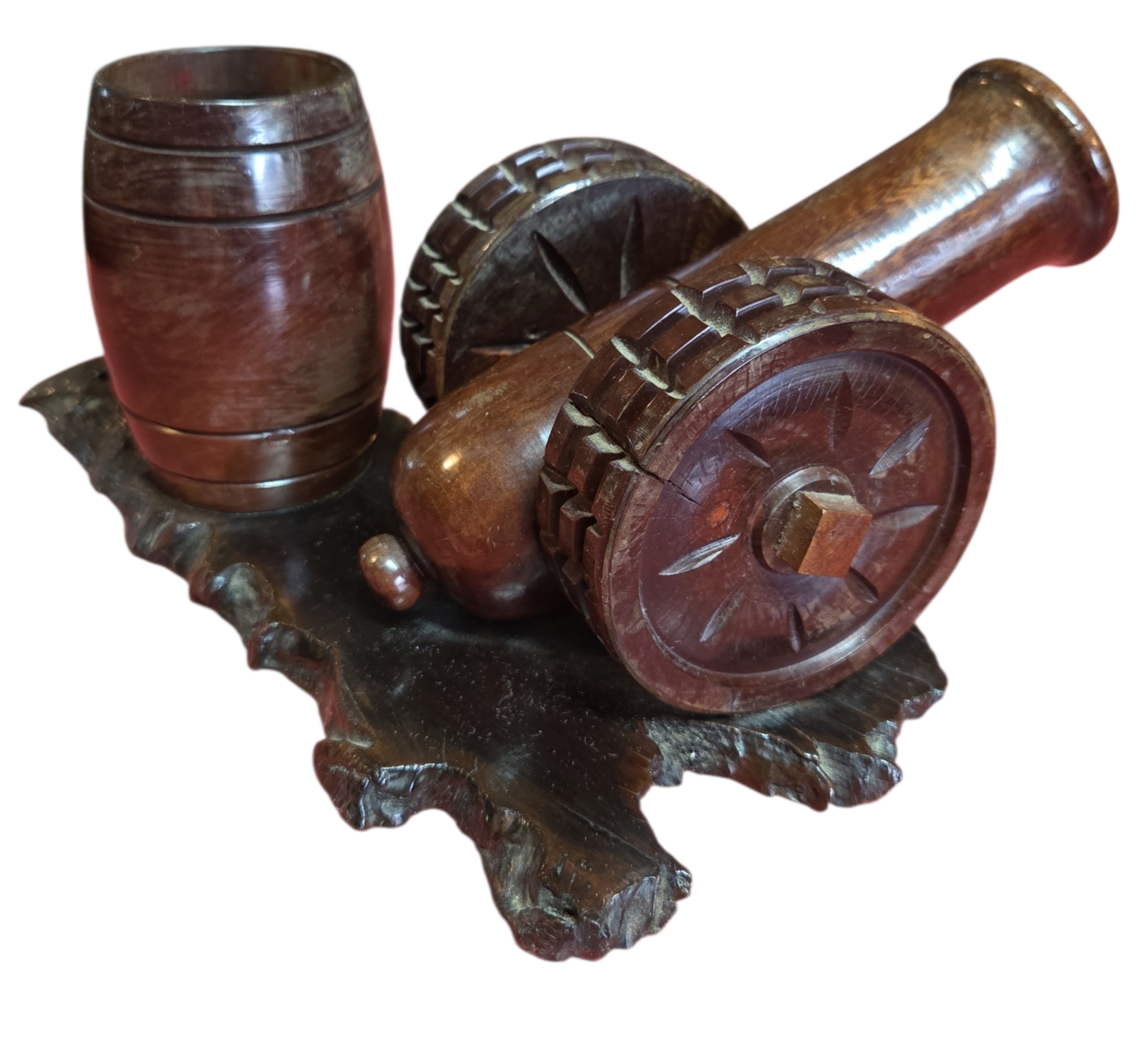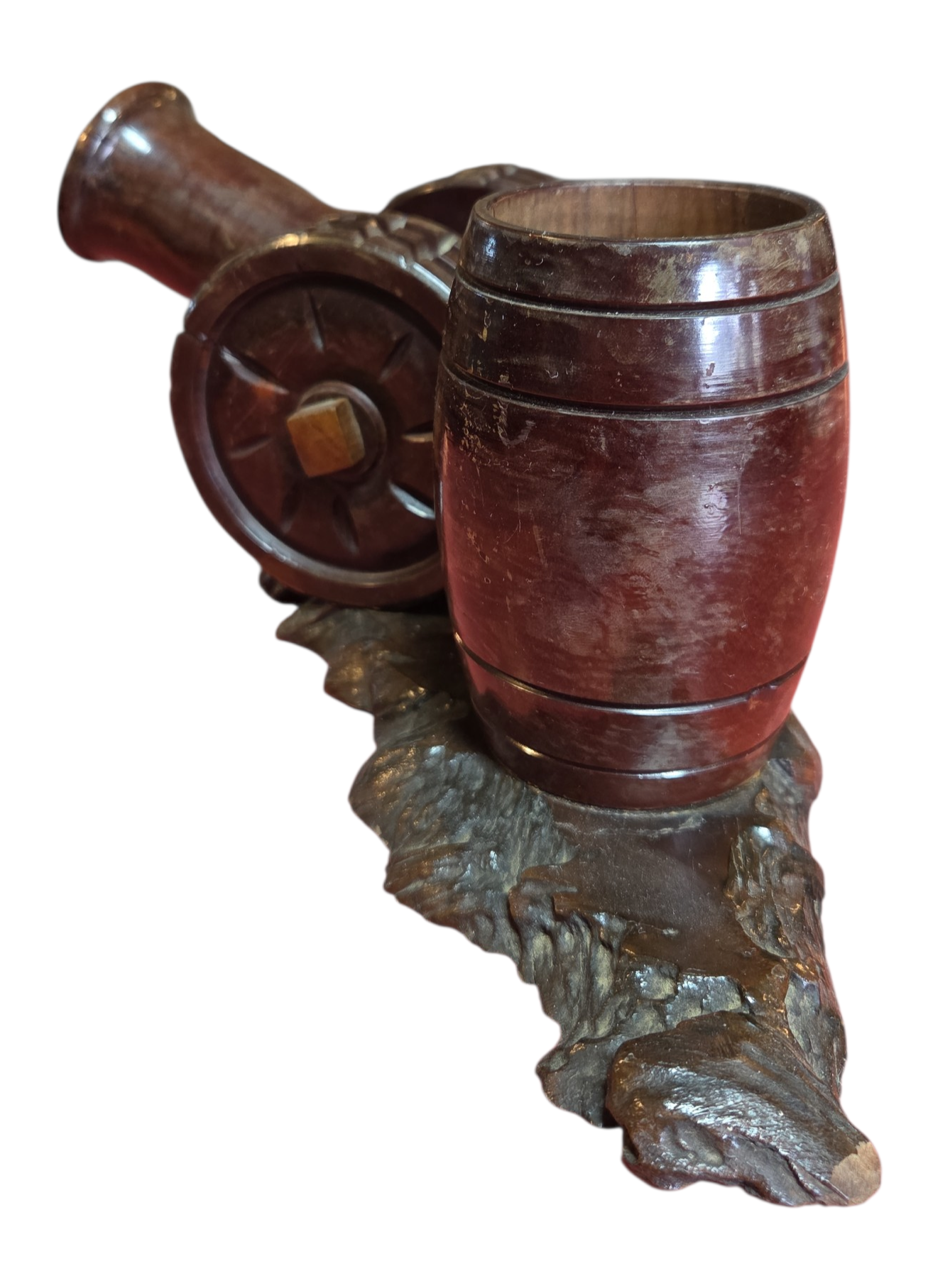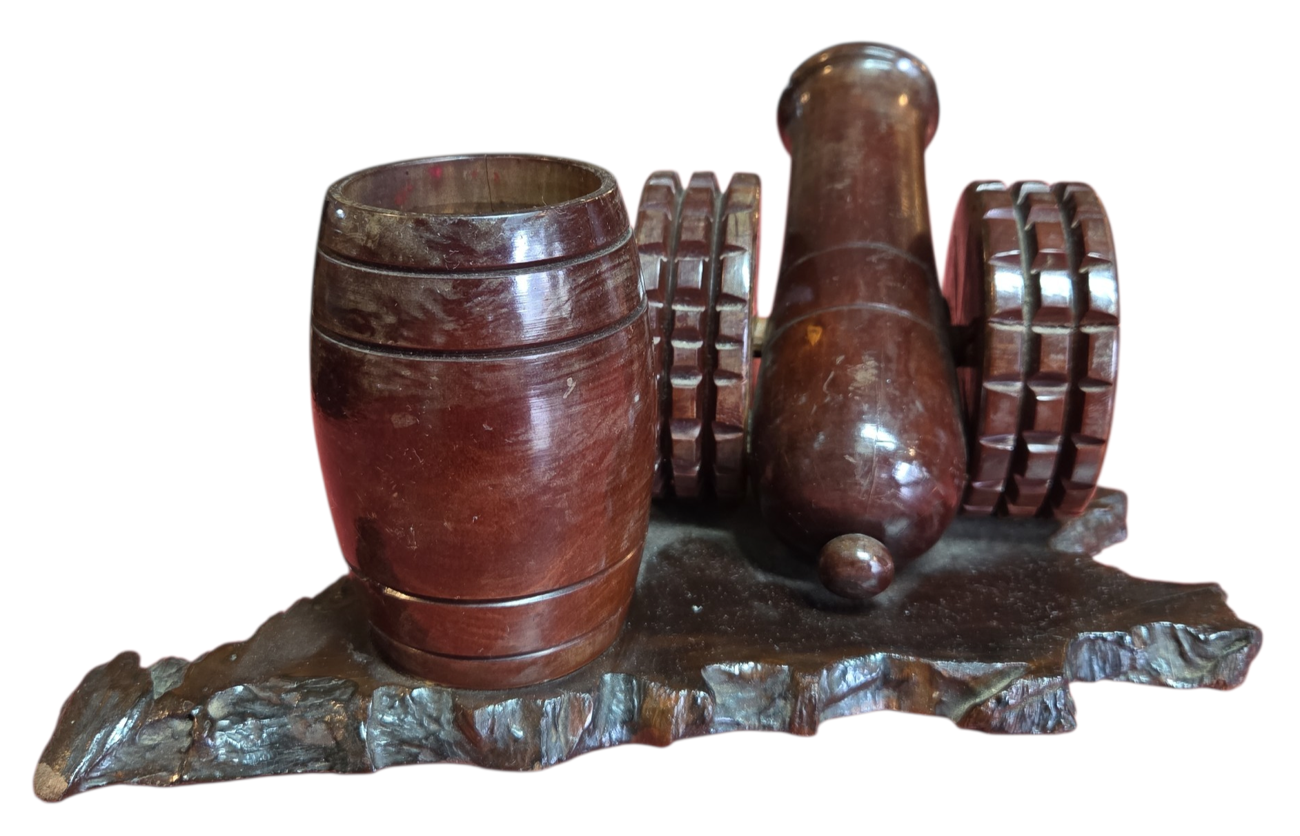 Apresentamos uma distinta peça de coleção e decoração, rica em detalhes e executada com técnicas tradicionais de marcenaria. Este conjunto une o simbolismo militar do canhão de artilharia à rusticidade de um barril clássico, ambos montados sobre uma base de madeira que preserva os contornos naturais da matéria-prima.