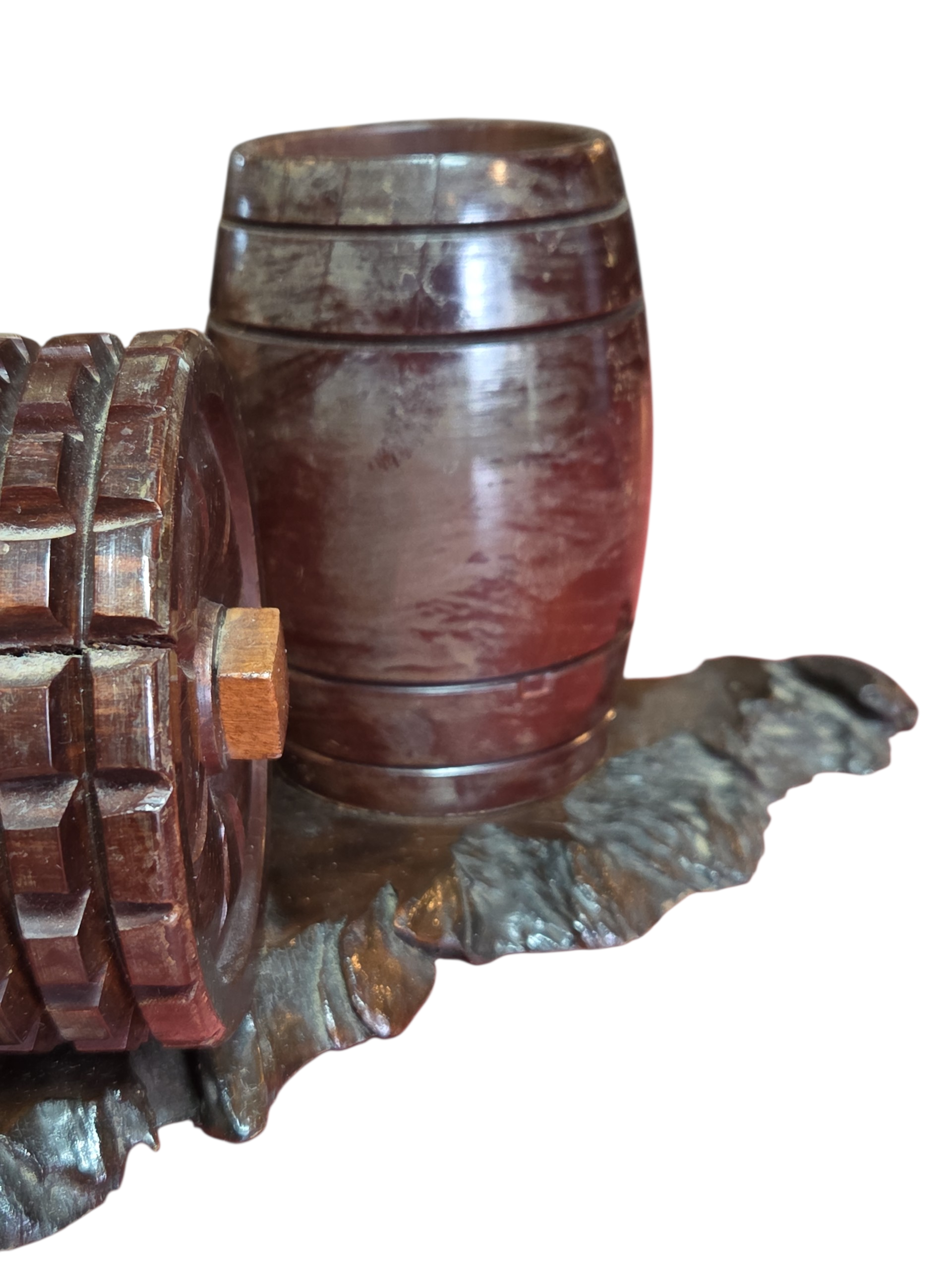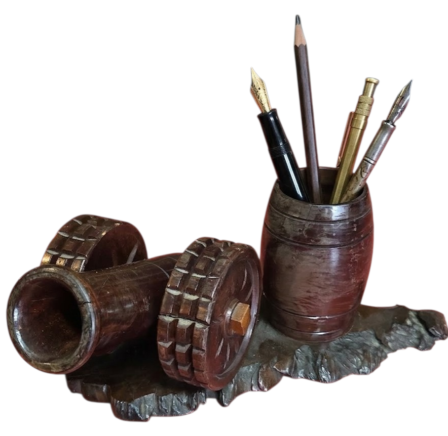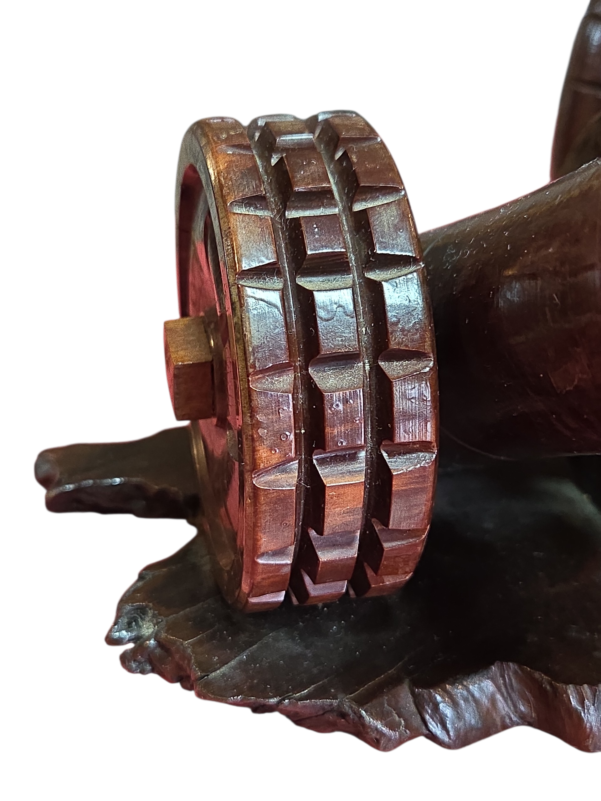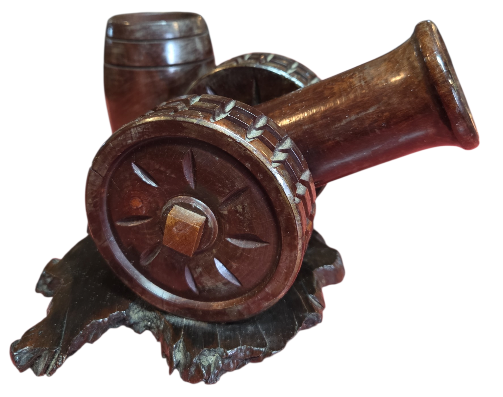 Apresentamos uma distinta peça de coleção e decoração, rica em detalhes e executada com técnicas tradicionais de marcenaria. Este conjunto une o simbolismo militar do canhão de artilharia à rusticidade de um barril clássico, ambos montados sobre uma base de madeira que preserva os contornos naturais da matéria-prima.