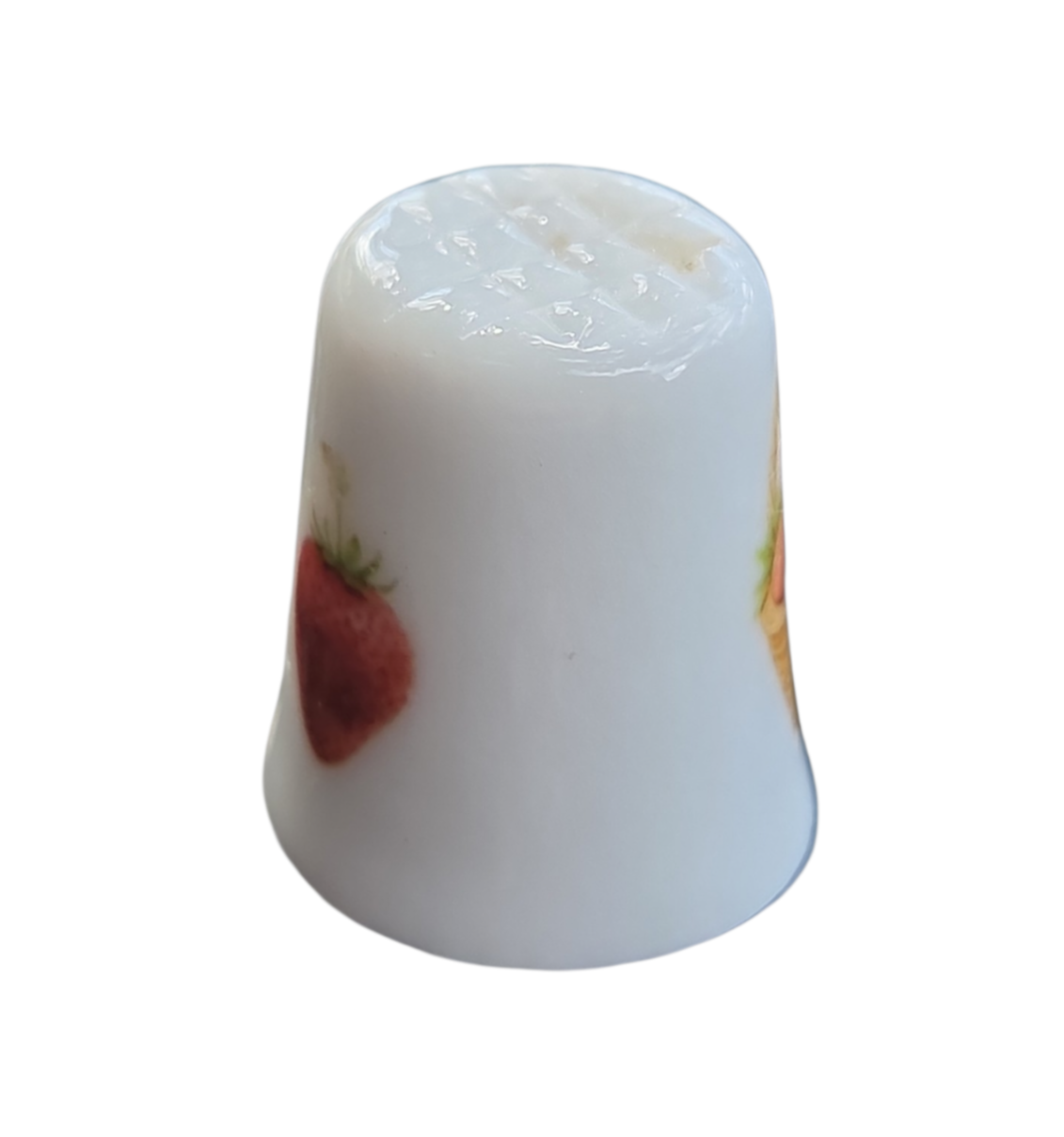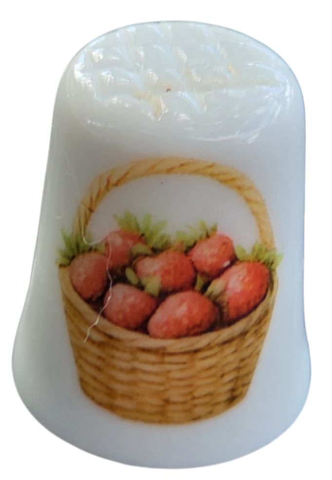 Este gracioso dedal em porcelana destaca-se pela sua temática campestre e delicada. A peça apresenta uma ilustração central de uma cesta de vime repleta de morangos, evocando um estilo "cottagecore" clássico, muito apreciado por colecionadores de porcelanas decorativas.