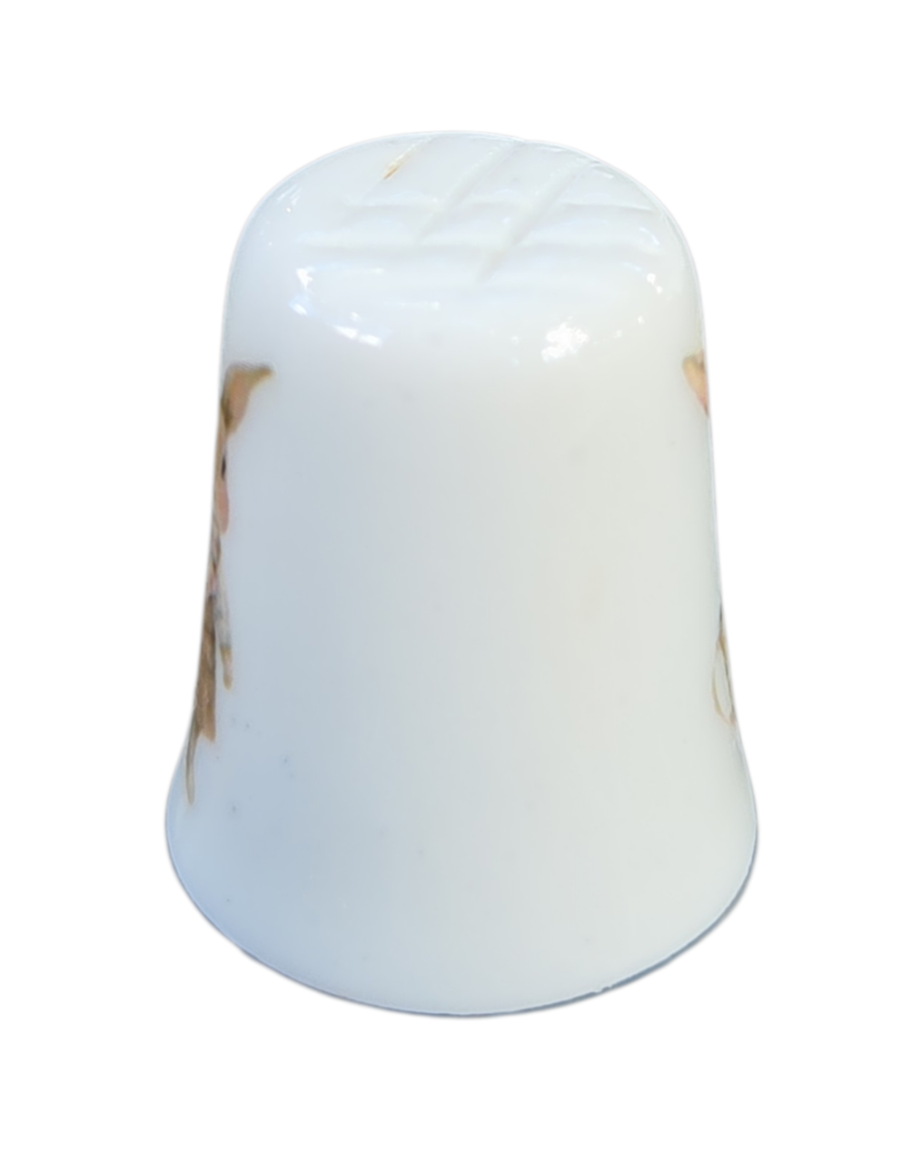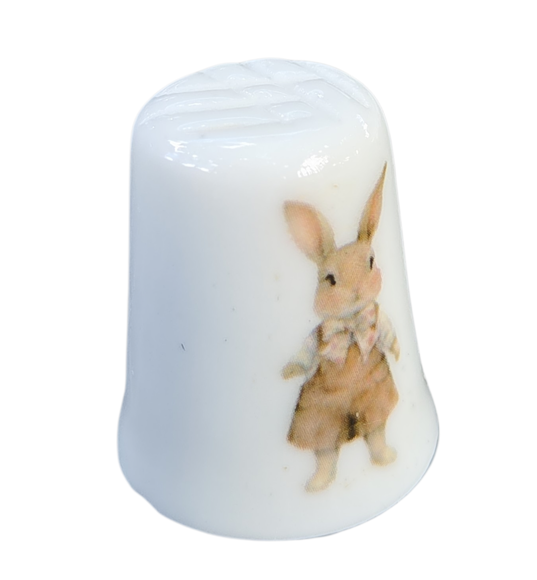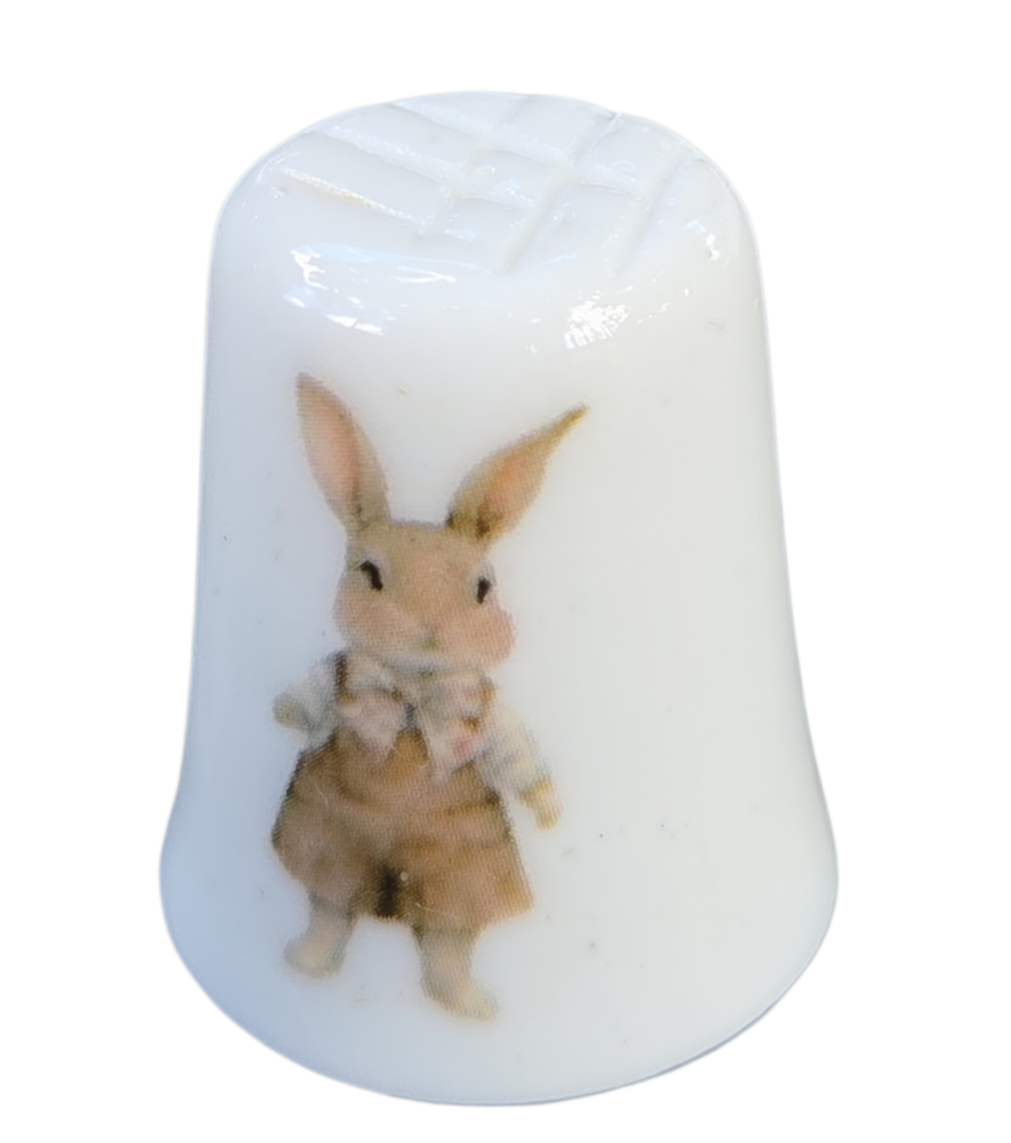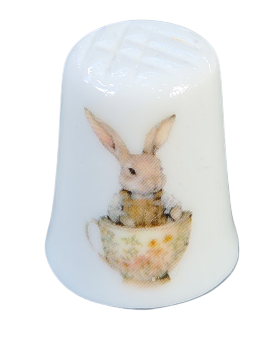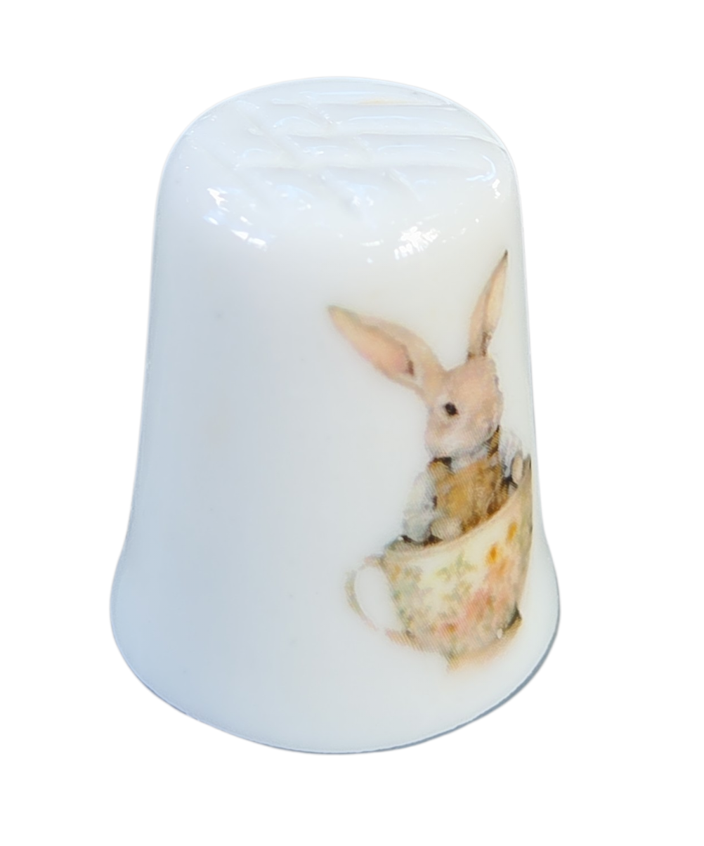 A decoração apresenta duas cenas distintas e encantadoras: de um lado, um coelhinho detalhado posando de pé; do outro, a imagem graciosa de um coelho espreitando de dentro de uma xícara floral. As ilustrações possuem traços suaves e cores pastéis, evocando um estilo clássico e nostálgico.