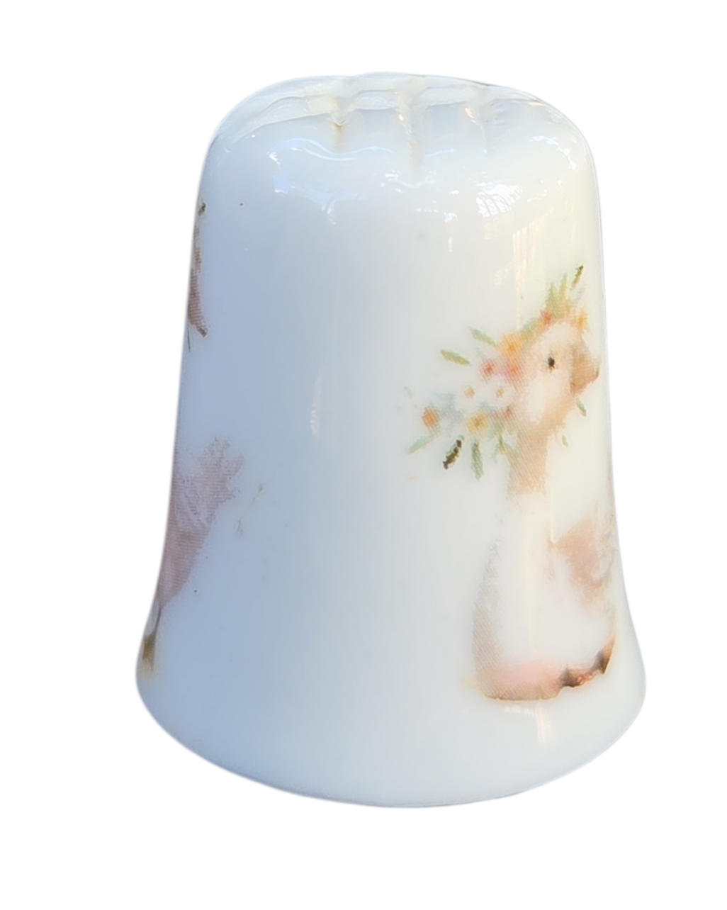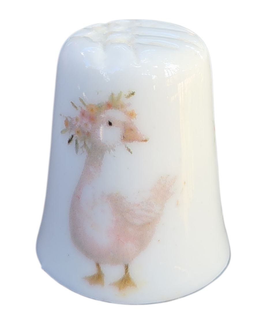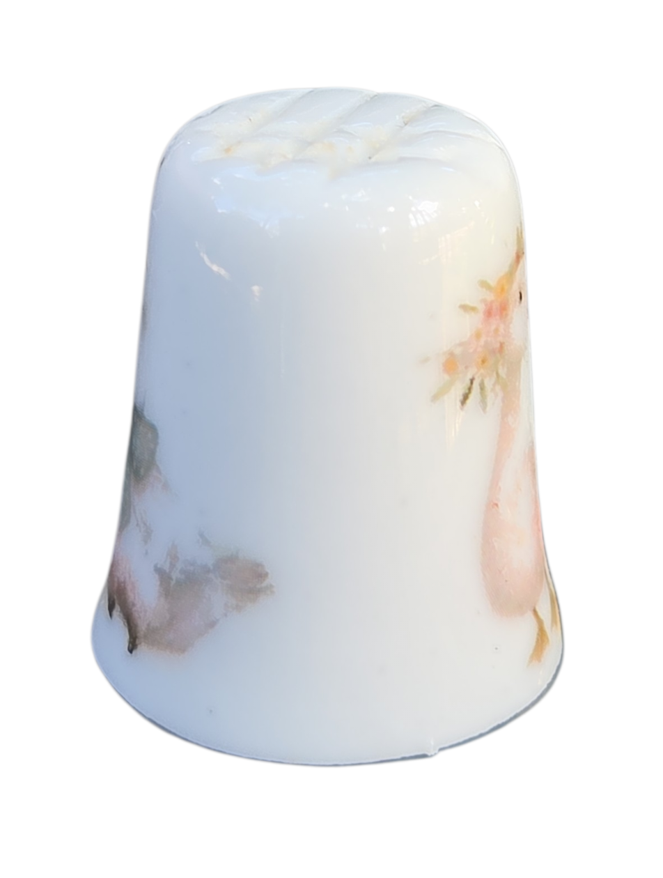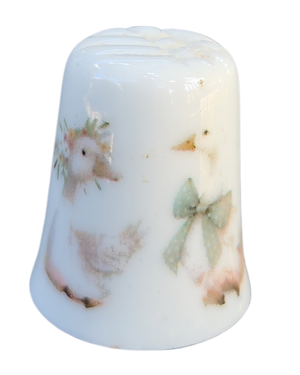 Esta peça apresenta um acabamento vitrificado impecável e uma decoração romântica em estilo vintage. A estampa detalha patinhos ilustrados em tons pastéis, com detalhes de flores e um laço clássico, conferindo um ar de doçura e nostalgia à peça.