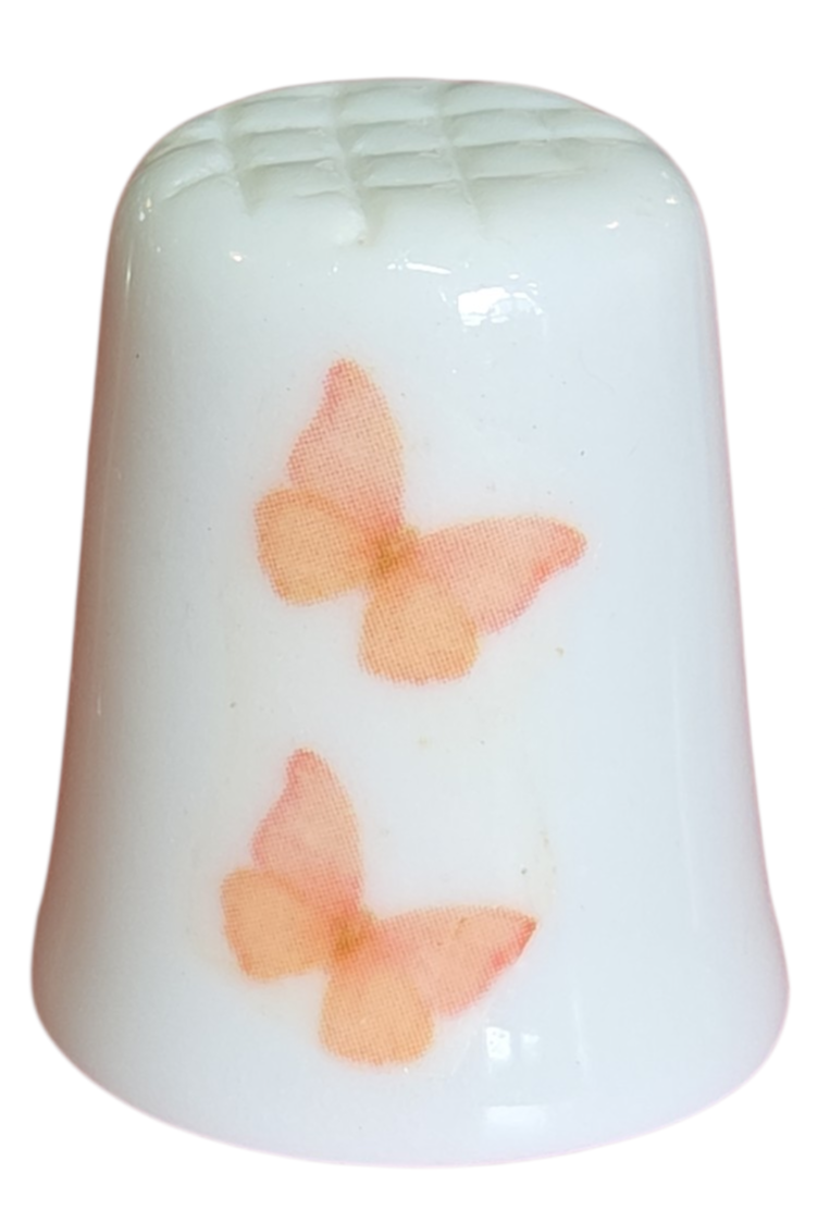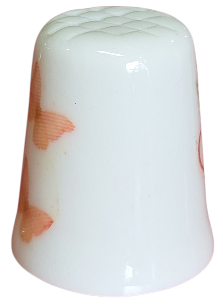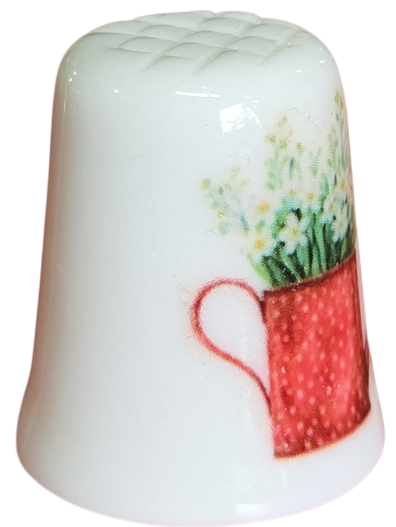 Encantador dedal colecionável em porcelana branca, perfeito para entusiastas de costura, colecionadores de miniaturas ou para presentear com delicadeza. A peça apresenta um acabamento brilhante e decorações temáticas de jardim em ambos os lados.