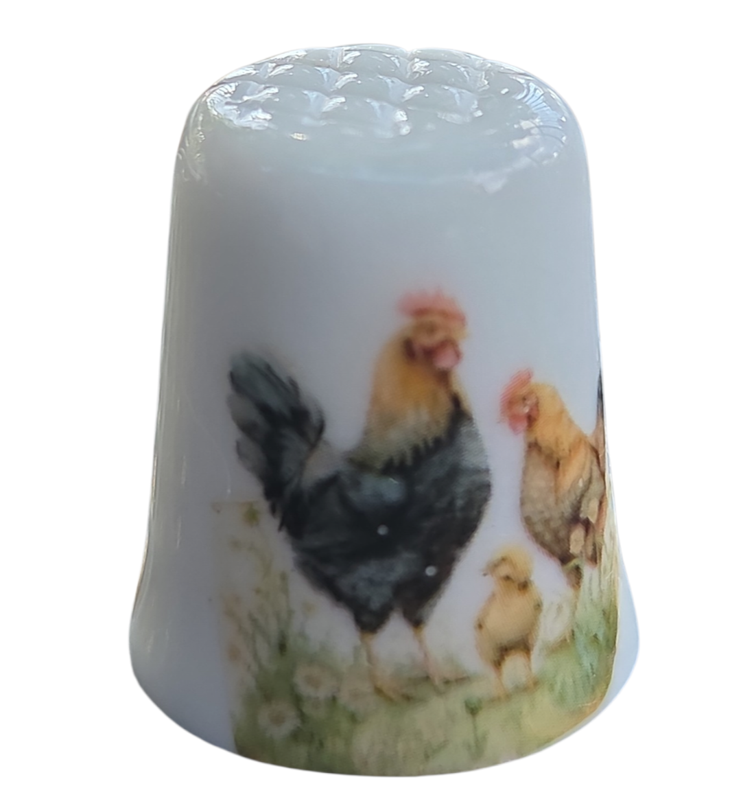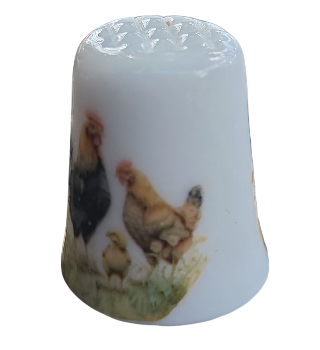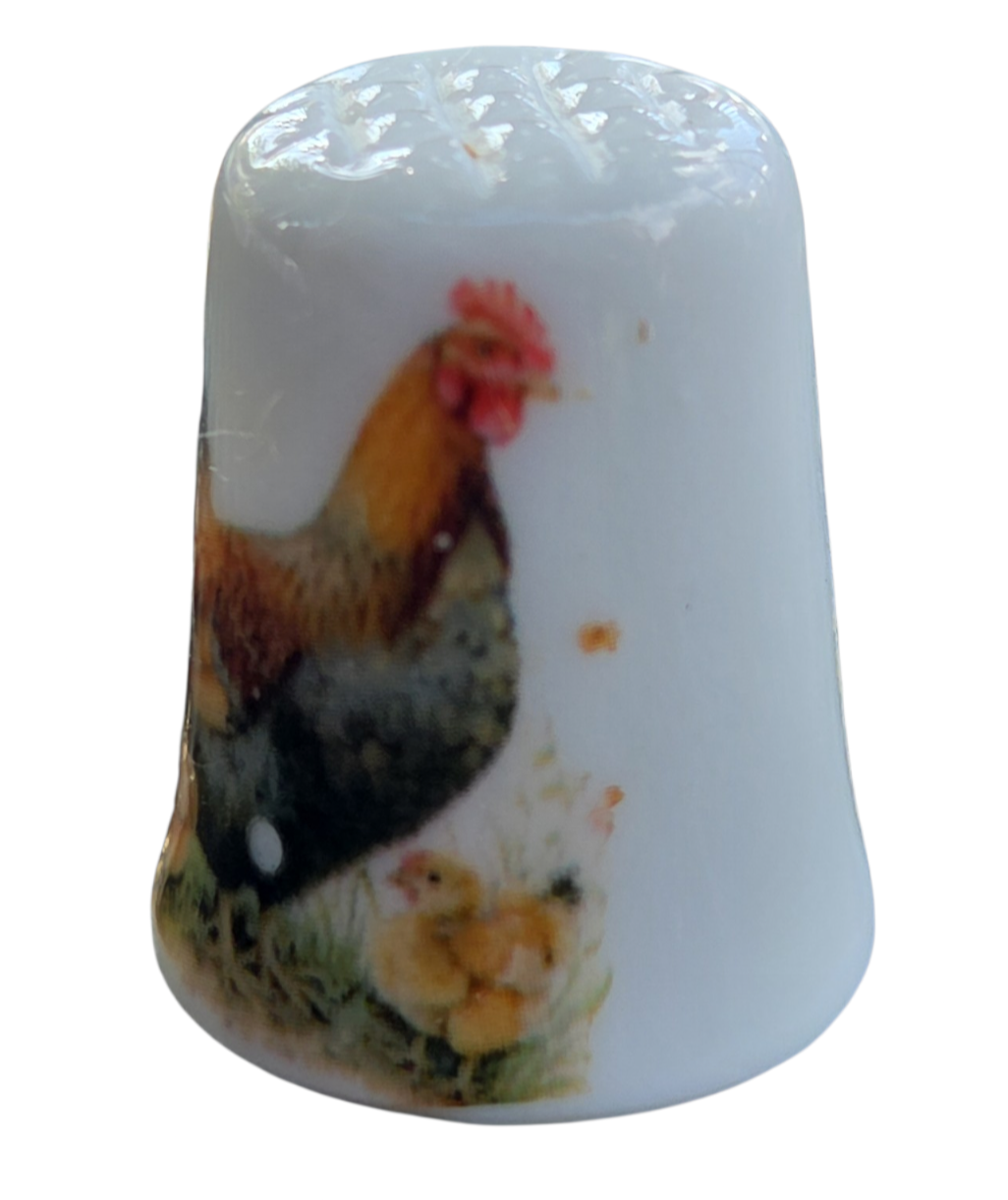Este encantador dedal em porcelana apresenta uma cena bucólica clássica, retratando a vida no campo. Com uma ilustração detalhada e cores quentes, é uma peça que evoca nostalgia e delicadeza, sendo um item de destaque para coleções com temática de animais de fazenda ou aves.