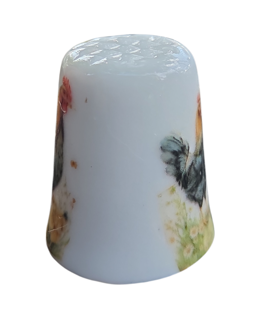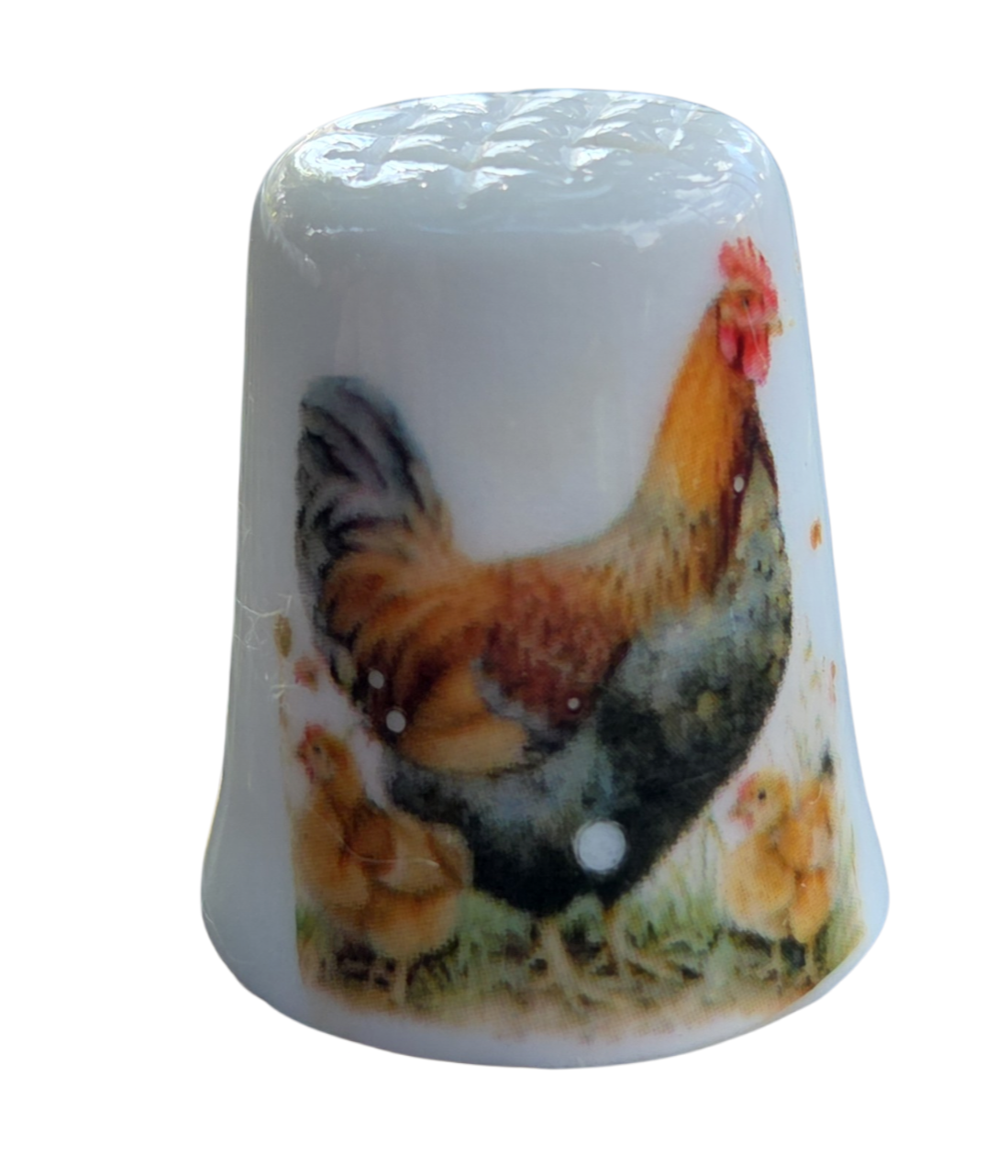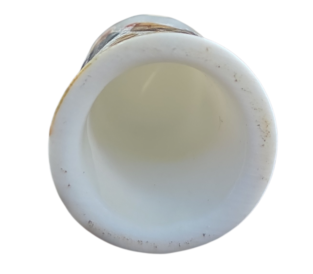 Este encantador dedal em porcelana apresenta uma cena bucólica clássica, retratando a vida no campo. Com uma ilustração detalhada e cores quentes, é uma peça que evoca nostalgia e delicadeza, sendo um item de destaque para coleções com temática de animais de fazenda ou aves.