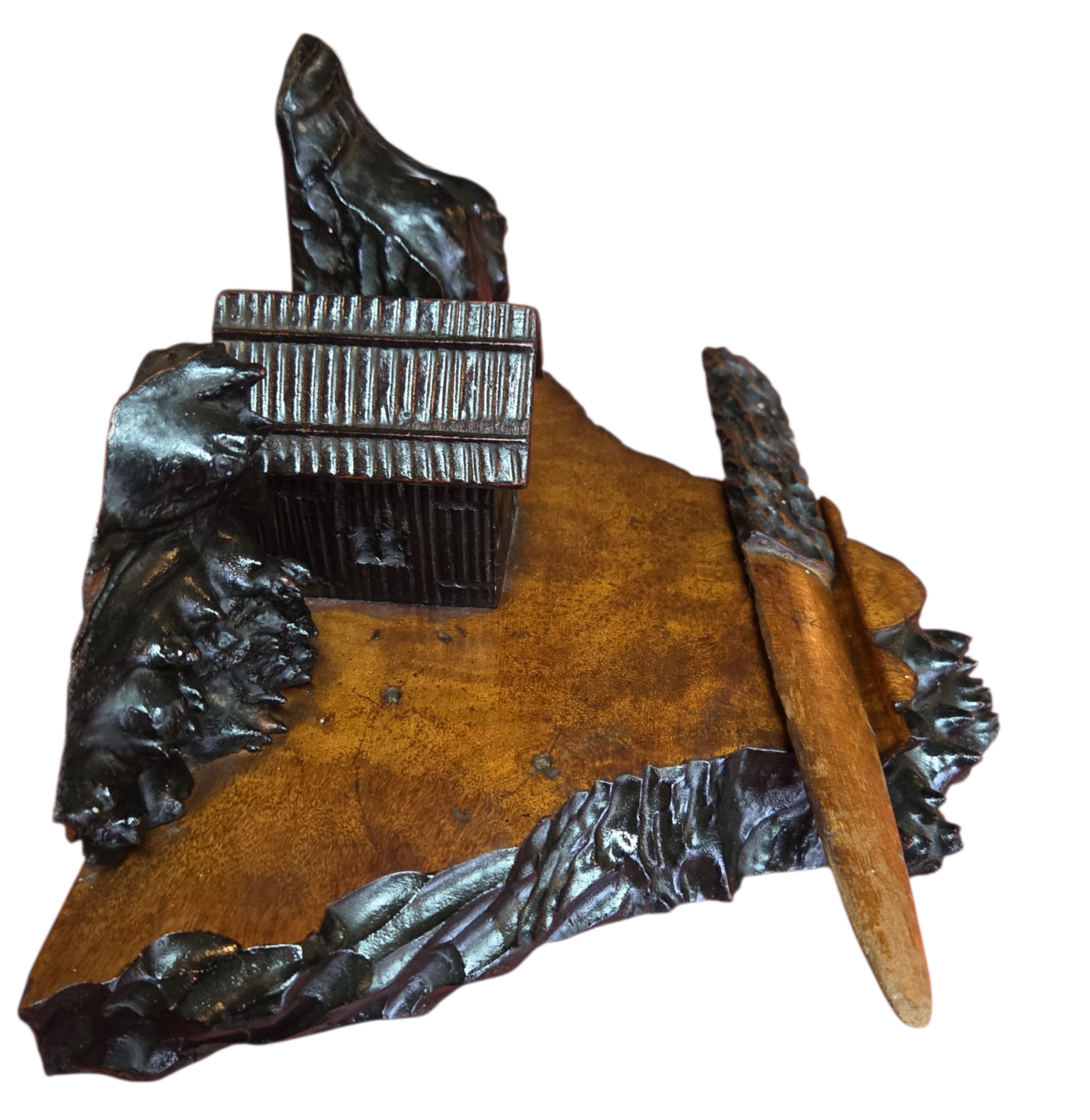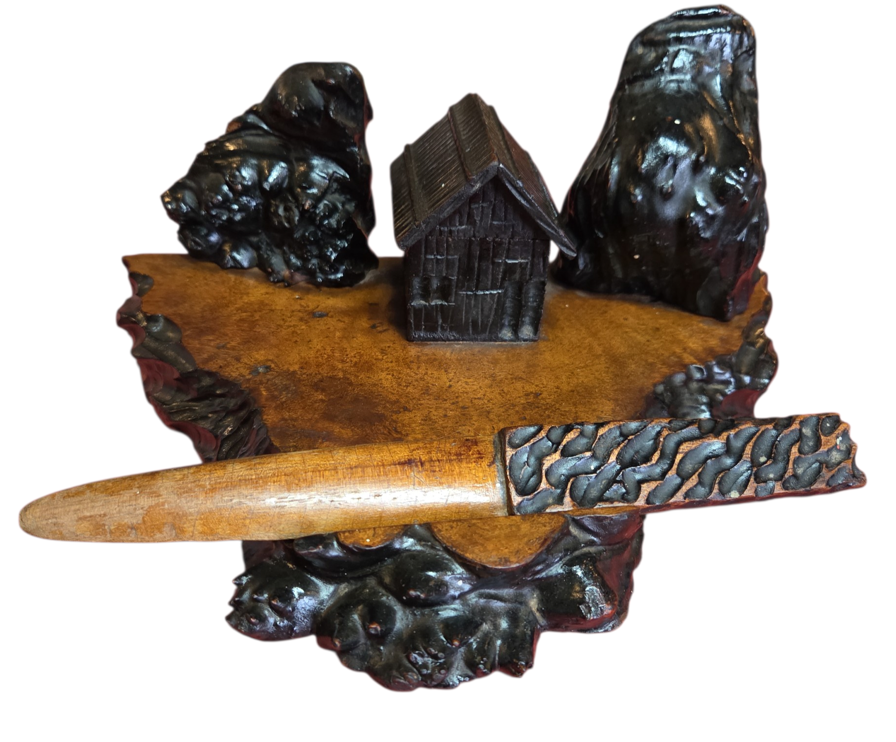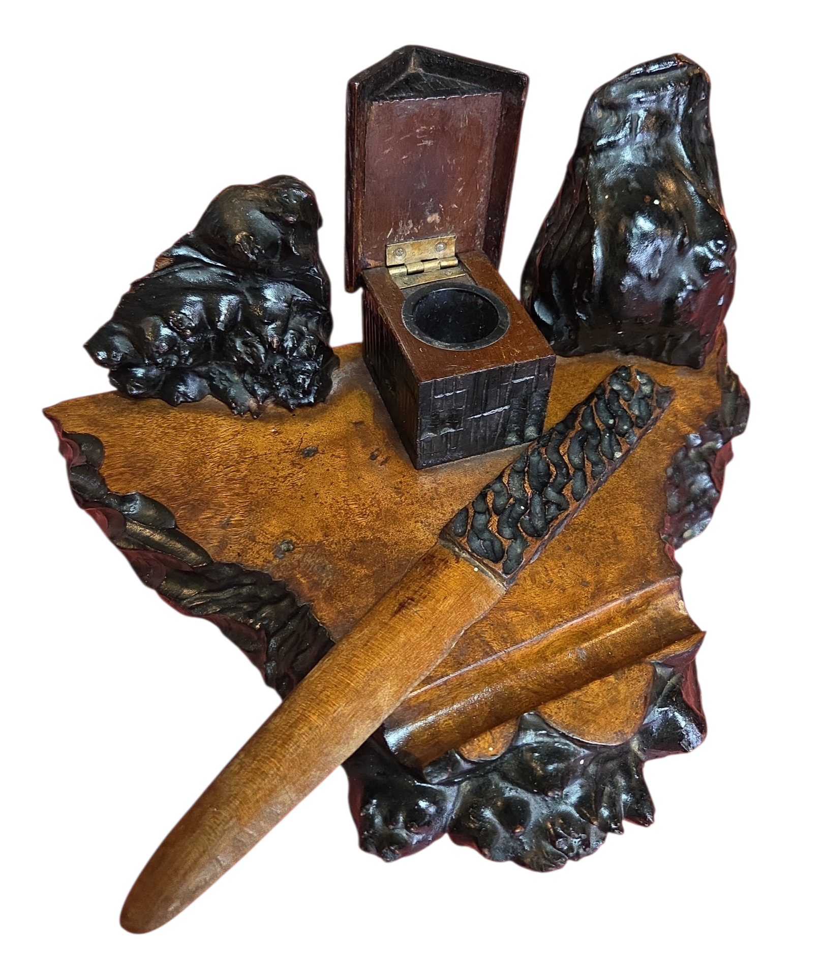 O conjunto inclui uma base trabalhada com bordas irregulares, um compartimento central para tinta com tampa funcional, suportes laterais decorativos e um abridor de cartas com empunhadura entalhada à mão. É uma peça que exemplifica o design rústico sofisticado da primeira metade do século XX, ideal para colecionadores de itens de escritório antigos ou para compor decorações de estilo clássico e bibliotecas.