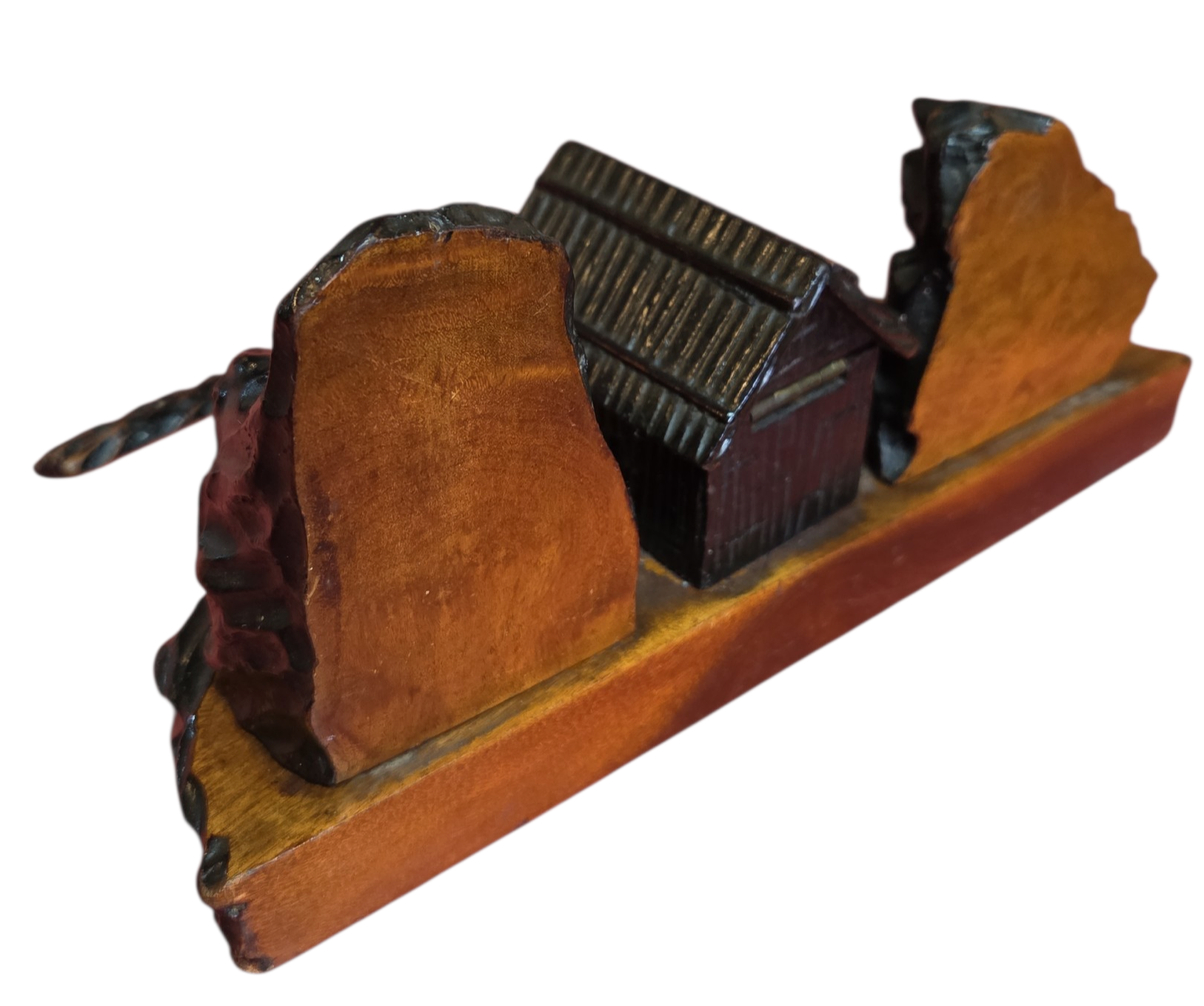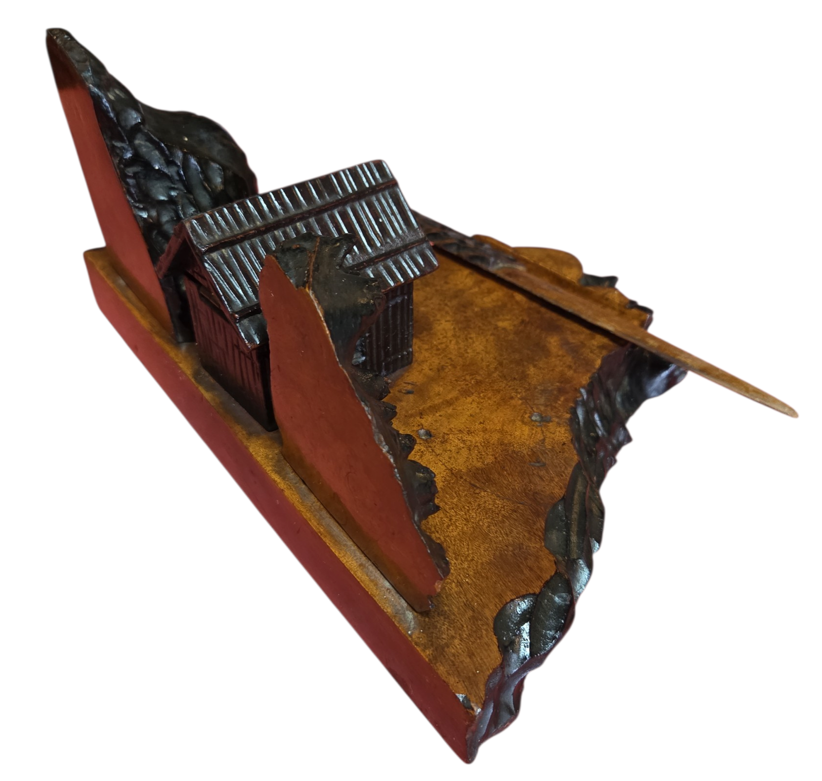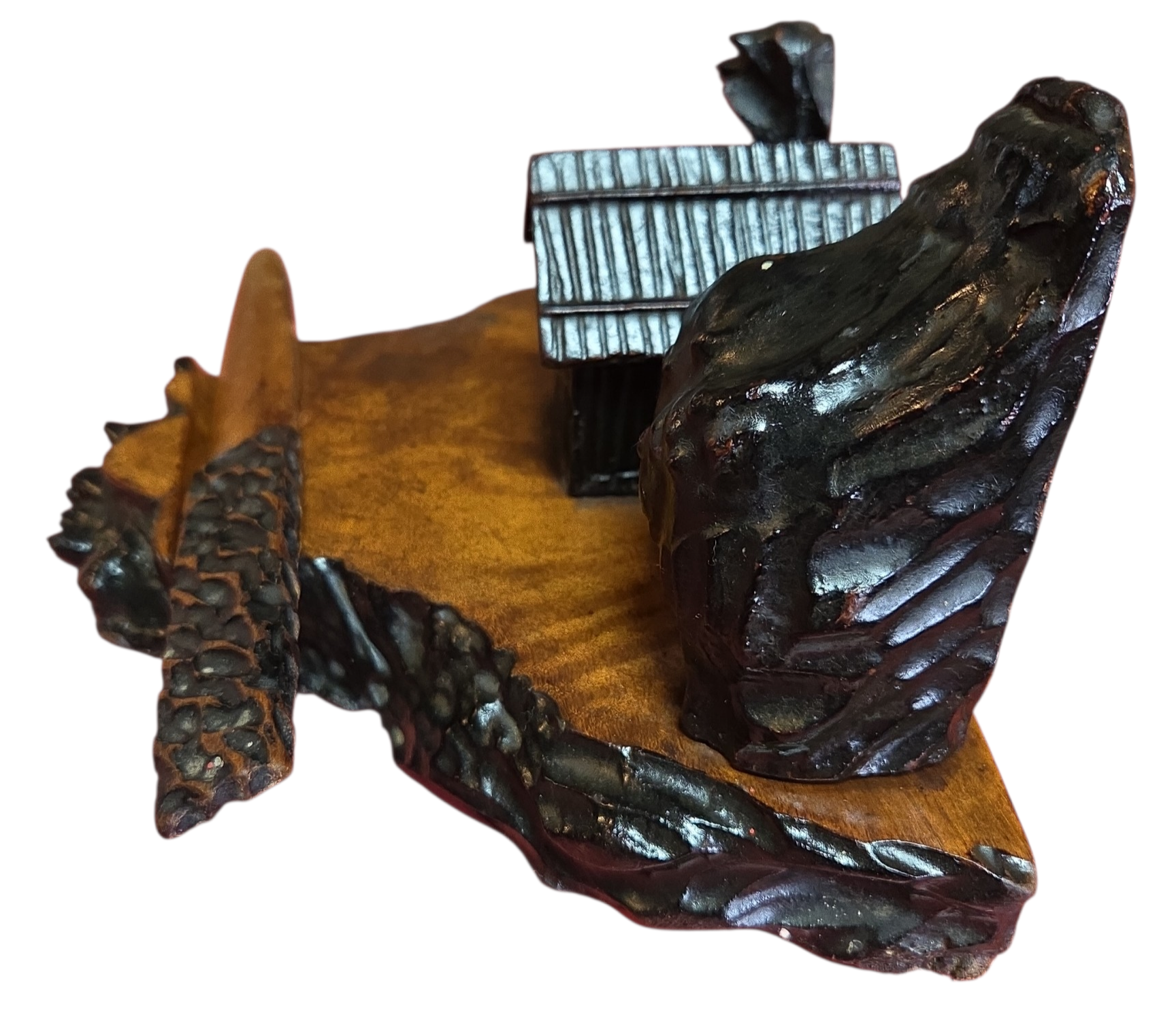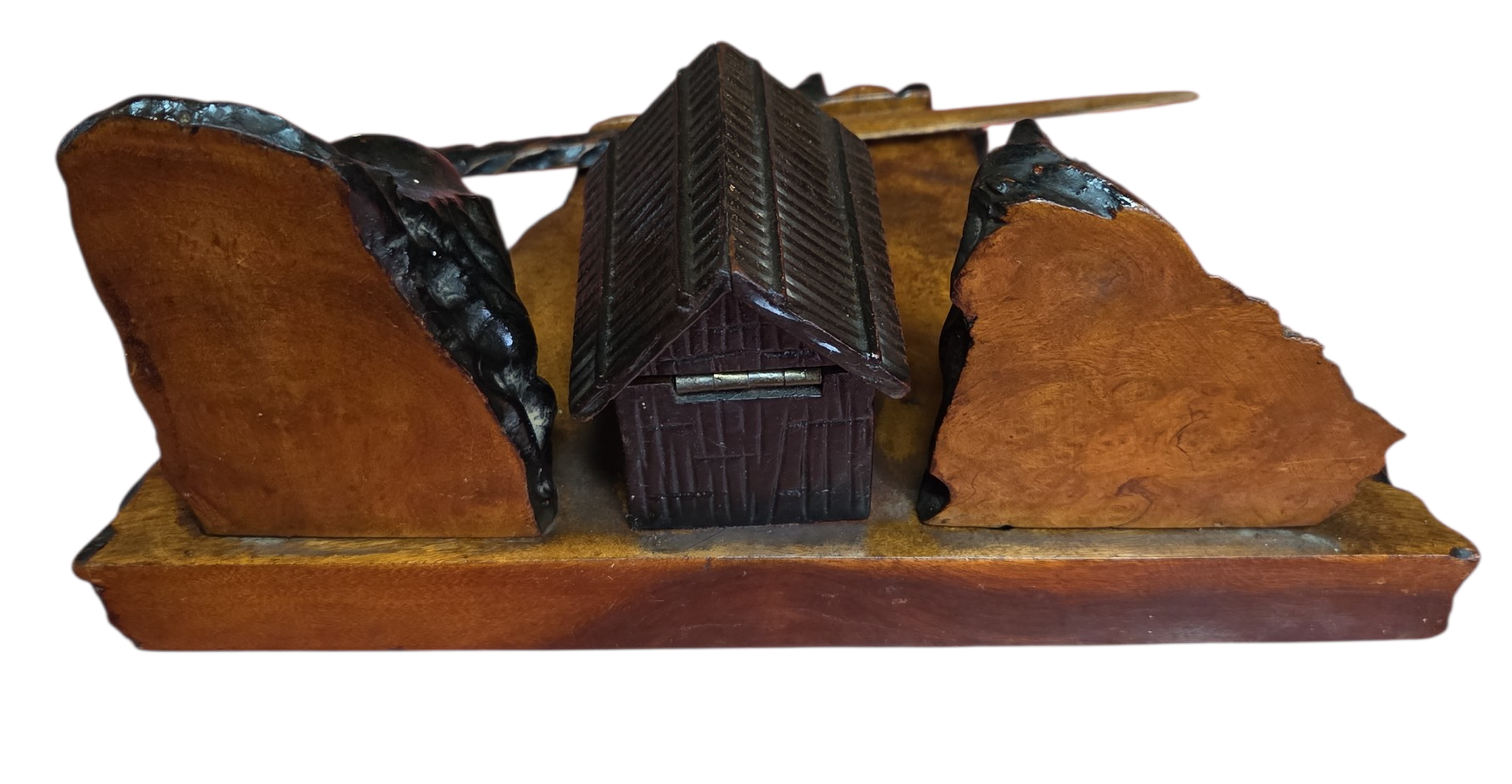 O conjunto inclui uma base trabalhada com bordas irregulares, um compartimento central para tinta com tampa funcional, suportes laterais decorativos e um abridor de cartas com empunhadura entalhada à mão. É uma peça que exemplifica o design rústico sofisticado da primeira metade do século XX, ideal para colecionadores de itens de escritório antigos ou para compor decorações de estilo clássico e bibliotecas.