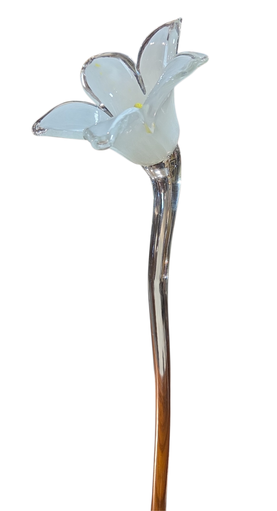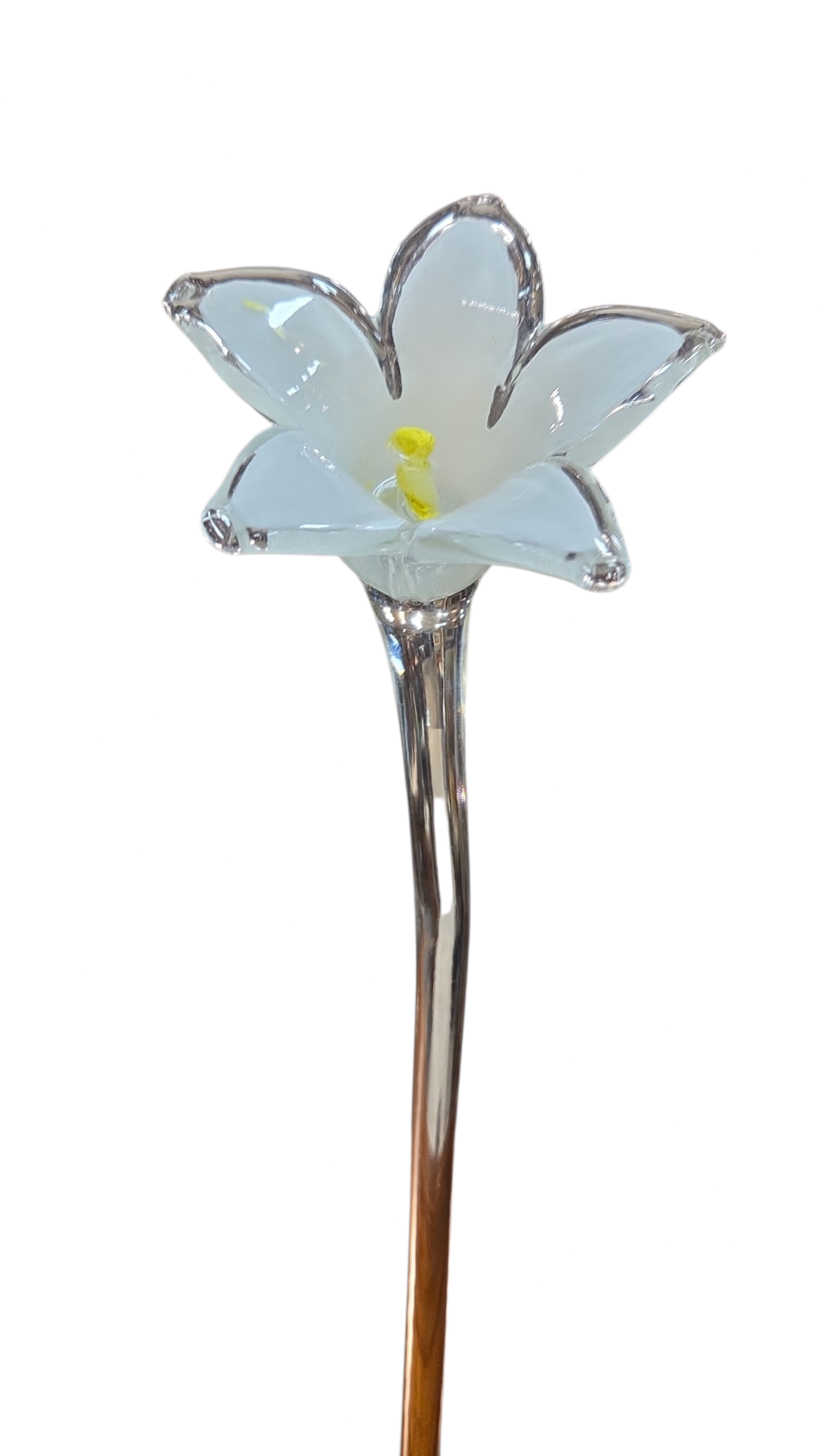 Elegante flor decorativa artesanal, modelada à mão em cristal Murano. Esta peça une o charme do design orgânico com a sofisticação da técnica vidreira, ideal para compor arranjos ou ser o destaque solitário em um vaso fino.