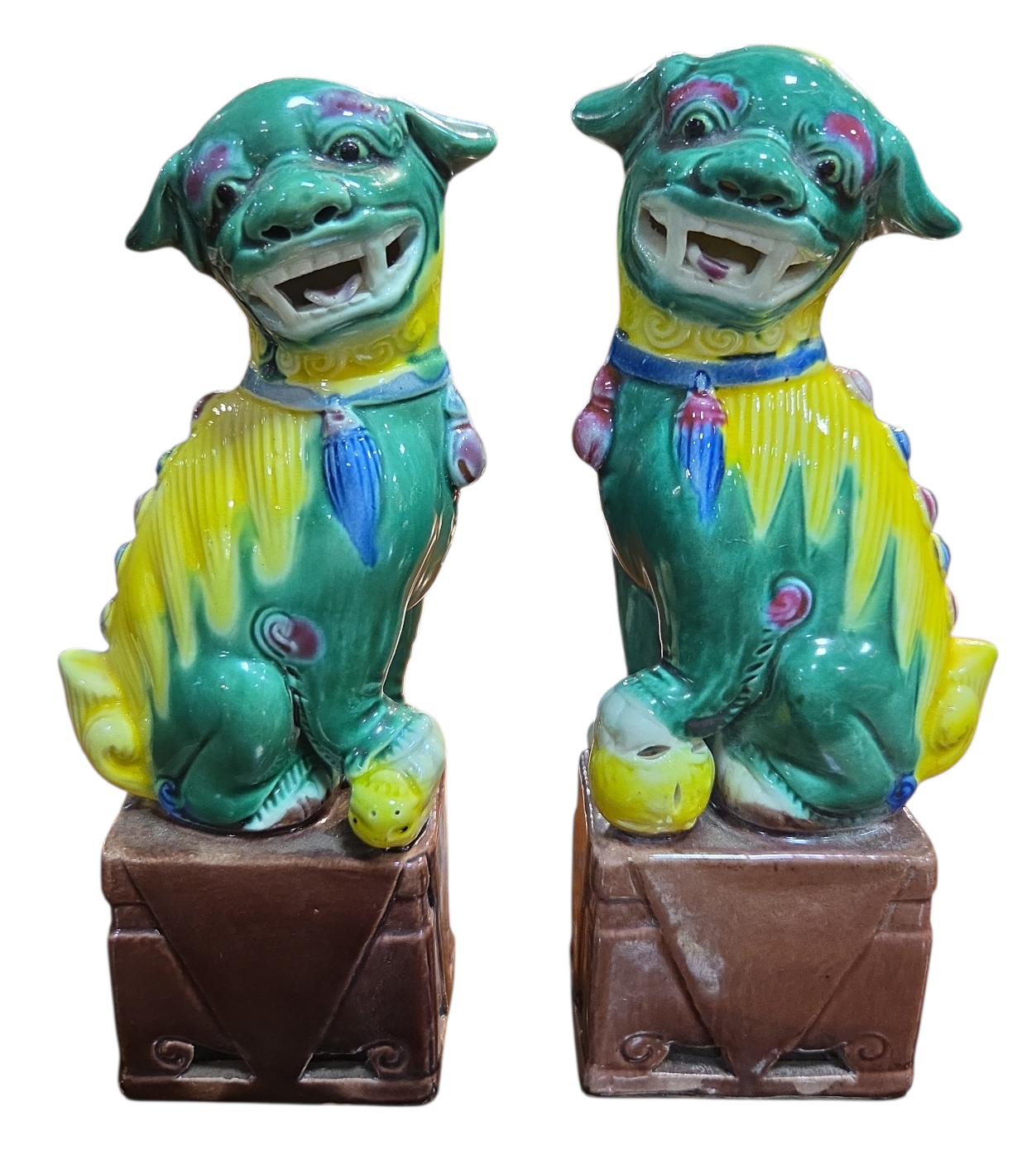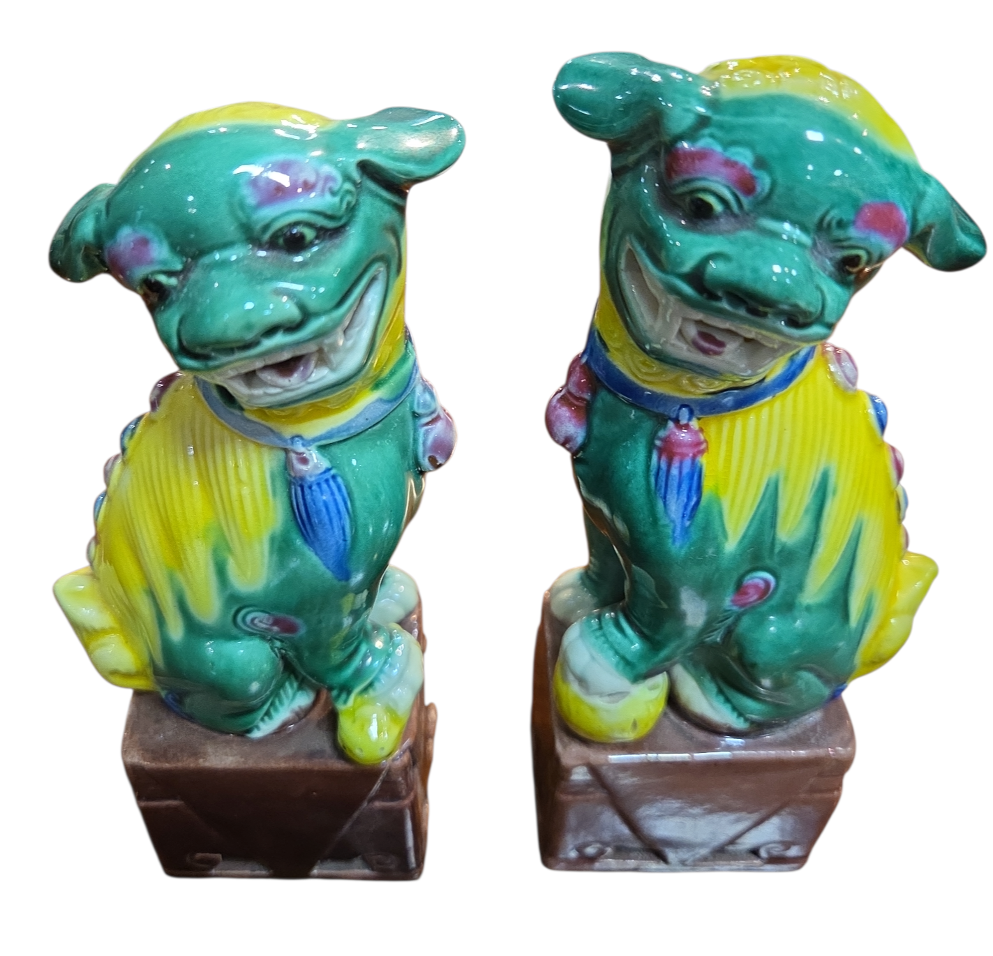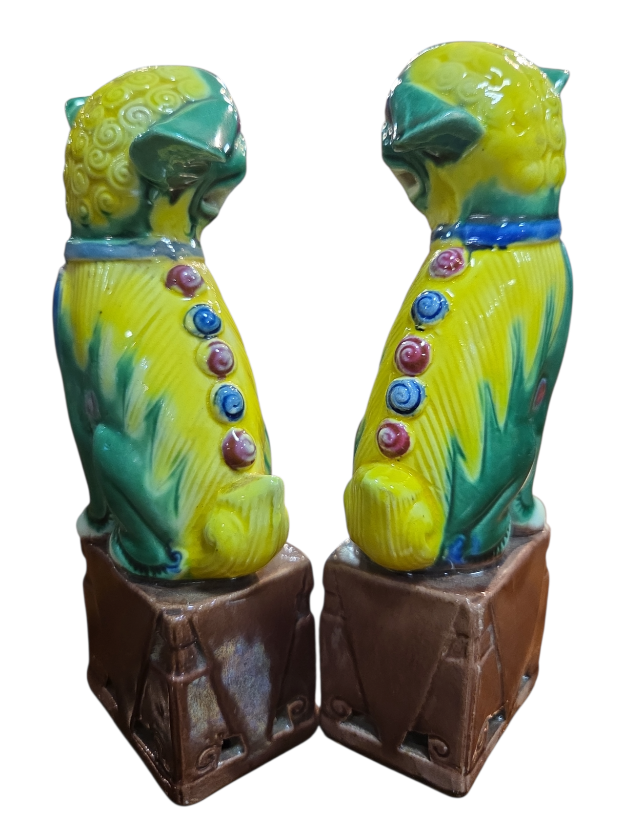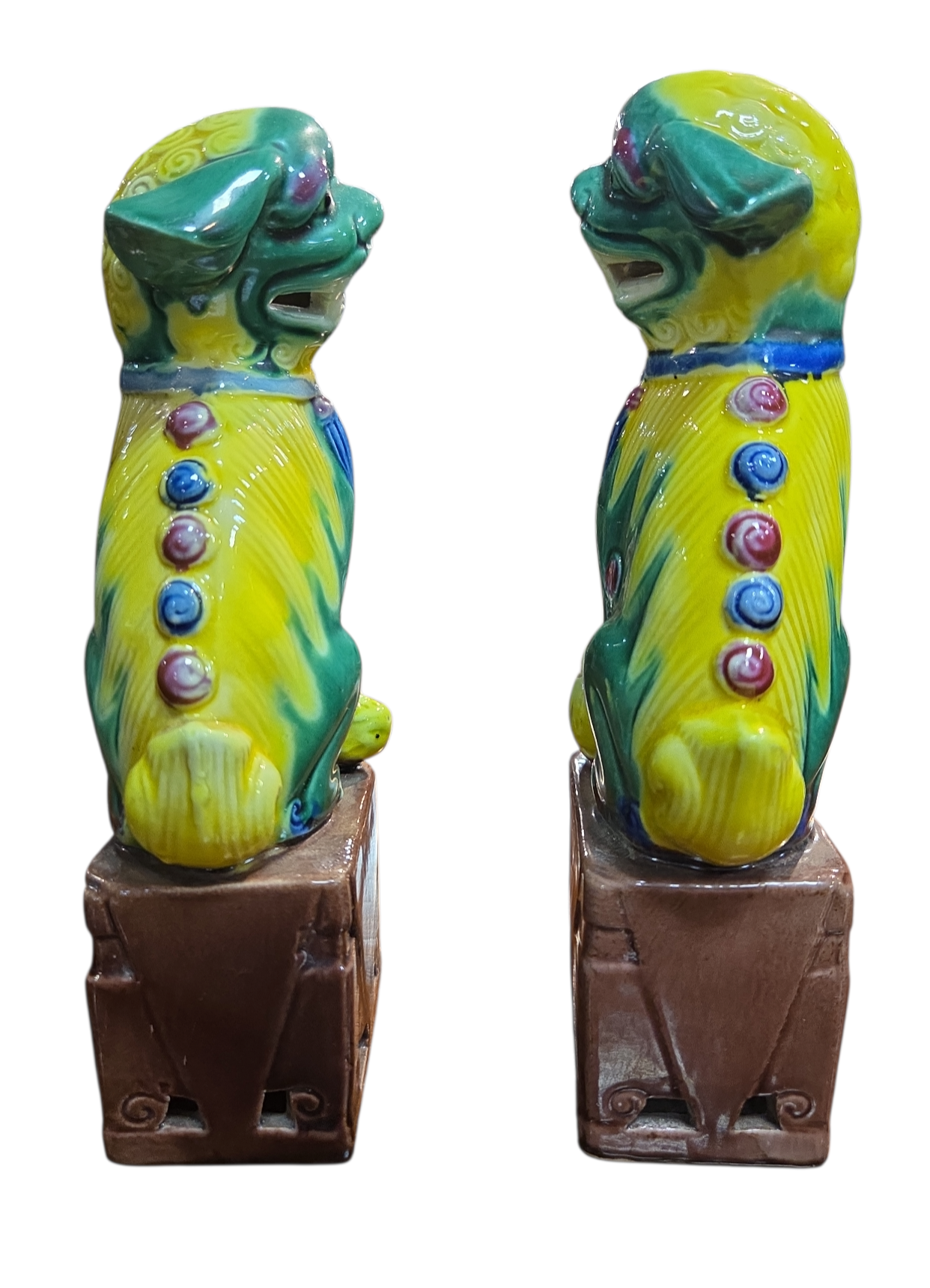 Magnífico par de Cães de Fo (também conhecidos como Leões de Fu ou Leões Guardiões), símbolos milenares de proteção, sorte e status na cultura oriental. As peças apresentam uma paleta de cores vibrante em tons de verde esmeralda, amarelo canário e azul, com acabamento em verniz vitrificado que confere um brilho profundo e duradouro.