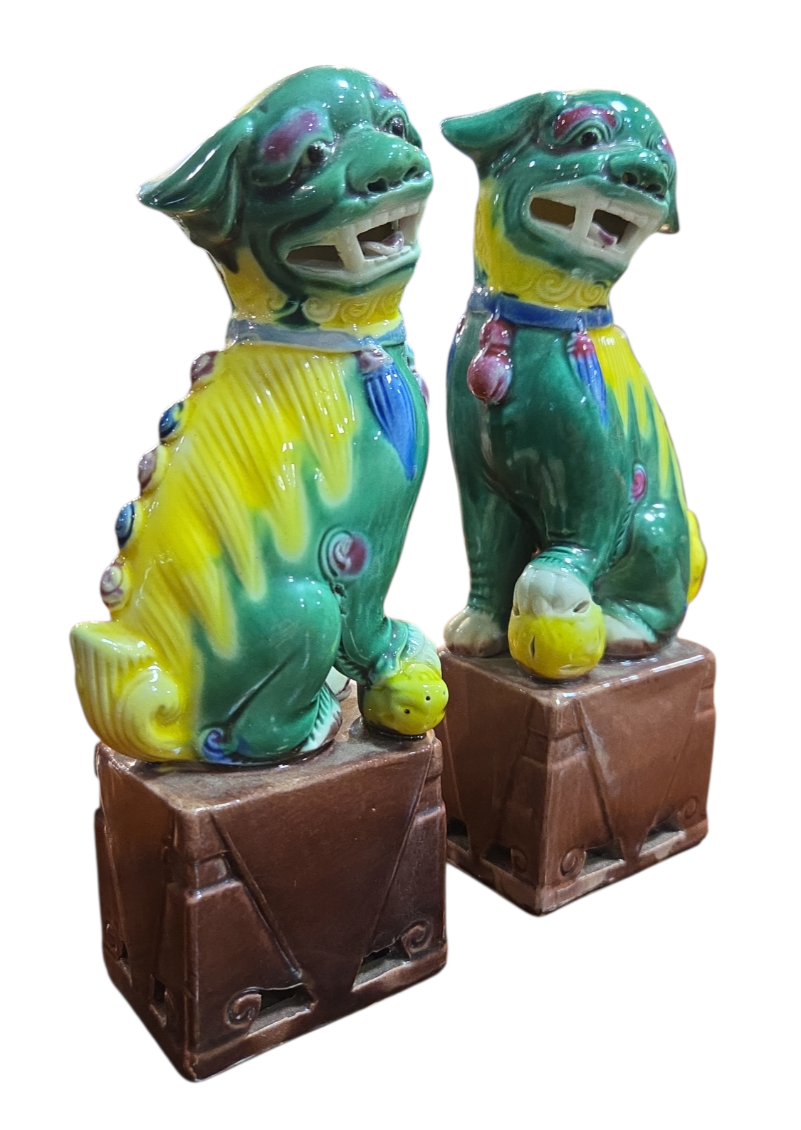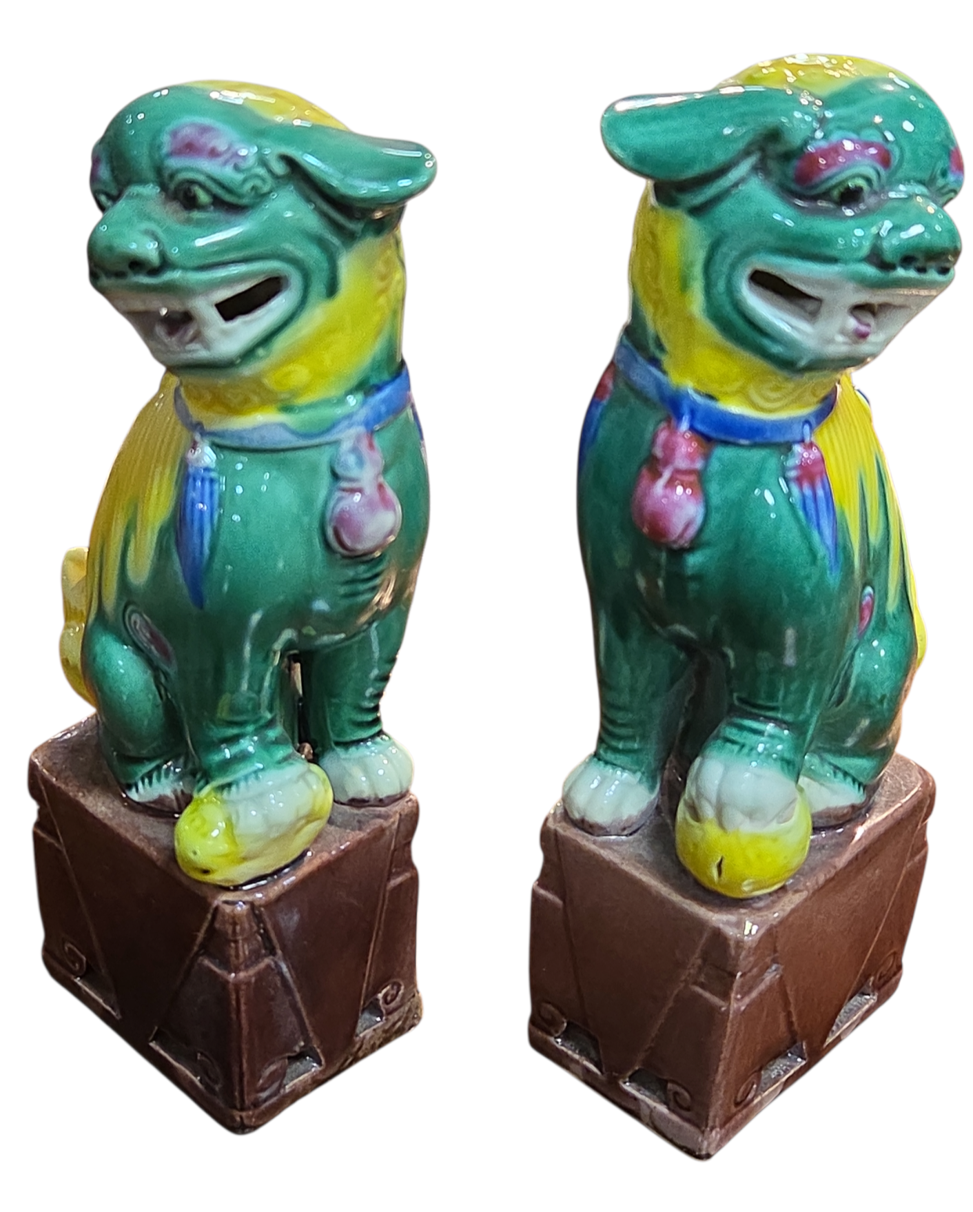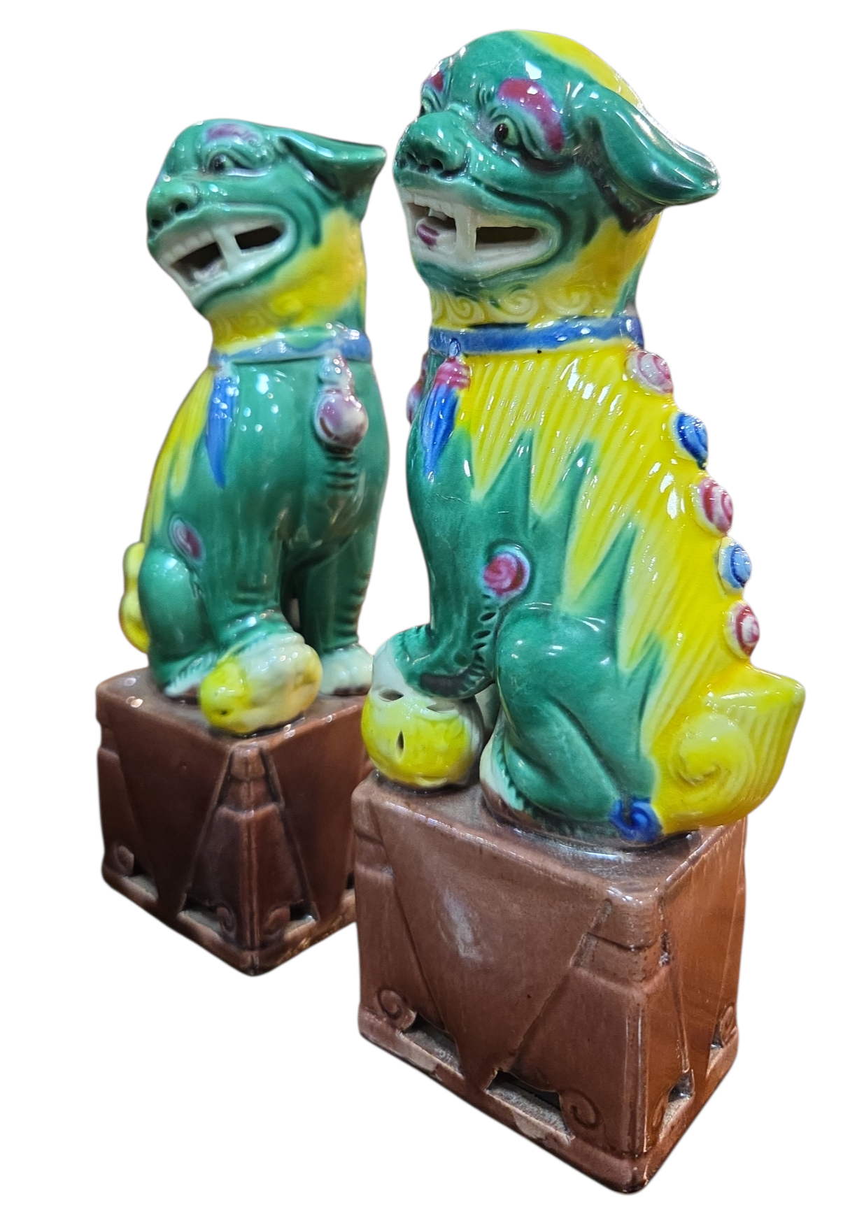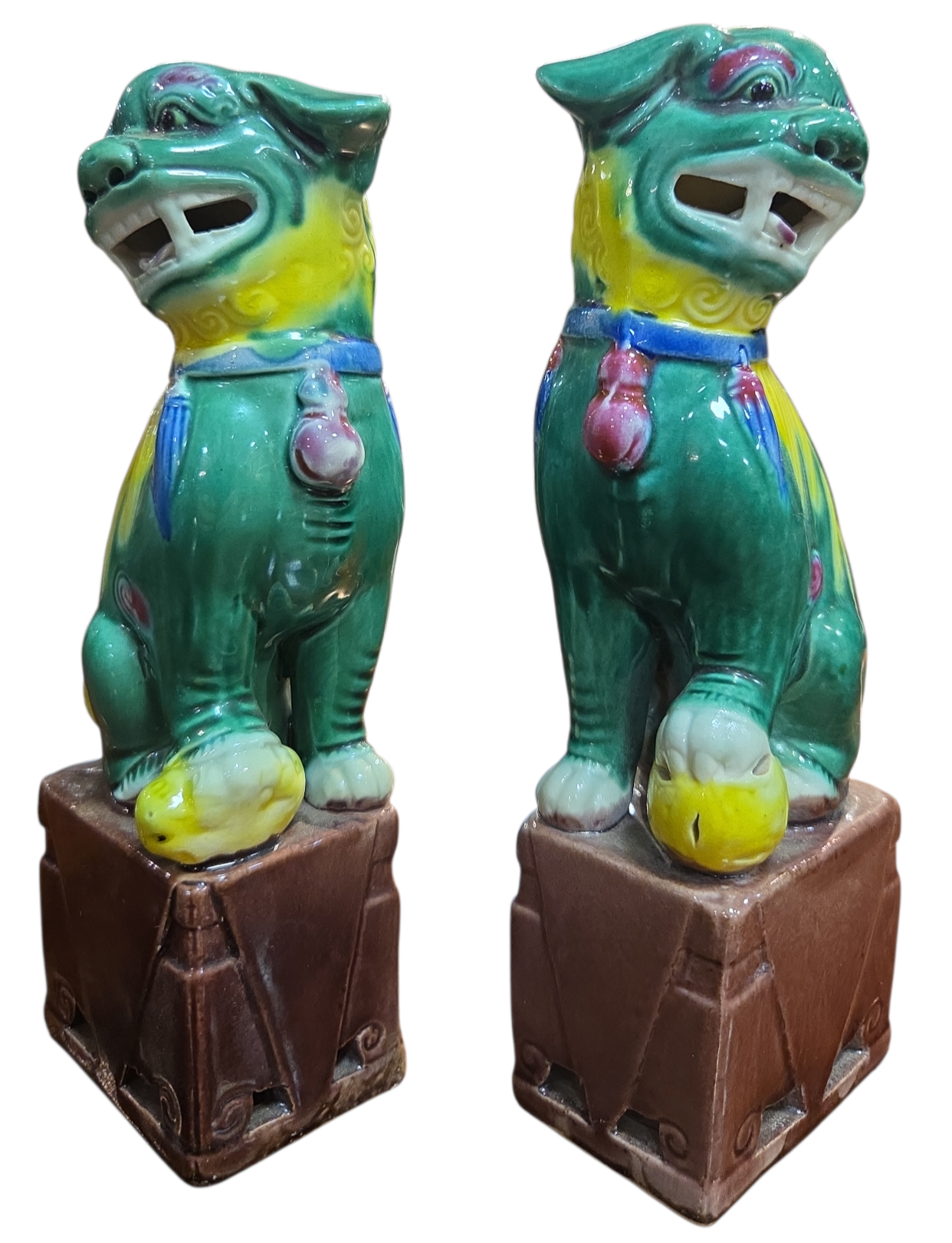 Magnífico par de Cães de Fo (também conhecidos como Leões de Fu ou Leões Guardiões), símbolos milenares de proteção, sorte e status na cultura oriental. As peças apresentam uma paleta de cores vibrante em tons de verde esmeralda, amarelo canário e azul, com acabamento em verniz vitrificado que confere um brilho profundo e duradouro.