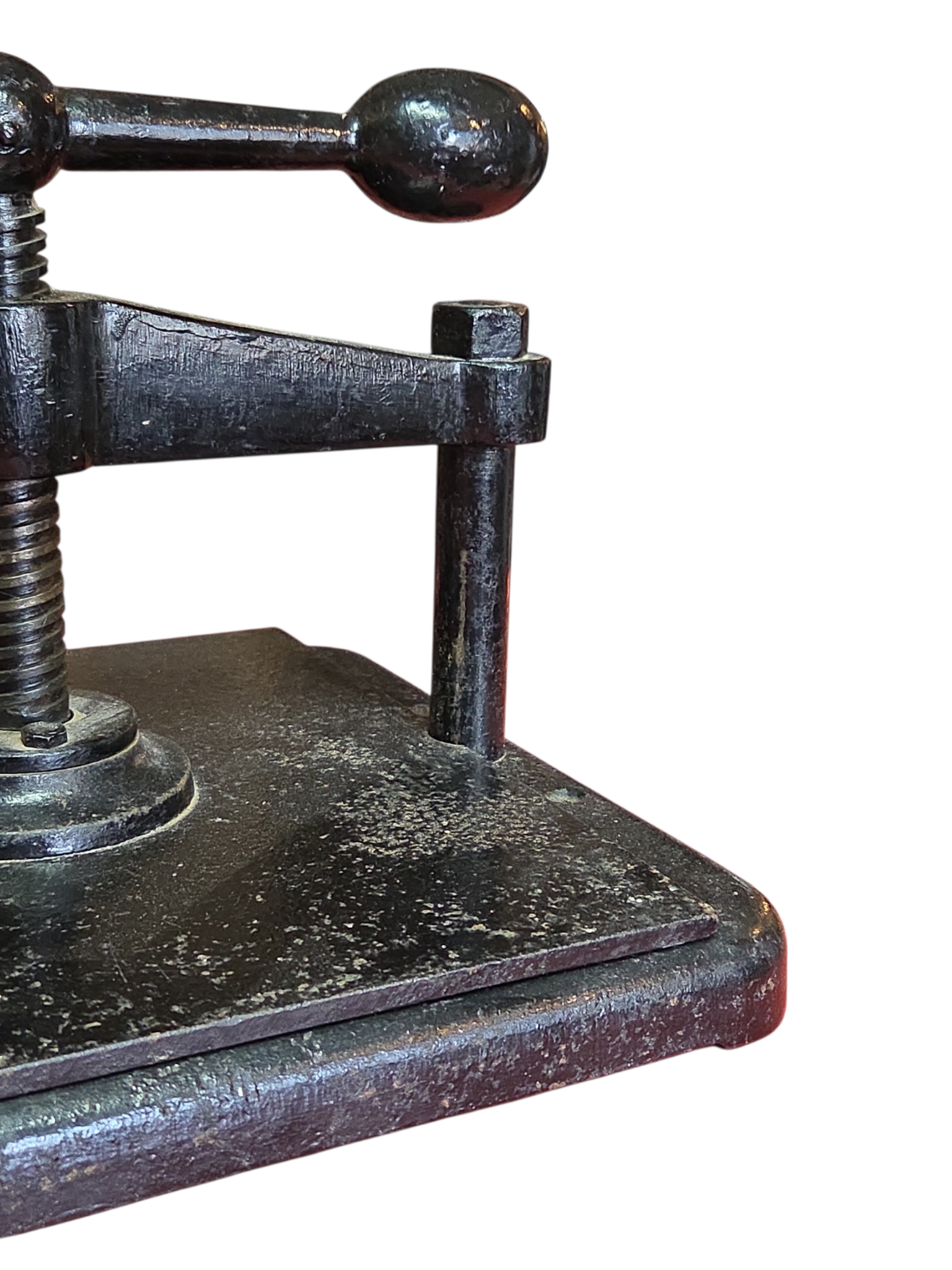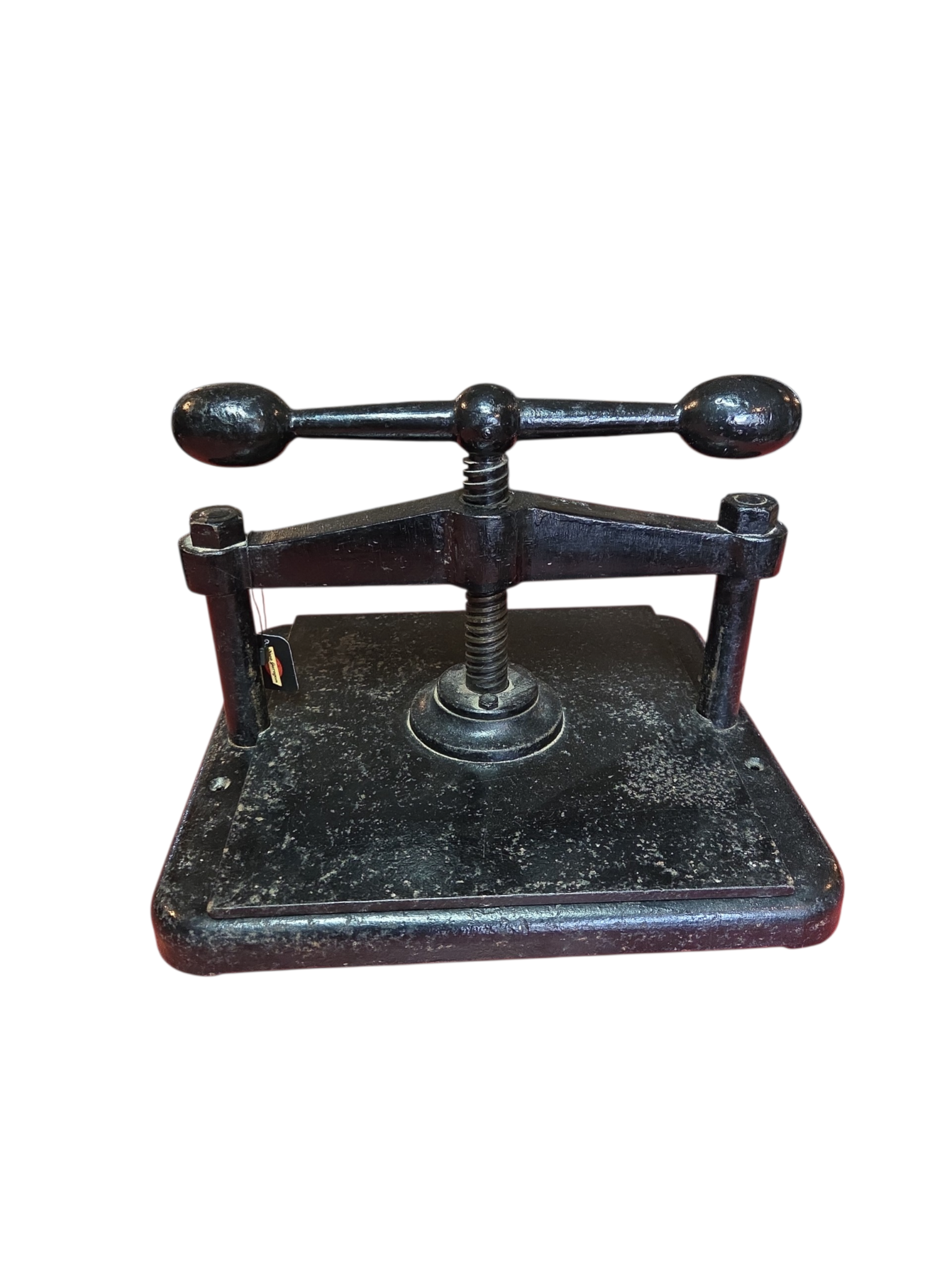 Prensa manual clássica, robusta e pesada, confeccionada inteiramente em ferro fundido. Peça ideal para ateliers de encadernação artesanal, cartonagem ou restauro de livros. O fuso está correndo perfeitamente, permitindo a pressão necessária para trabalhos de precisão.