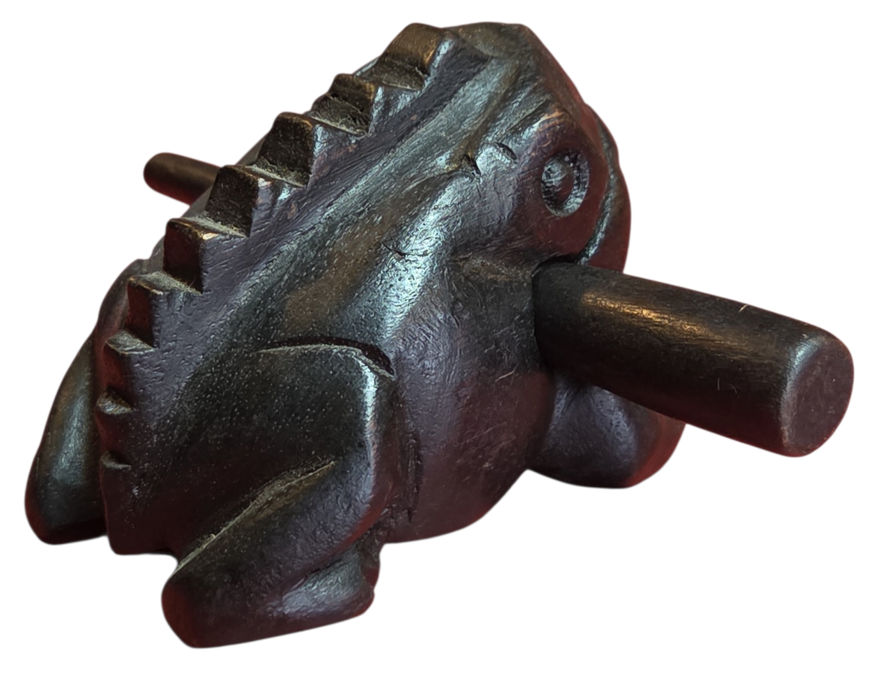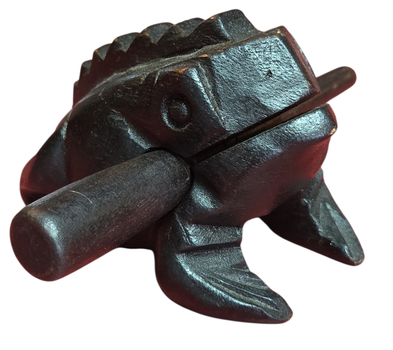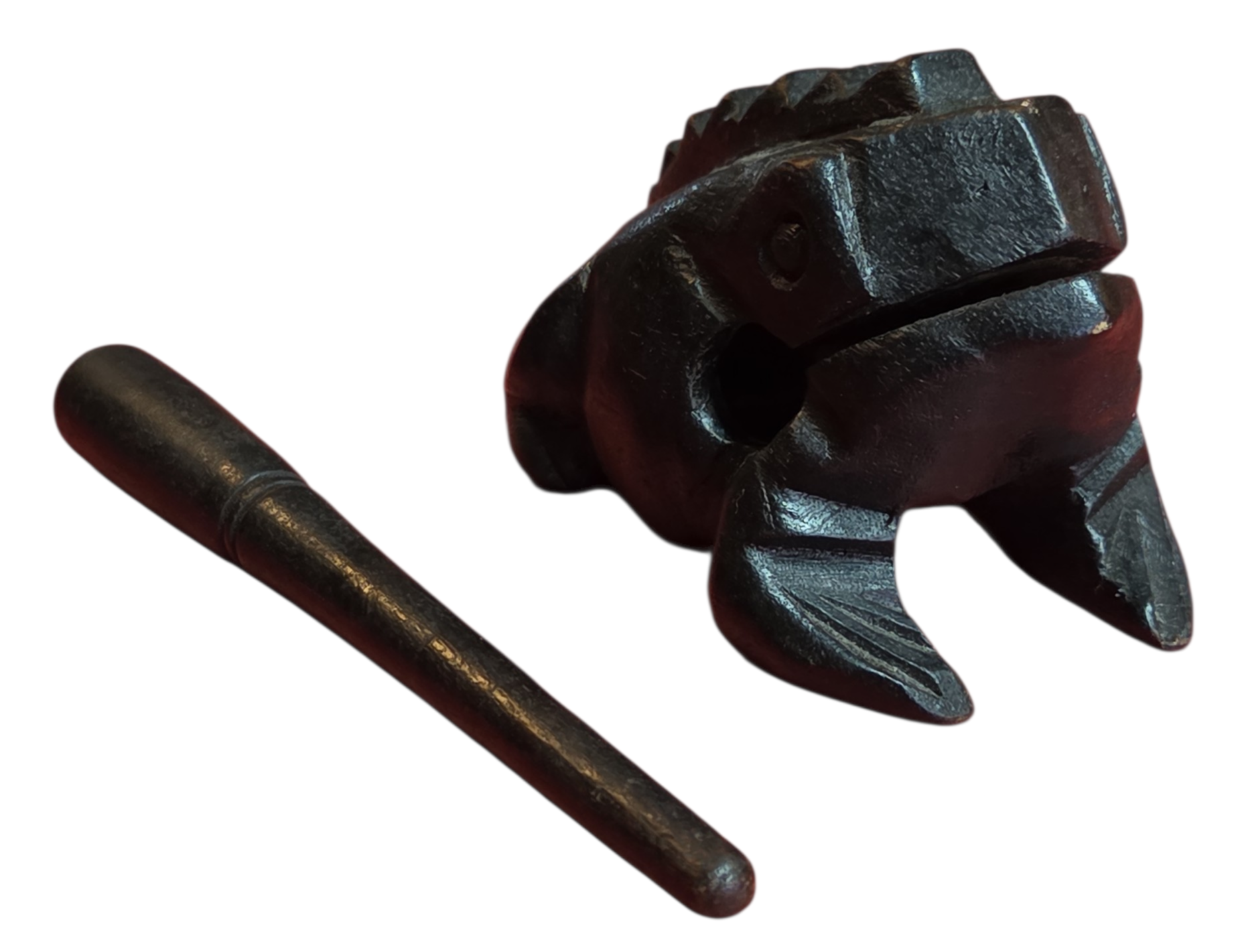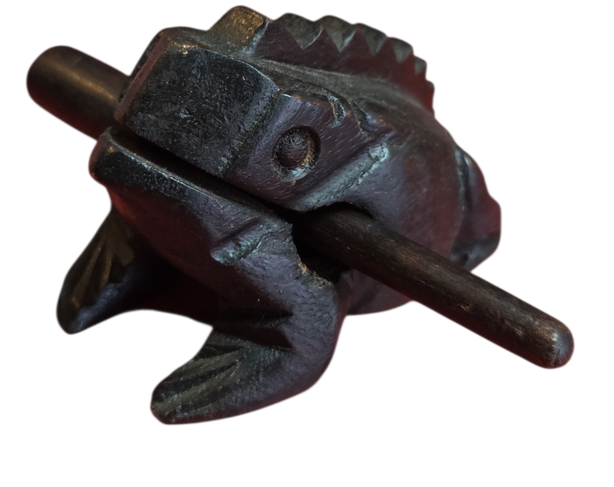 Este encantador sapinho não é apenas um item decorativo, mas um instrumento musical de percussão. Ao deslizar a baqueta de madeira pelas ranhuras em suas costas, ele reproduz um som que imita perfeitamente o coaxar de um sapo.
