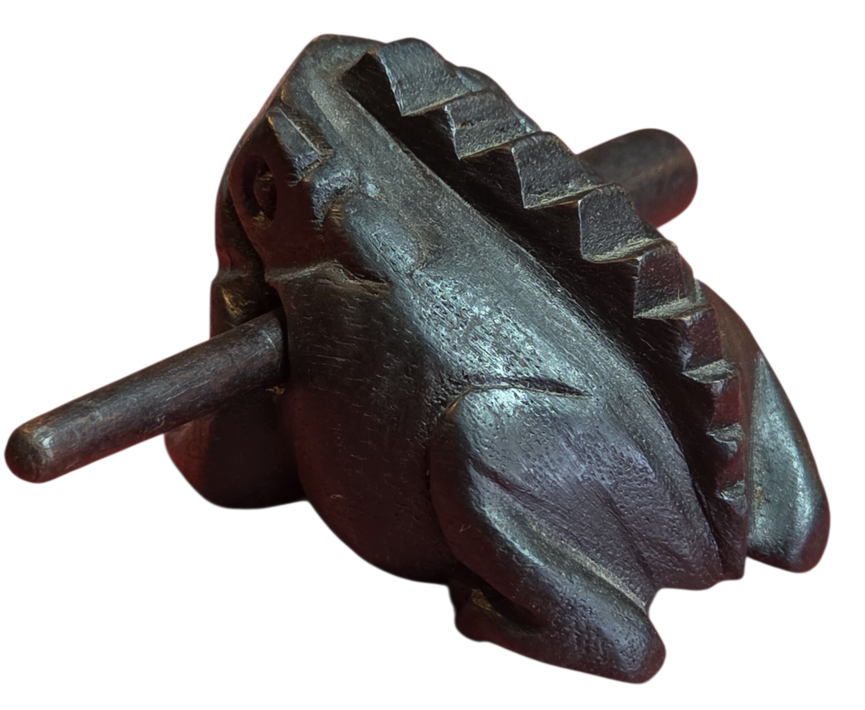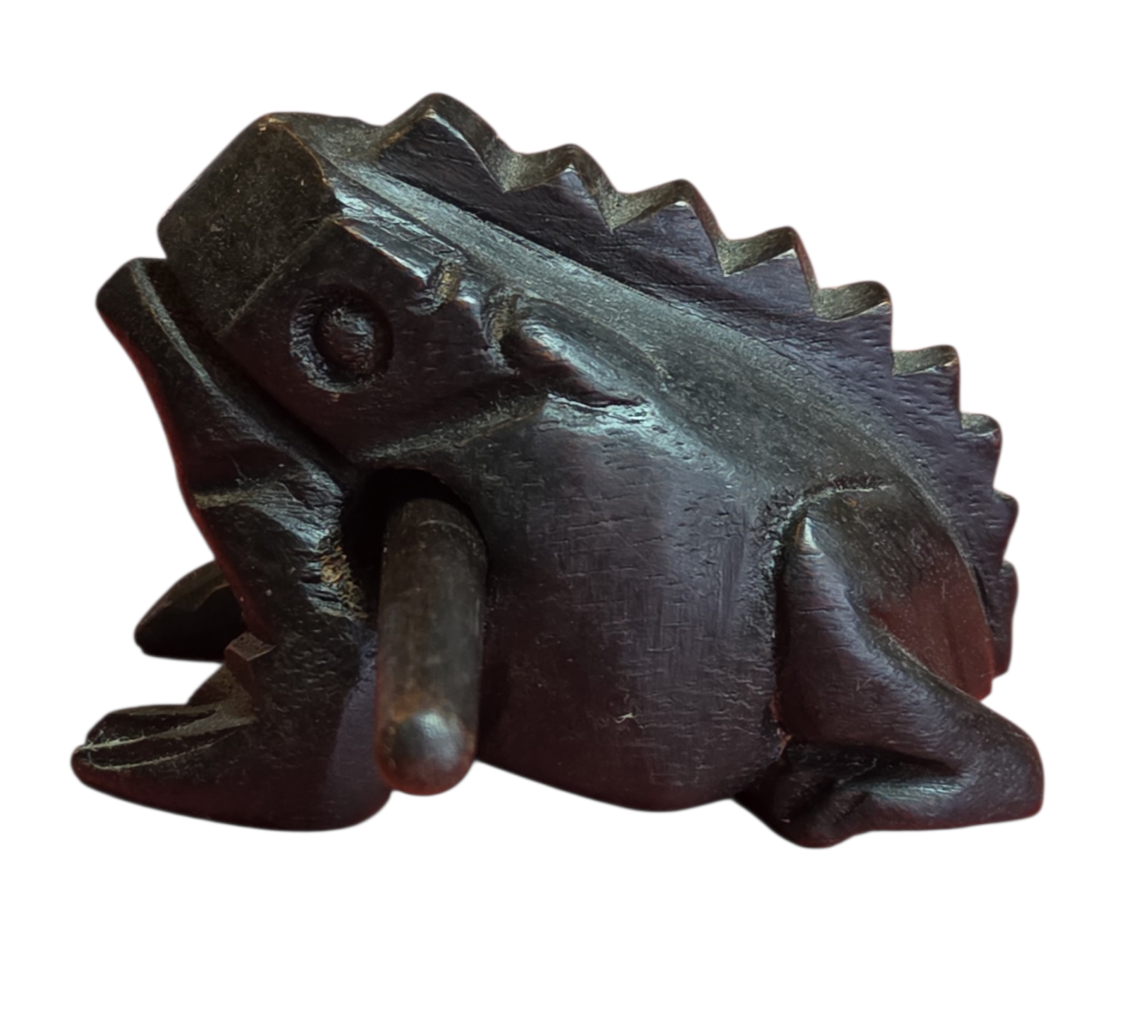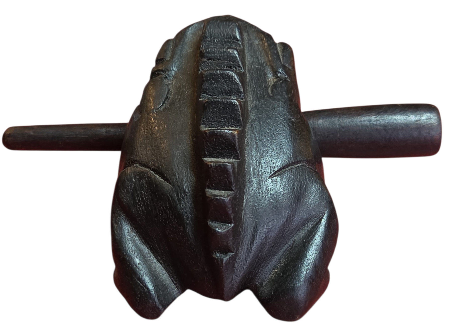 Este encantador sapinho não é apenas um item decorativo, mas um instrumento musical de percussão. Ao deslizar a baqueta de madeira pelas ranhuras em suas costas, ele reproduz um som que imita perfeitamente o coaxar de um sapo.