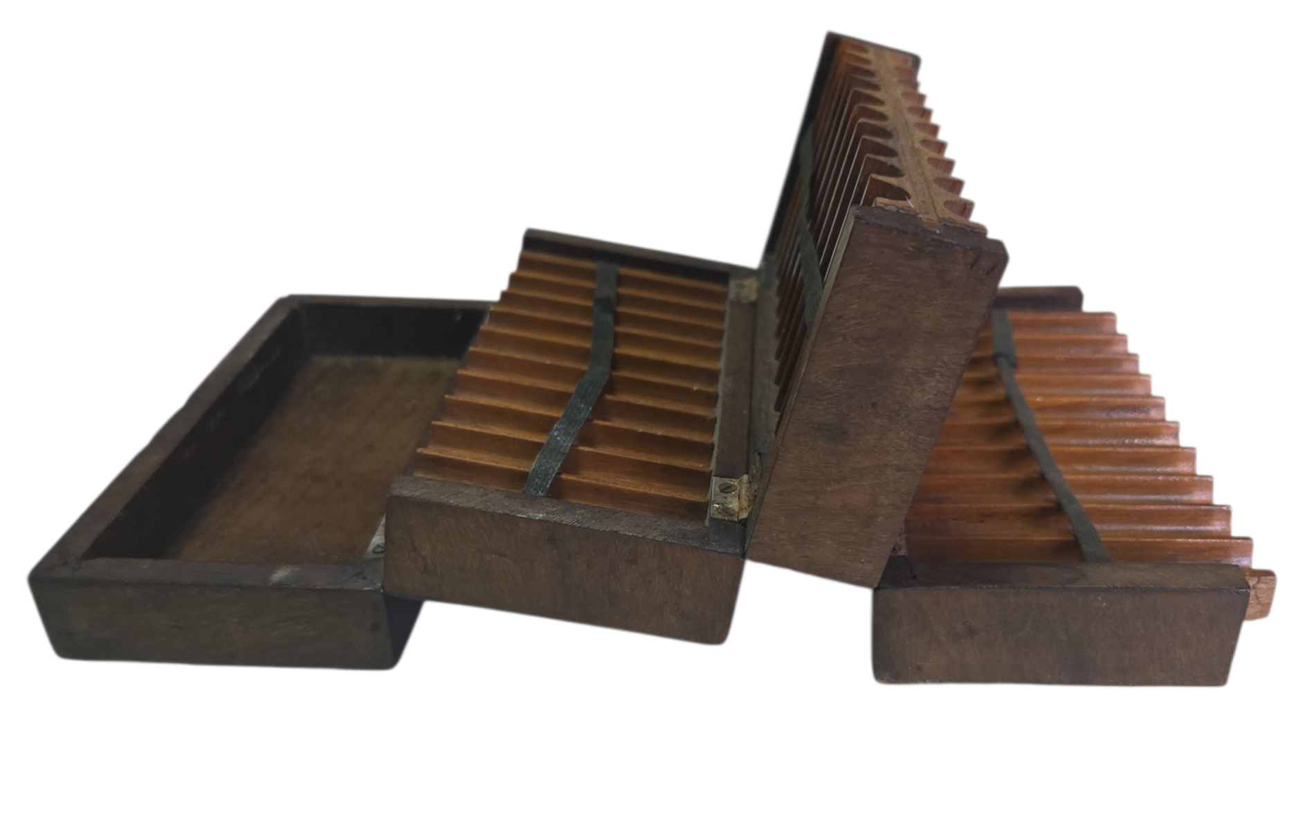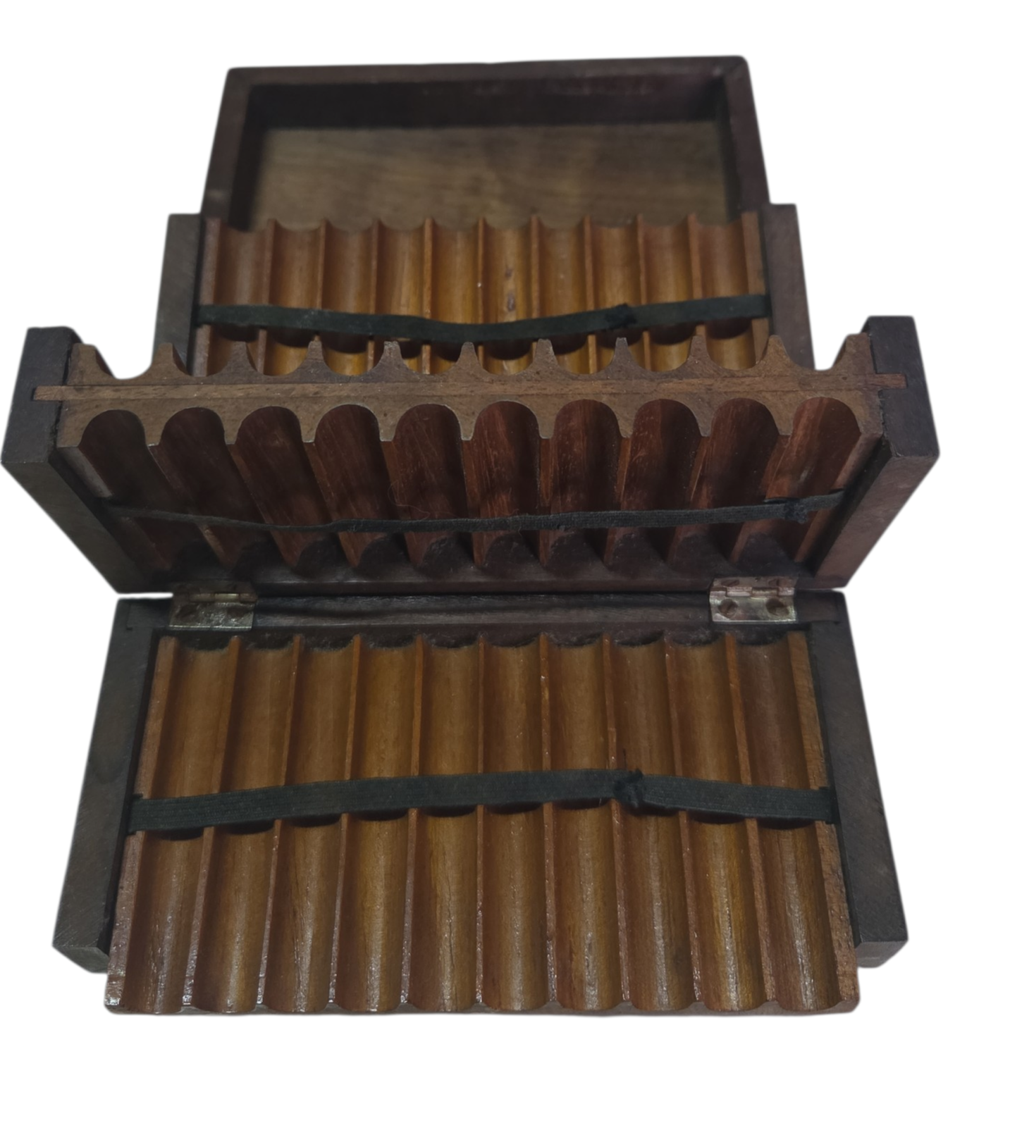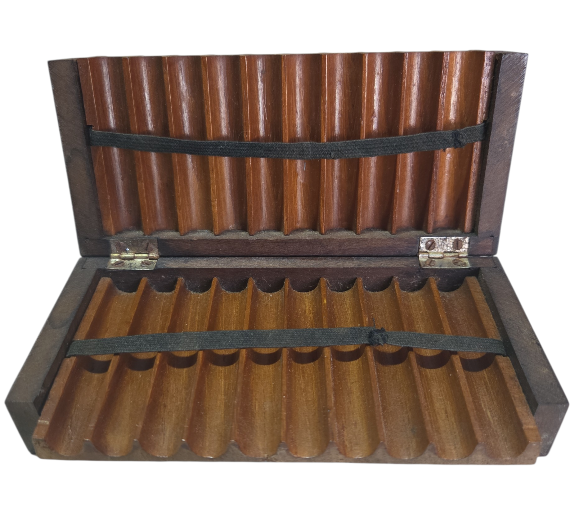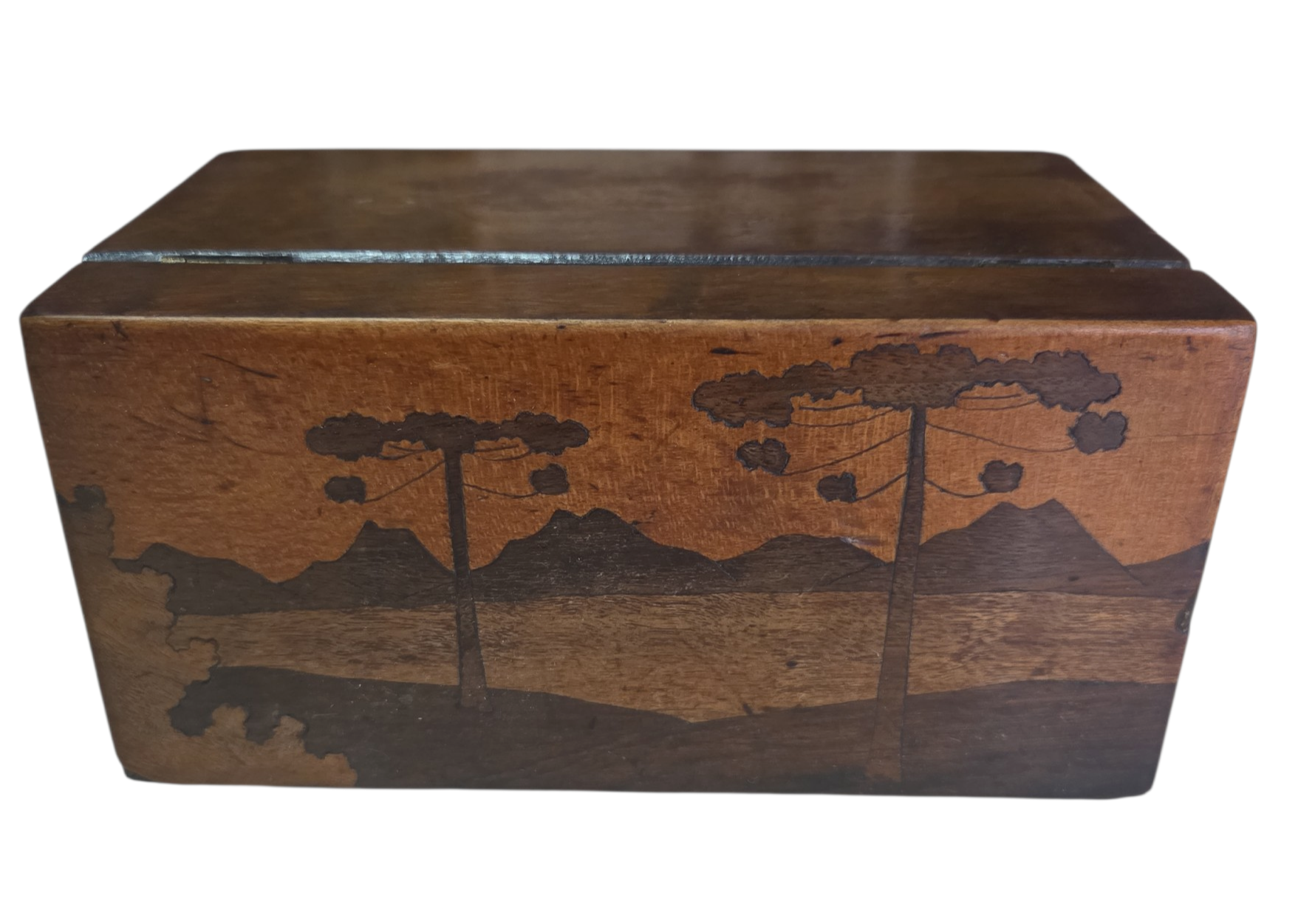 Uma verdadeira obra de arte em miniatura. Este porta-cigarreira apresenta um trabalho primoroso de marchetaria, retratando a icónica silhueta das araucárias com diferentes tonalidades de madeira natural. A precisão dos encaixes e a escolha dos veios da madeira criam uma profundidade única, tornando esta peça um item de destaque para colecionadores e amantes da cultura regional.