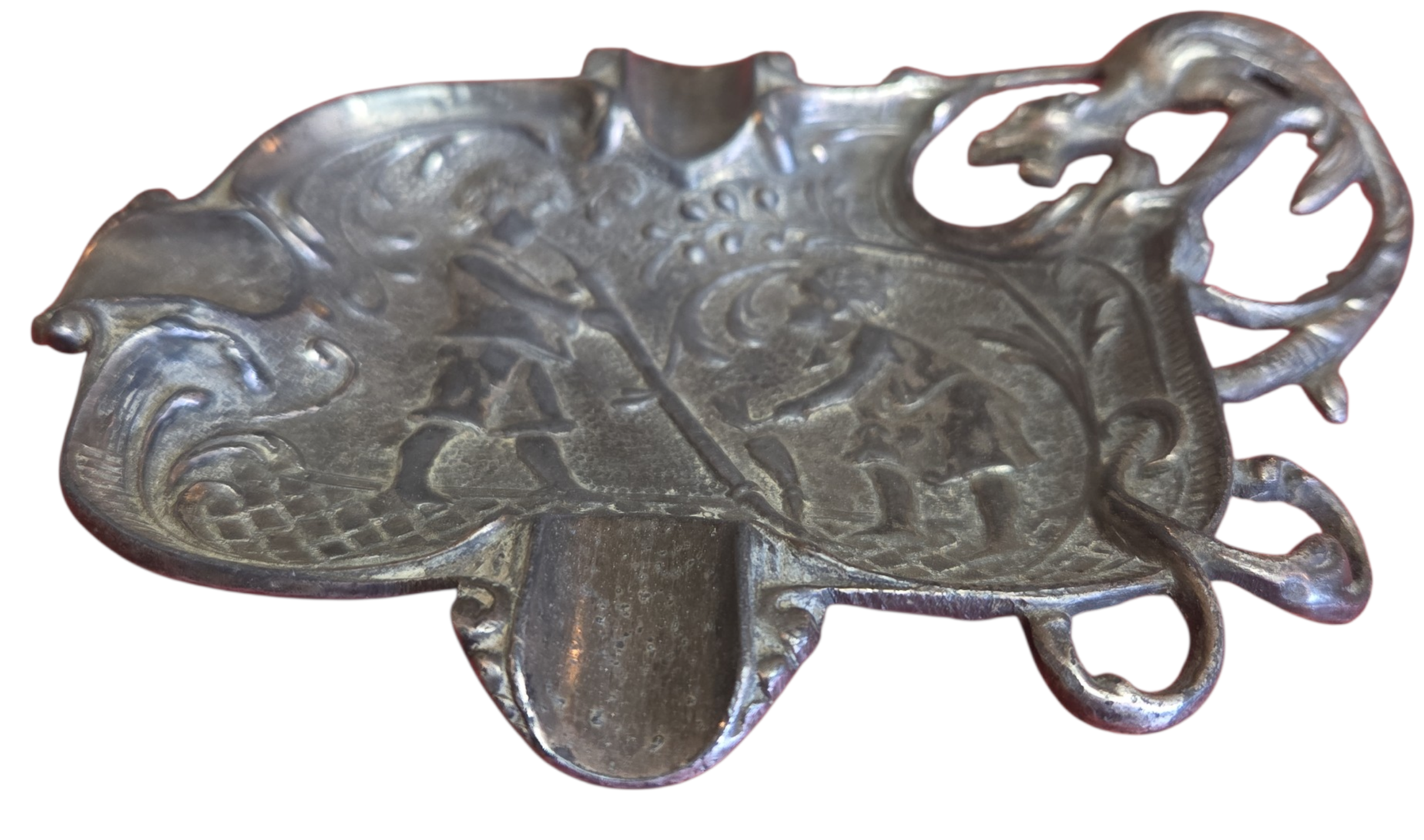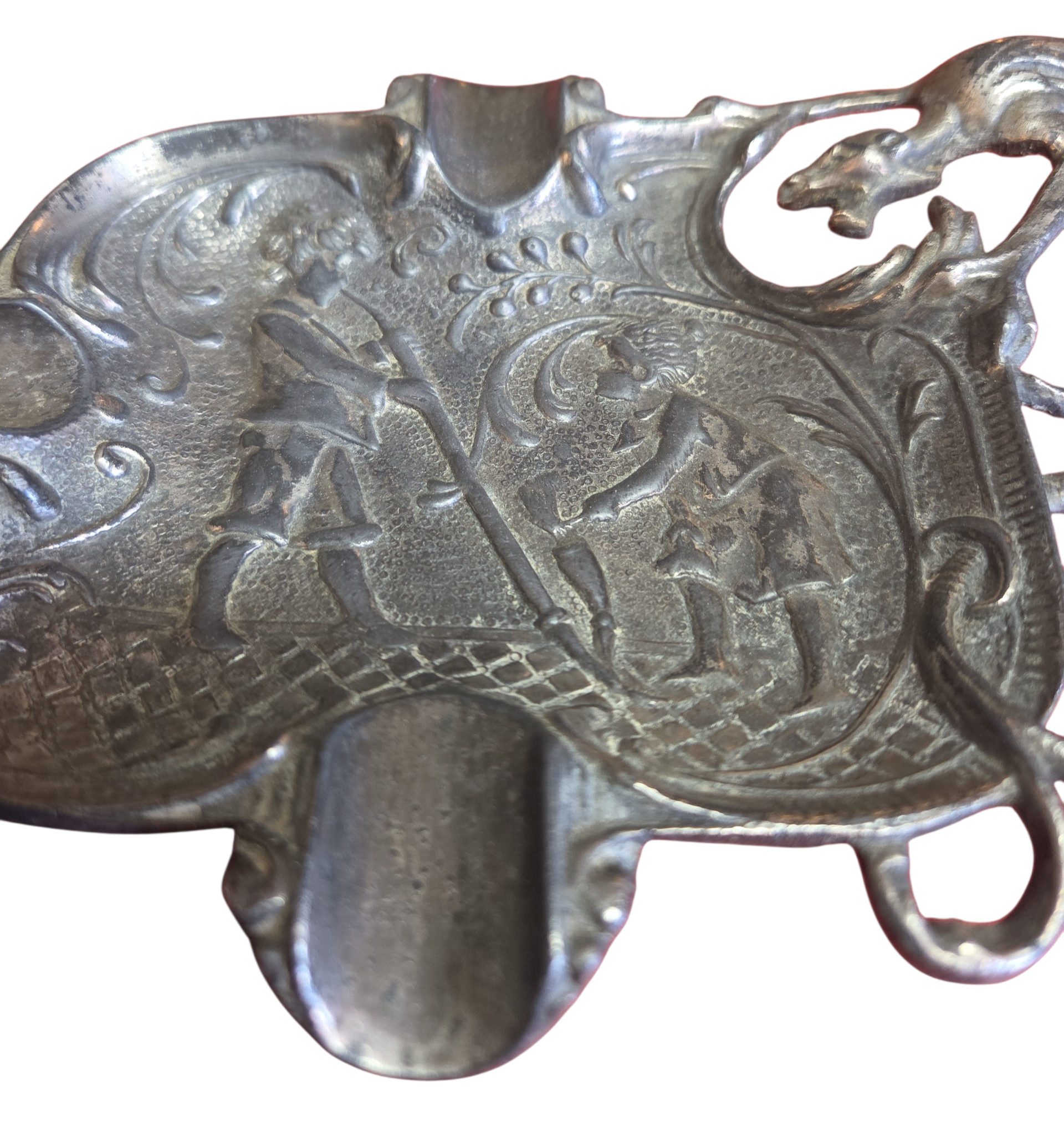 Apresentamos um refinado cinzeiro de coleção, produzido em metal com acabamento oxidado. A peça destaca-se pela sua complexidade artística e formato irregular, fugindo do padrão circular comum.