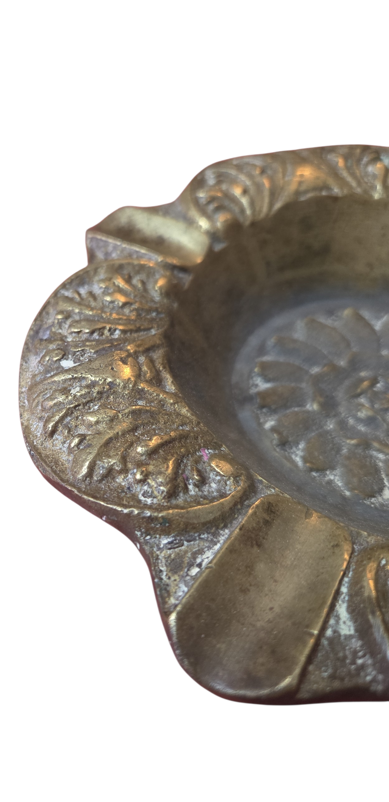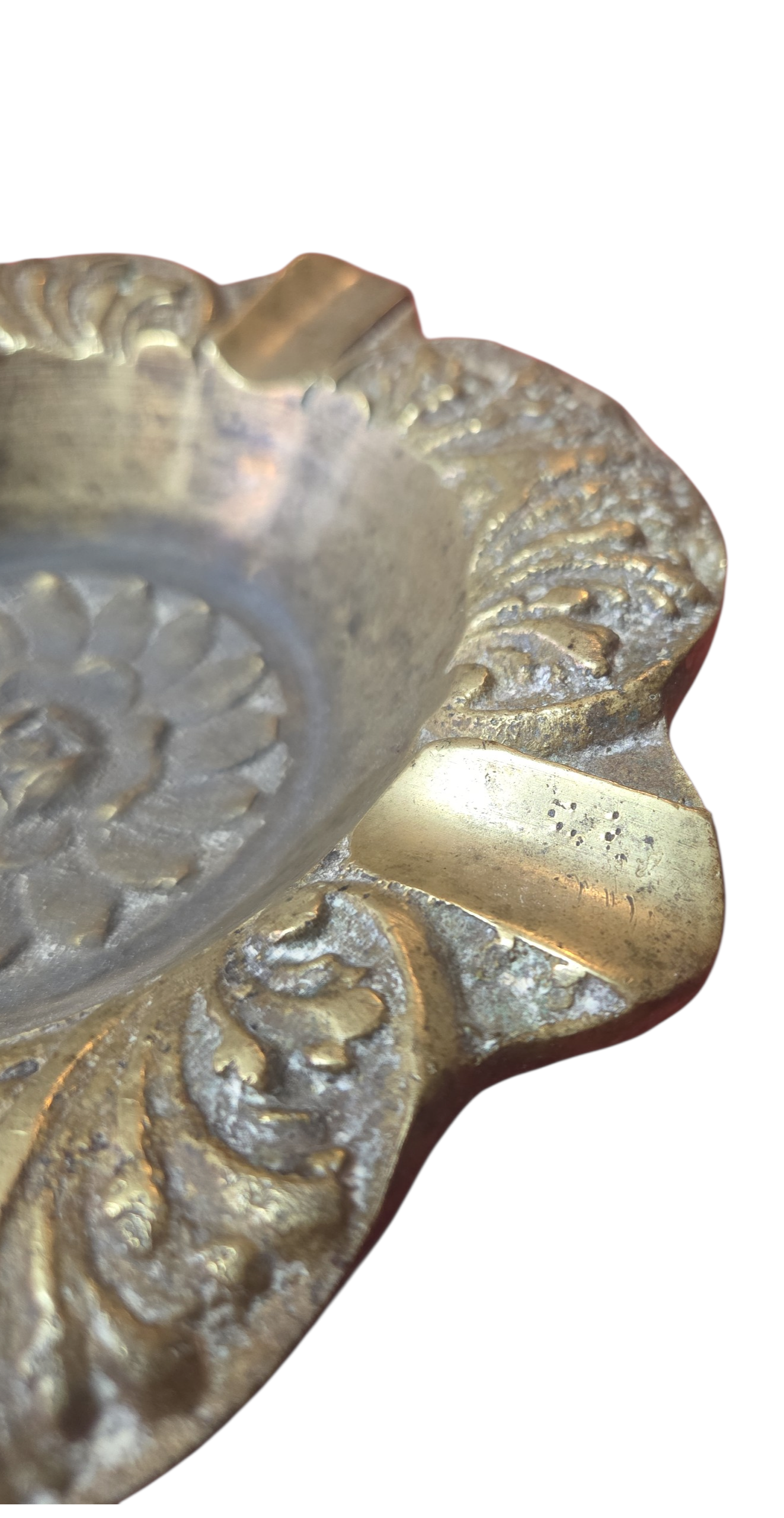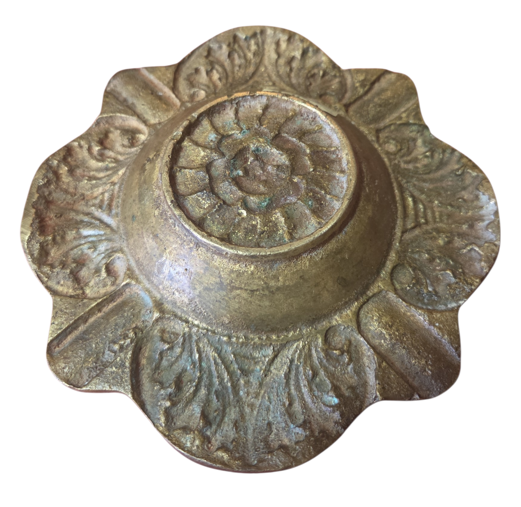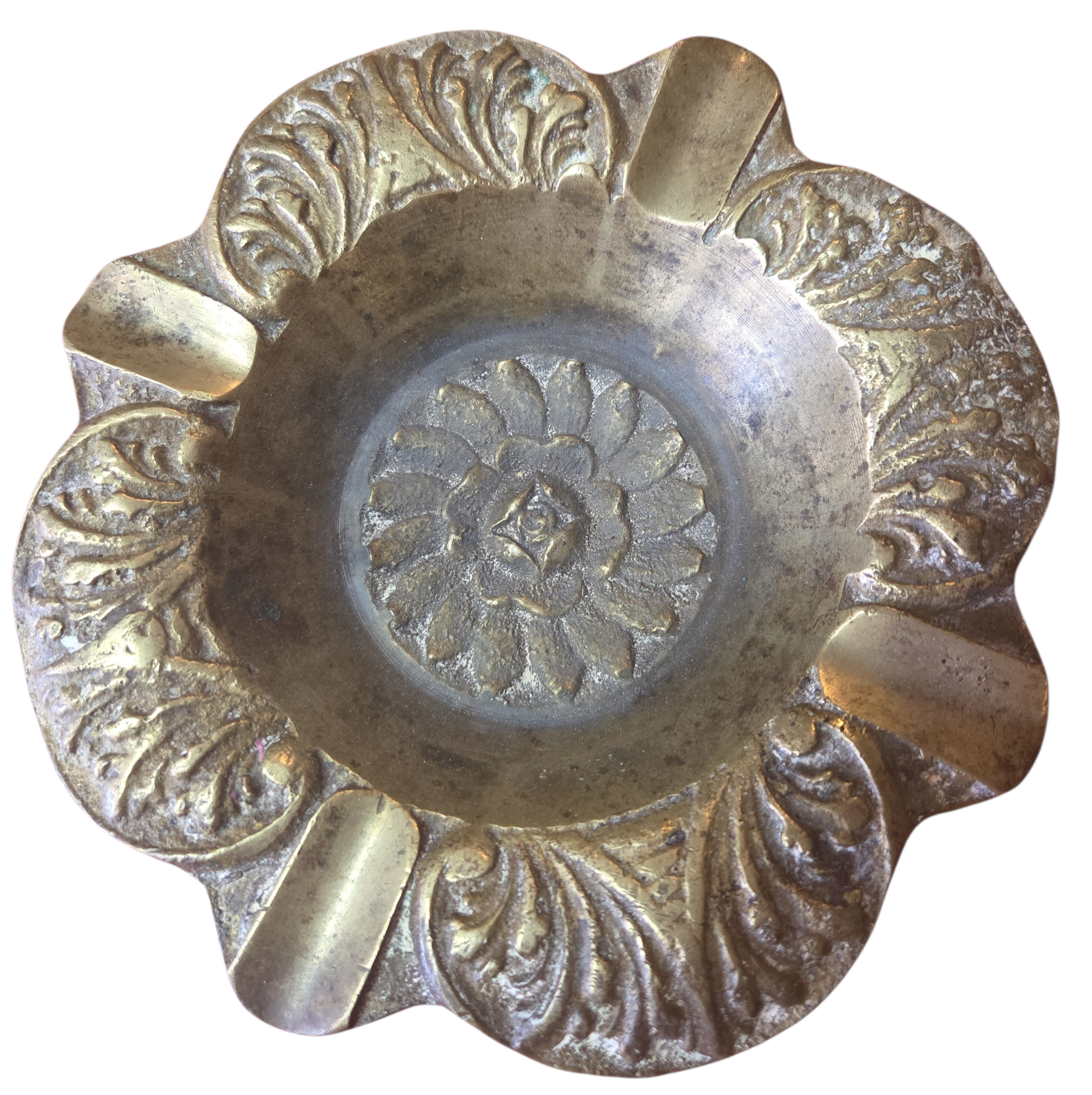 Elegância e durabilidade se unem neste cinzeiro circular em bronze trabalhado. O fundo exibe uma belíssima flor central em relevo, cercada por bordas ricamente adornadas com folhas de acanto, típicas do estilo clássico europeu.