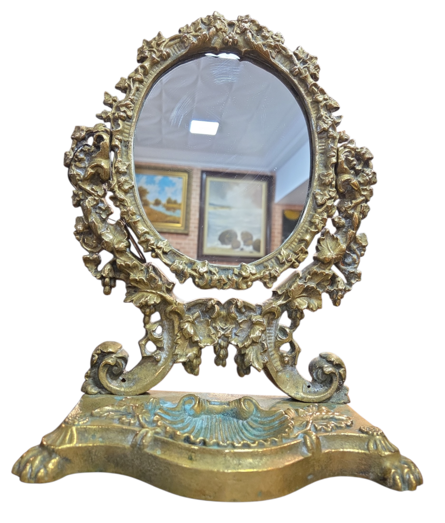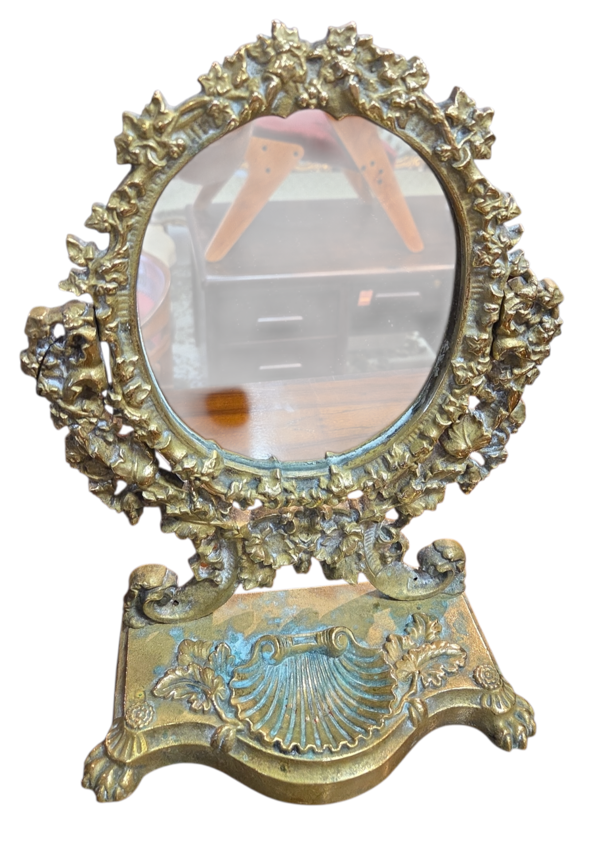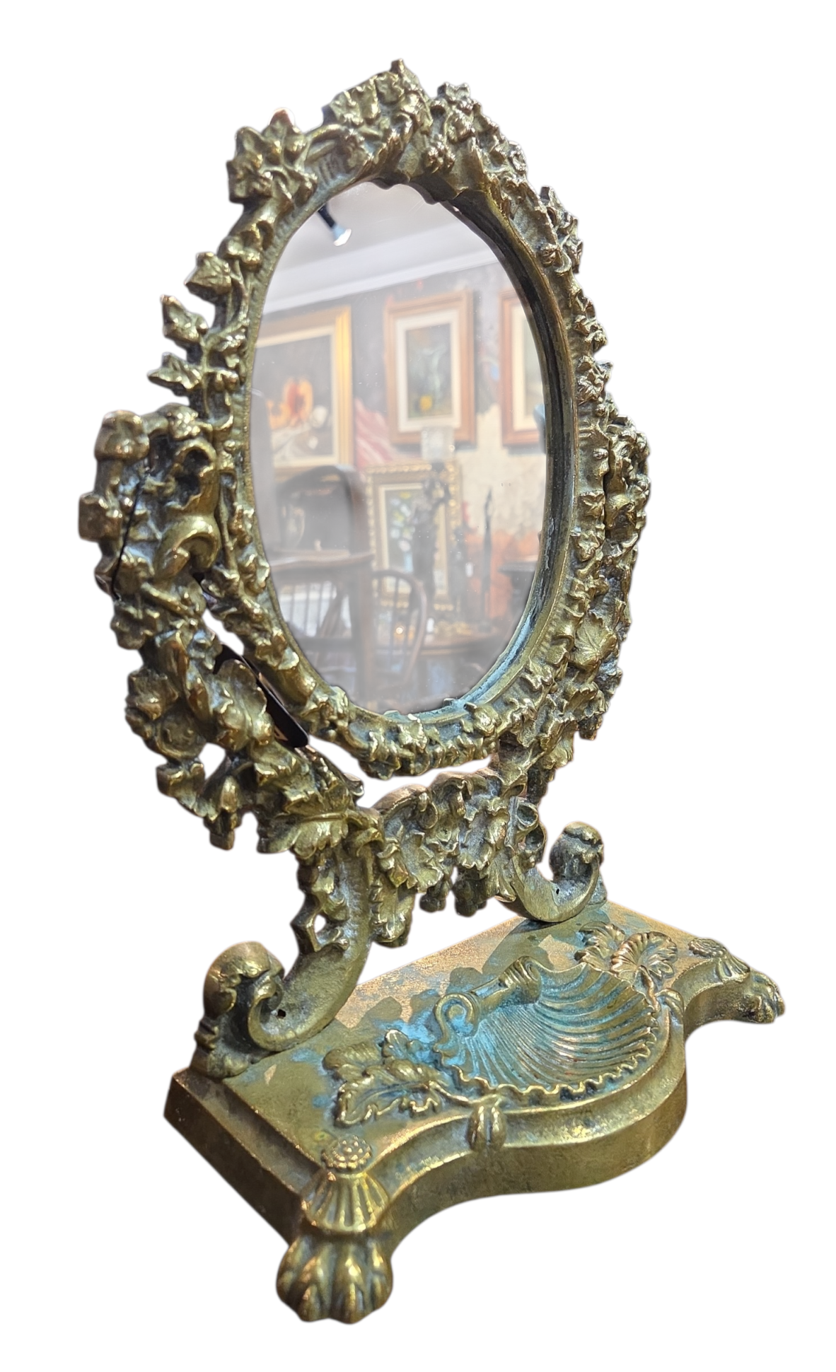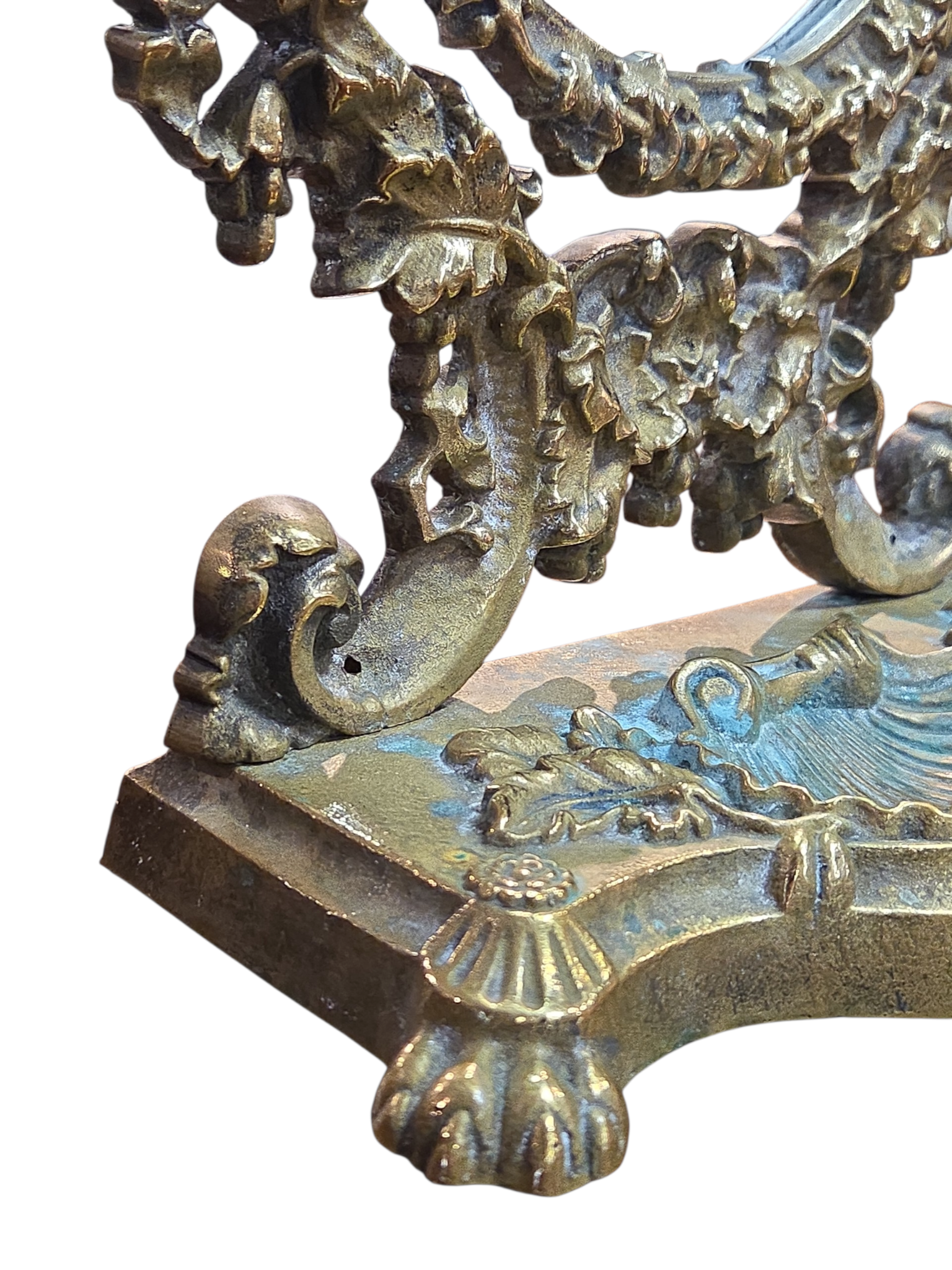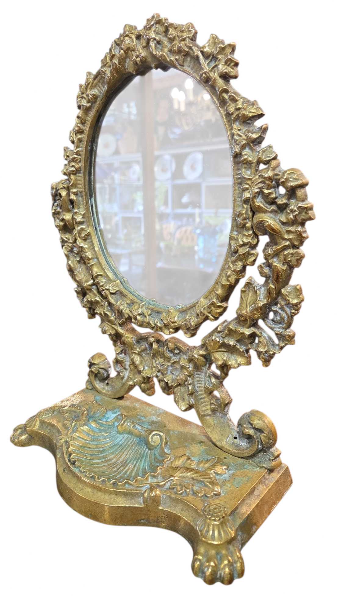 Elegante espelho de mesa basculante (psiquê) confeccionado integralmente em bronze maciço, apresentando um trabalho de fundição detalhado com rica ornamentação