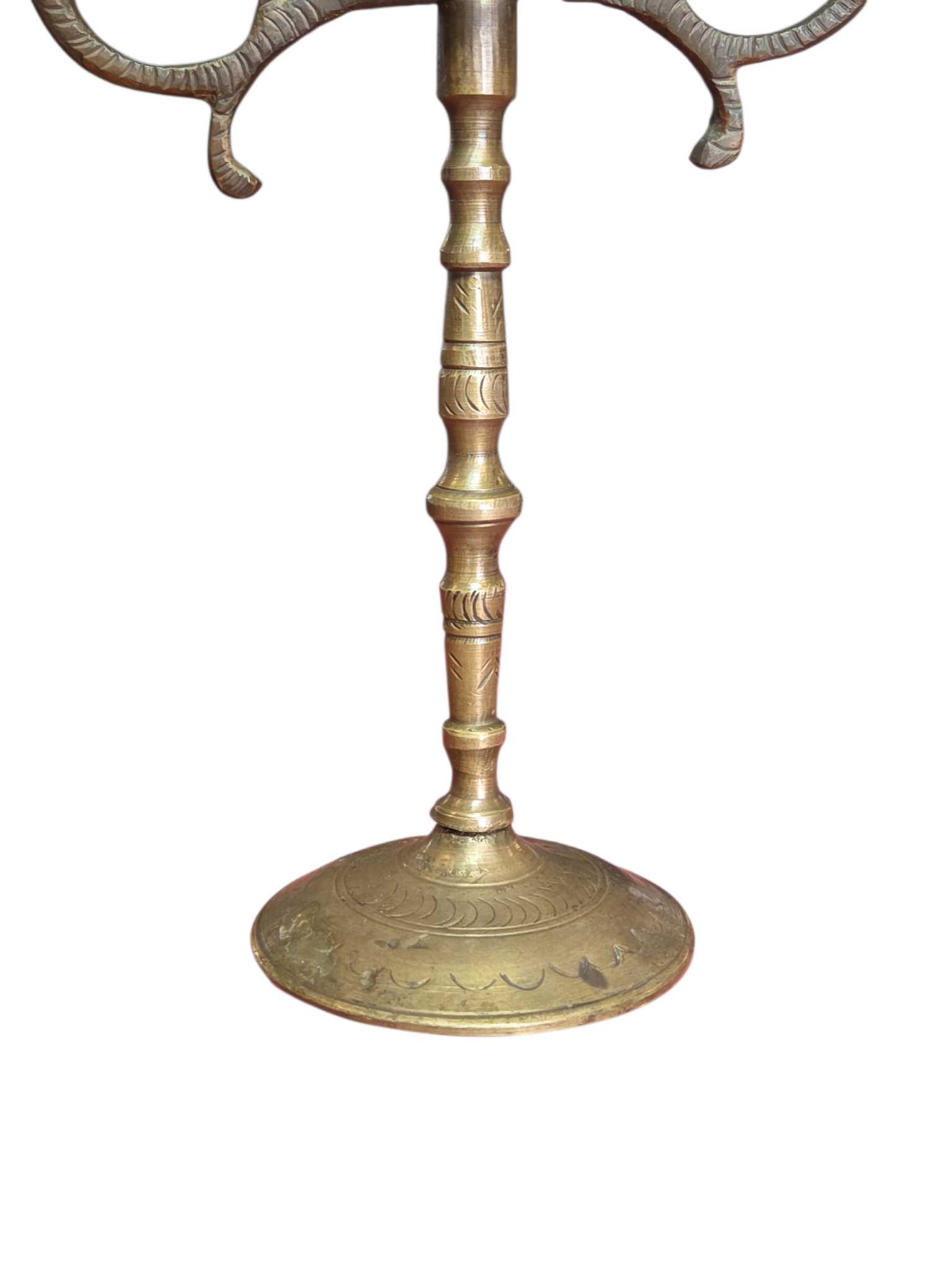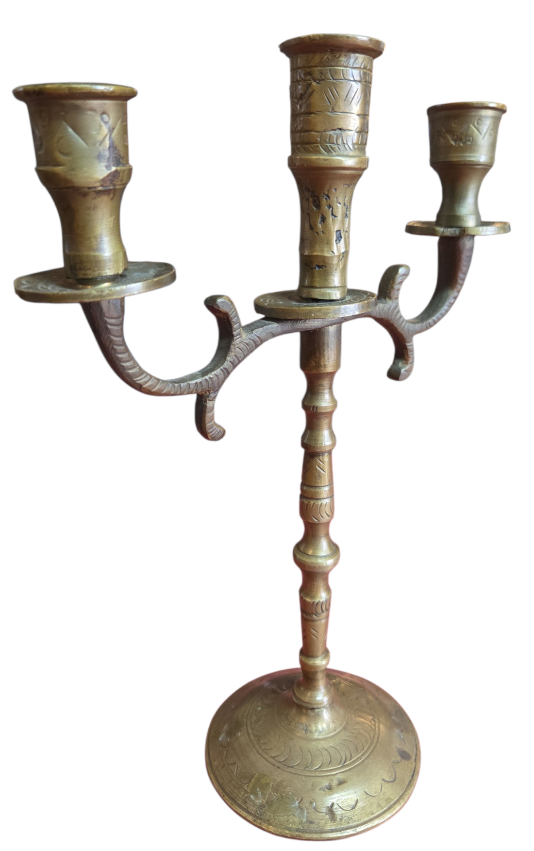 Candelabro vintage de 3 braços em bronze maciço, uma peça autêntica com a beleza da passagem do tempo visível na sua pátina natural. Perfeito para adicionar um toque de elegância rústica e história a qualquer ambiente. Ideal para decoração de mesas de jantar, aparadores ou como item de colecionador.