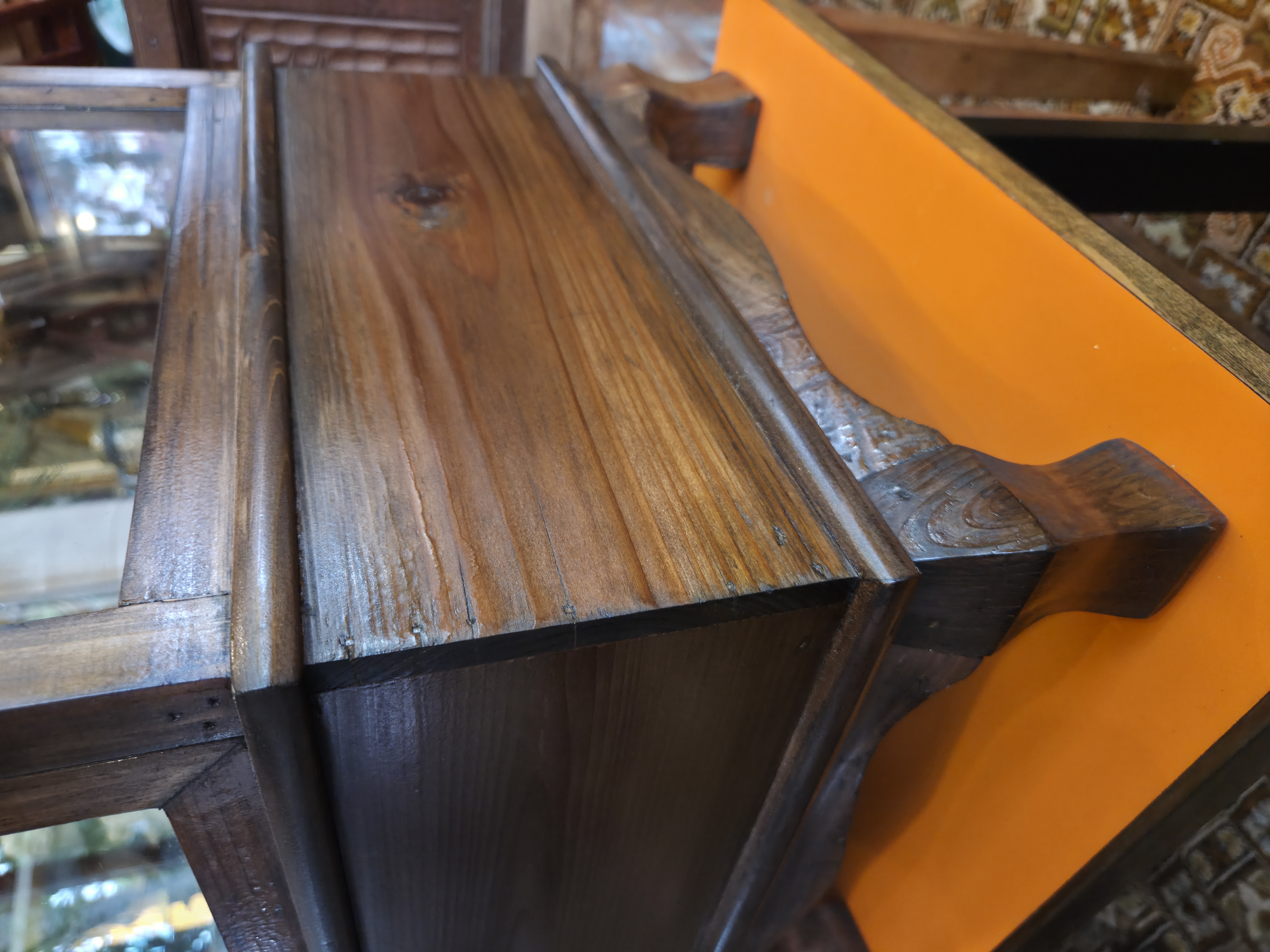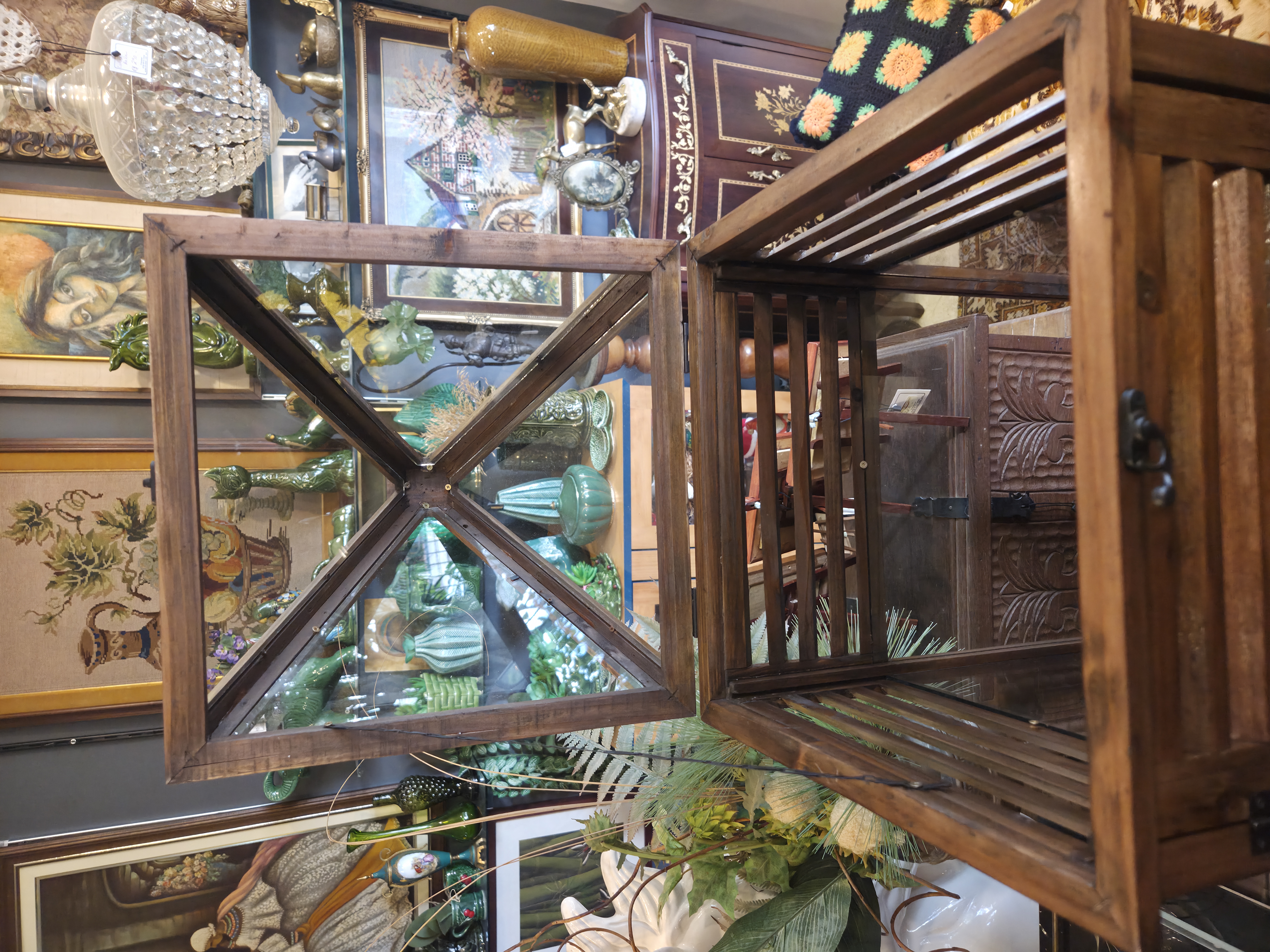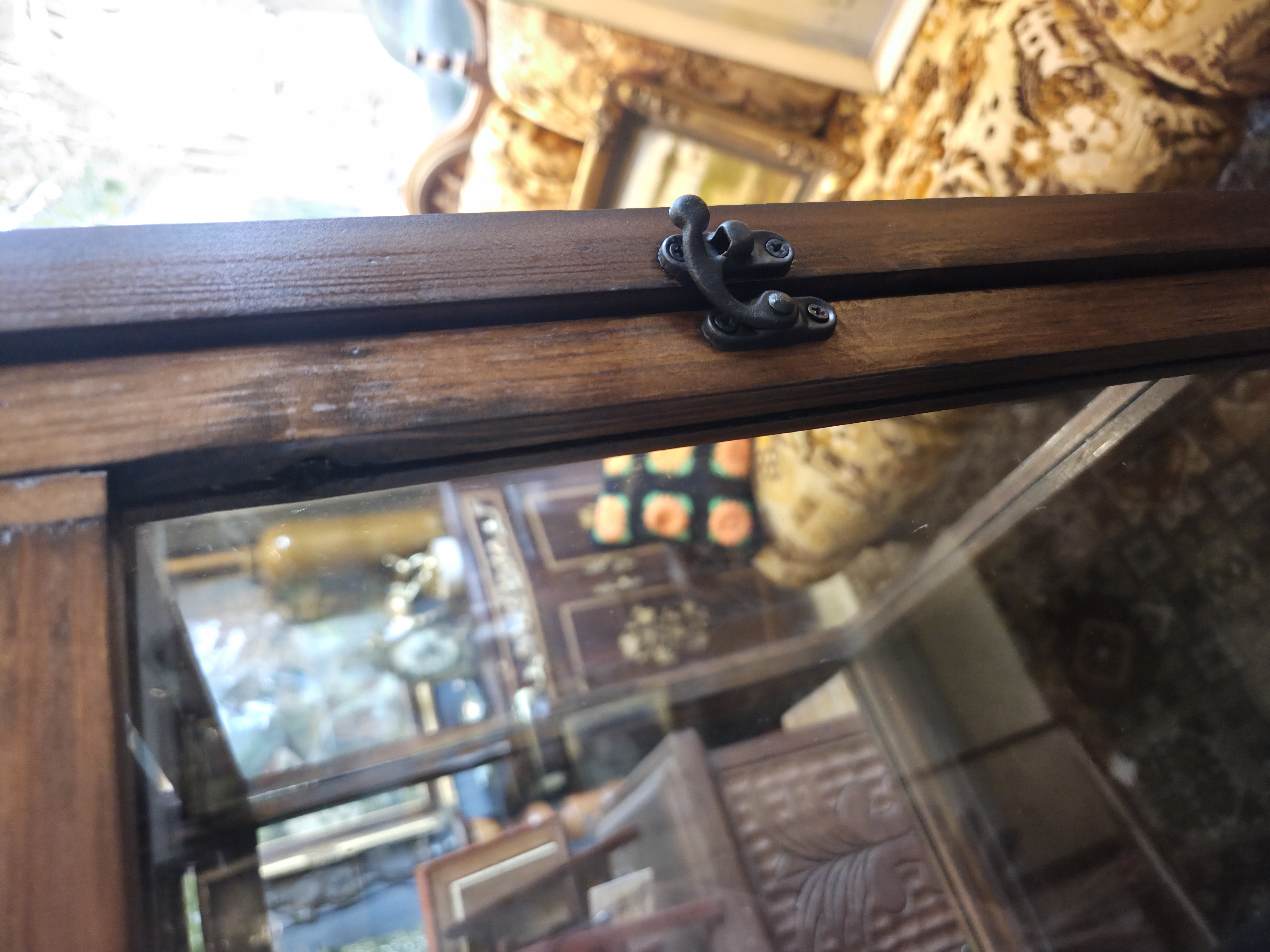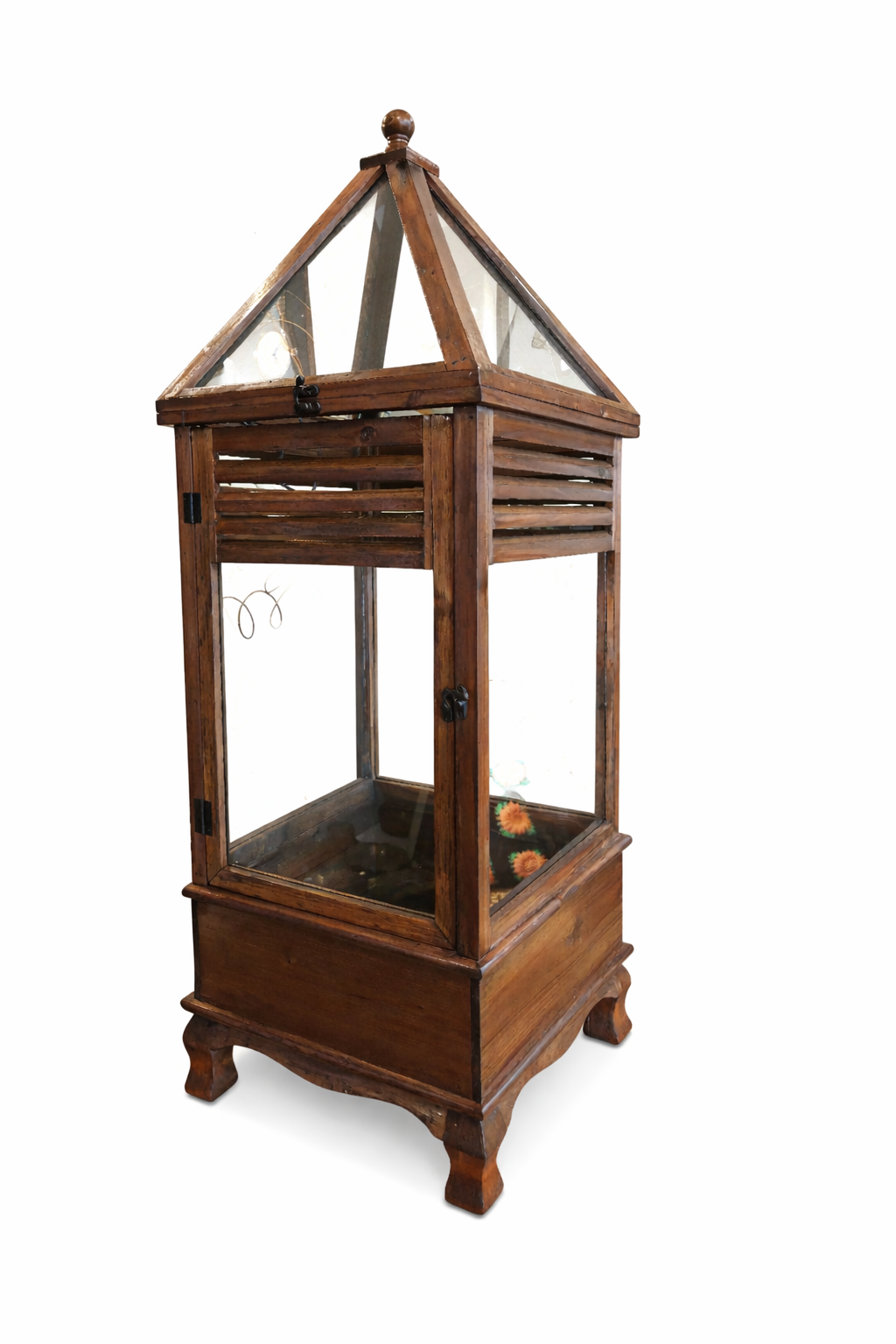 Lanterna antiga confeccionada em madeira e vidro. Peça de grandes dimensões, com presença marcante. Muito utilizada na decoração como floreira, estufa ou para montagem de terrários. Ideal para composições rústicas ou clássicas.