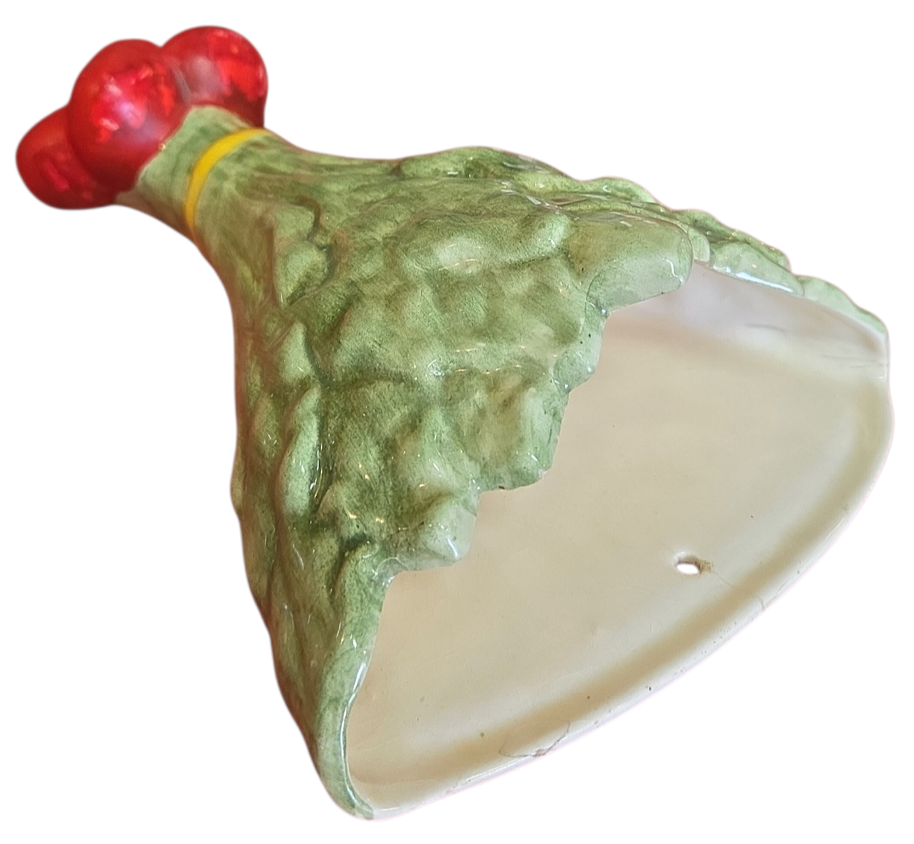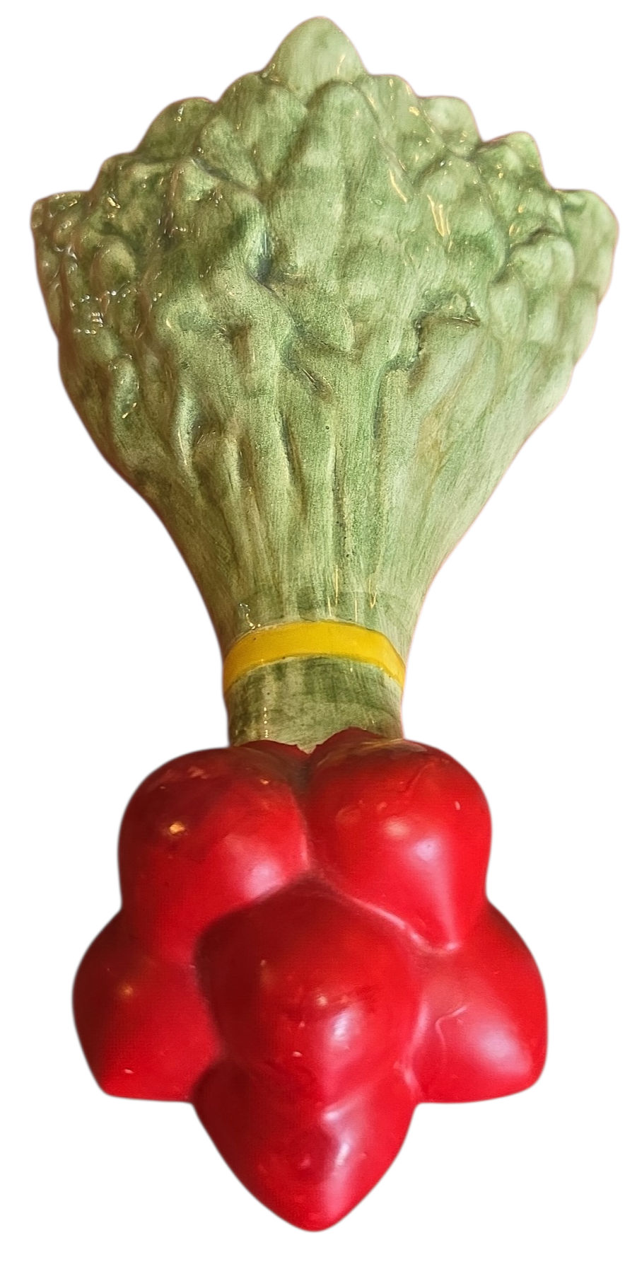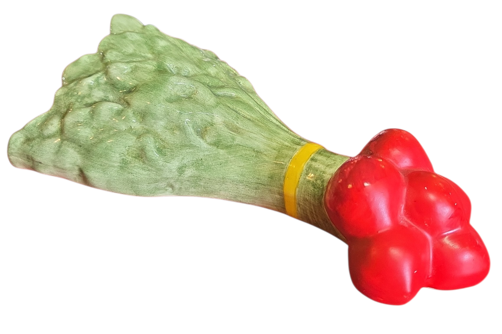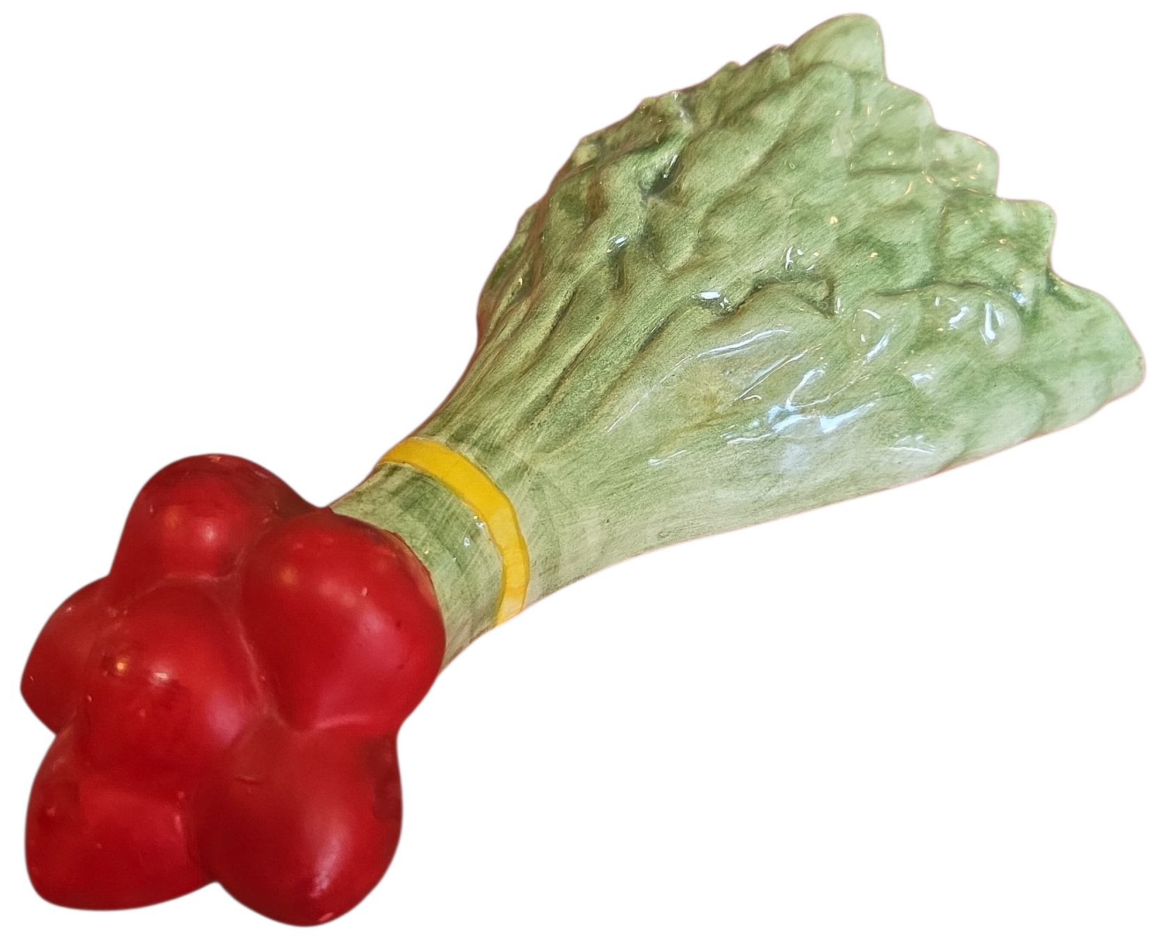 Exclusivo vaso de parede (pocket wall vase) em faiança vitrificada, moldado em formato figurativo de um maço de rabanetes. Esta peça combina funcionalidade com a estética cottagecore, sendo ideal para decorar cozinhas, varandas ou áreas gourmet