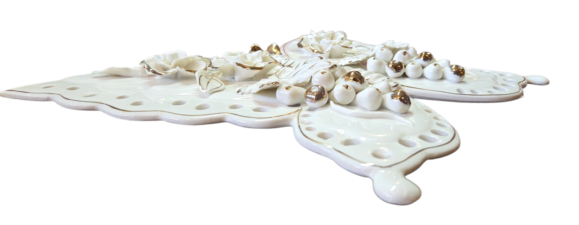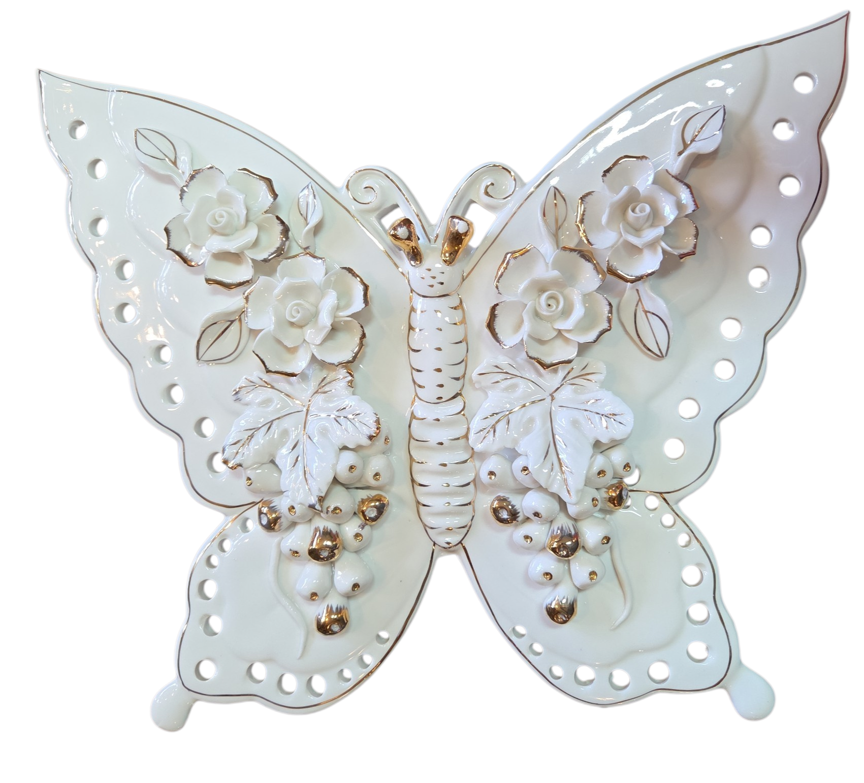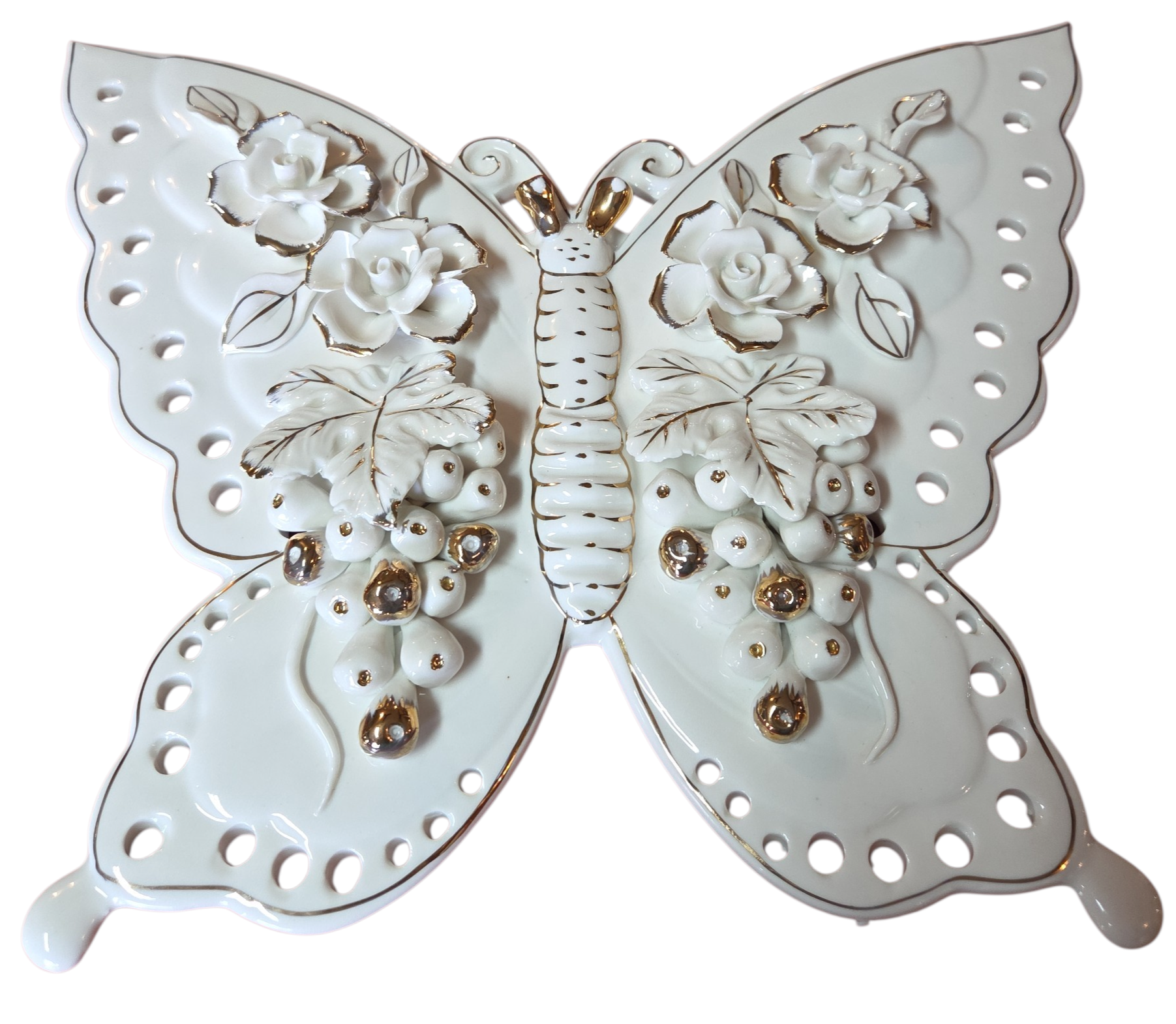 Exuberante escultura de parede ou mesa em porcelana branca vitrificada, apresentando o formato de uma borboleta com asas ricamente trabalhadas. A peça destaca-se pelo trabalho artesanal de modelagem floral em relevo, onde rosas e cachos de uva são aplicados manualmente sobre a superfície, conferindo uma textura tridimensional sofisticada.