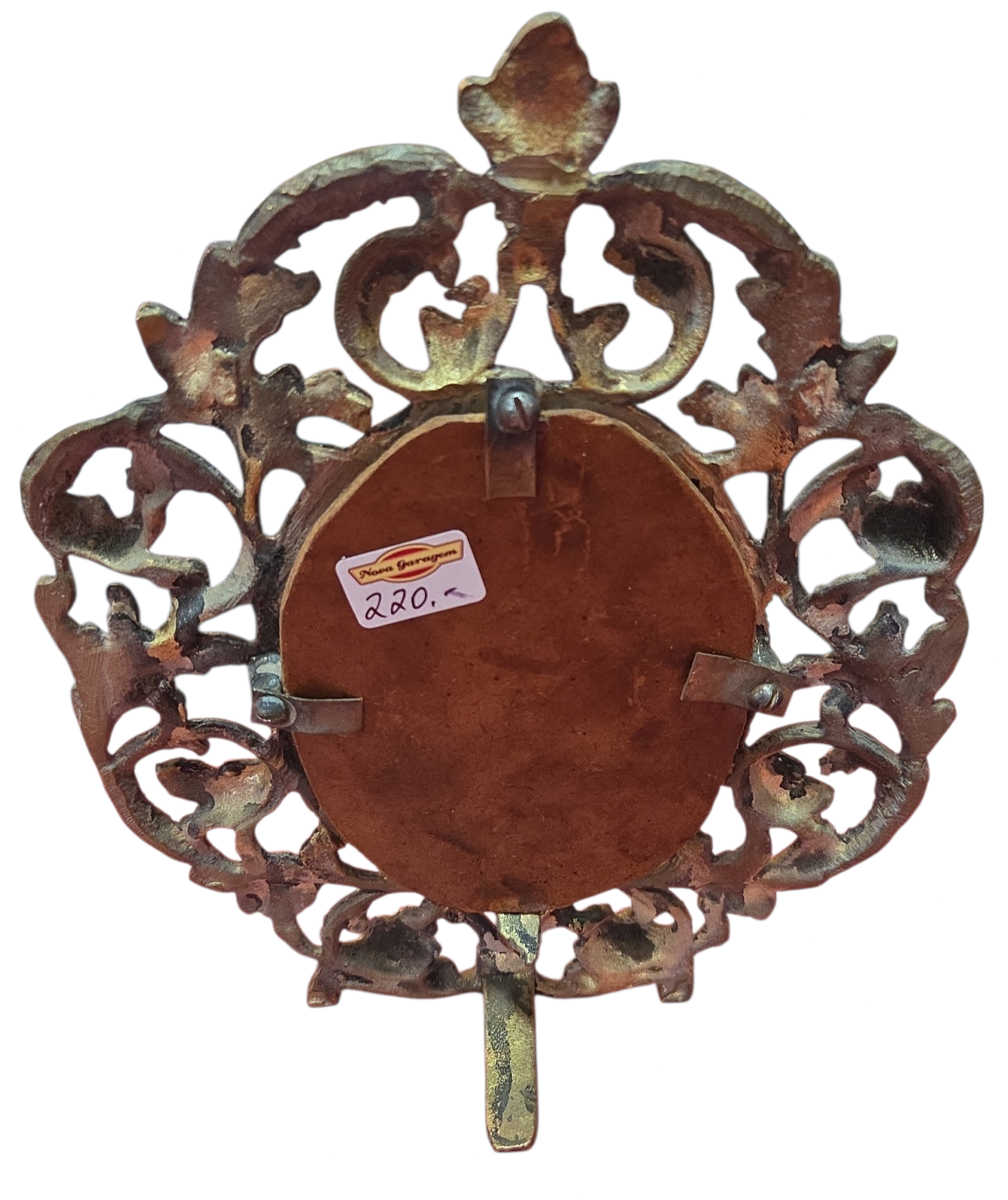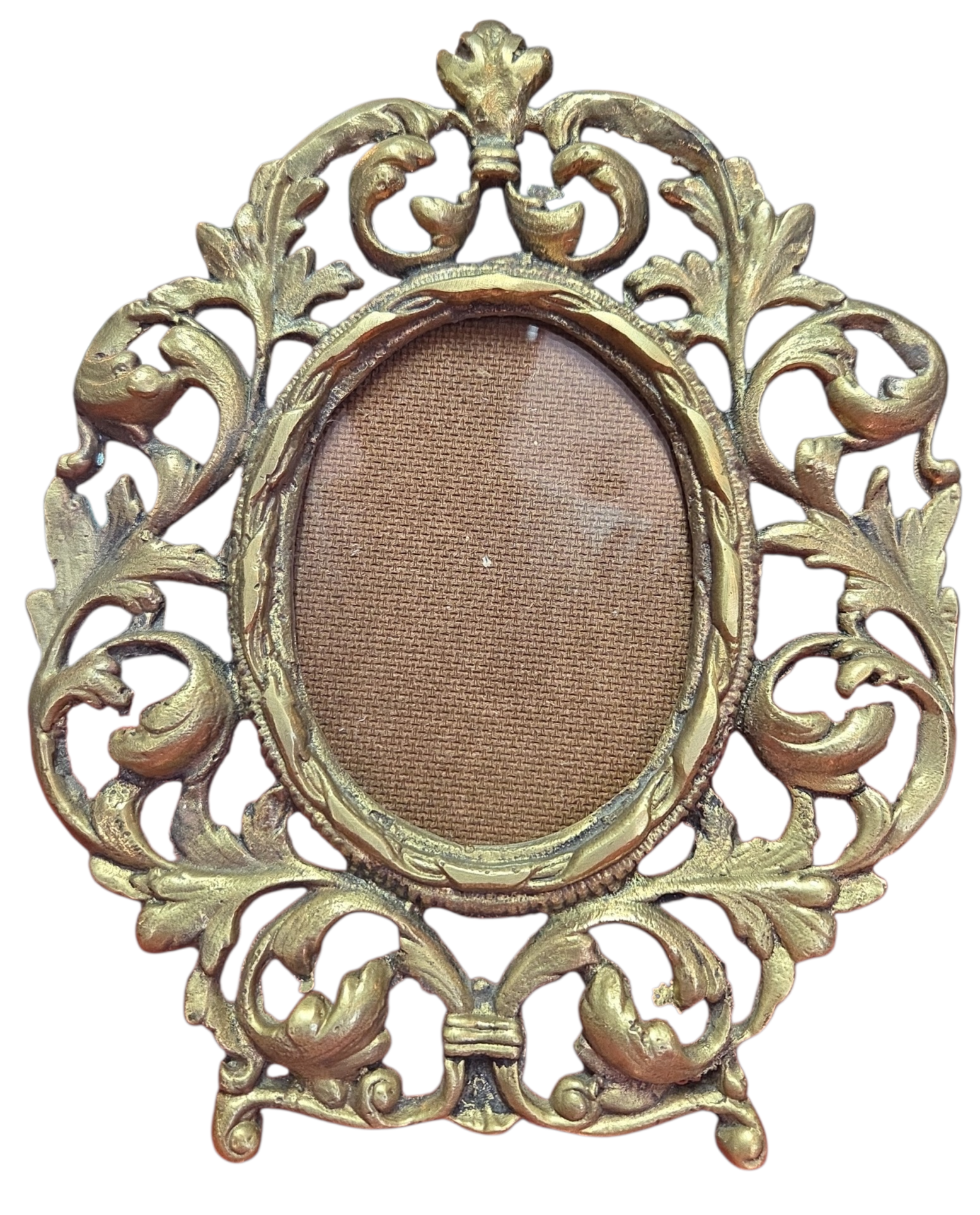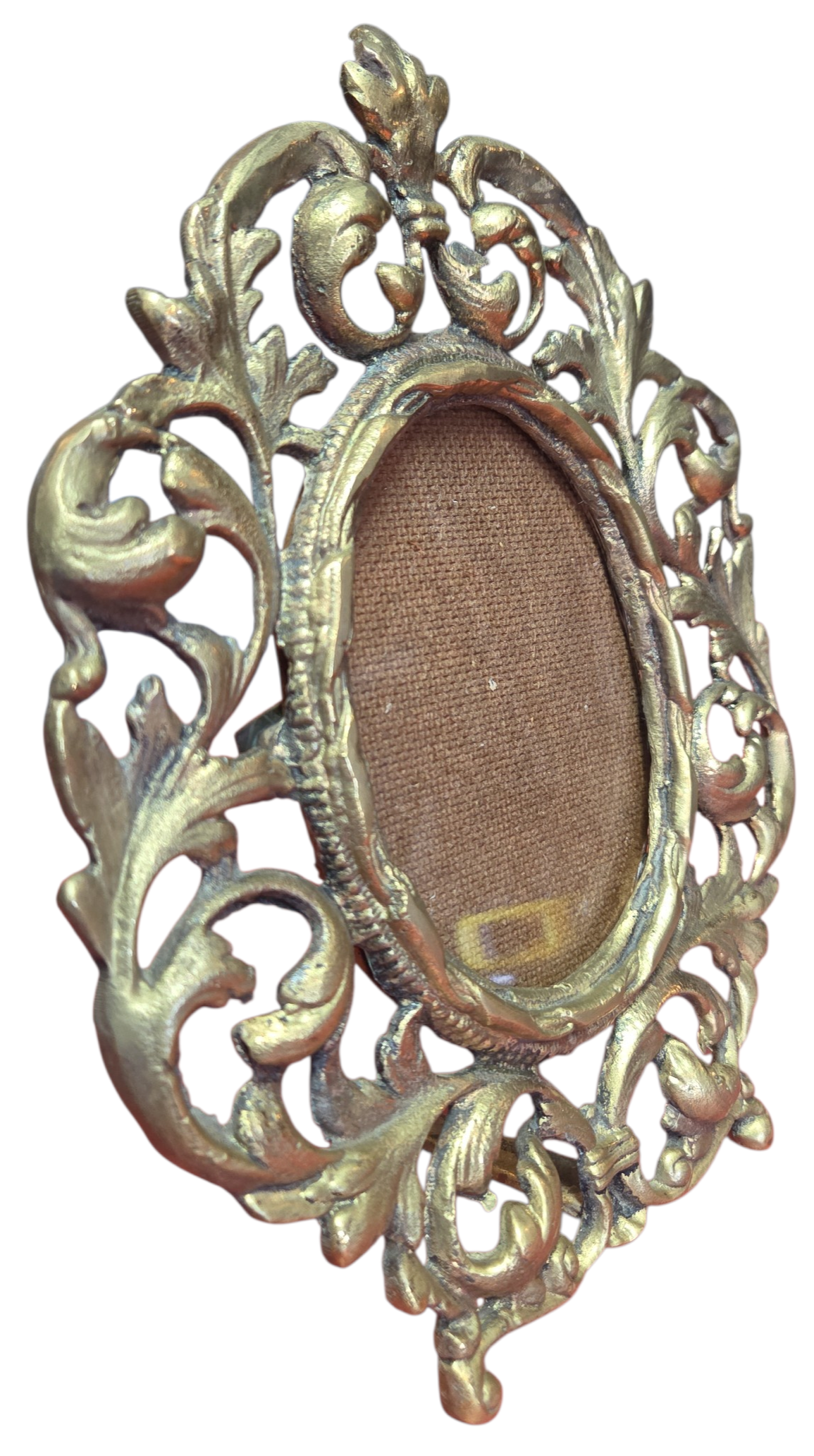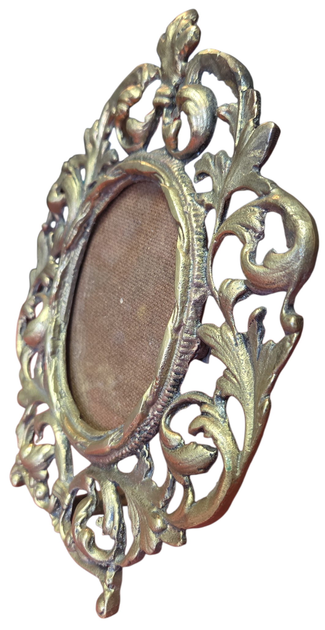 Belíssimo porta-retrato oval vertical confeccionado em bronze de alta qualidade. Esta peça apresenta um trabalho de fundição detalhado com ornamentos clássicos, ideal para compor decorações sofisticadas ou ambientes que prezam pelo estilo vintage.
