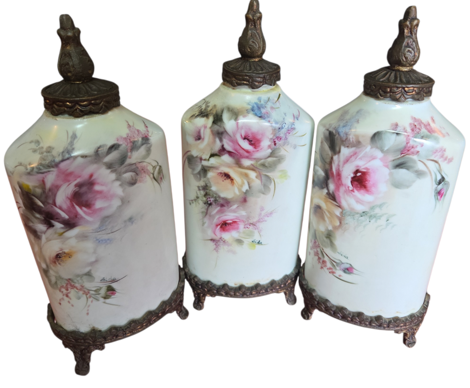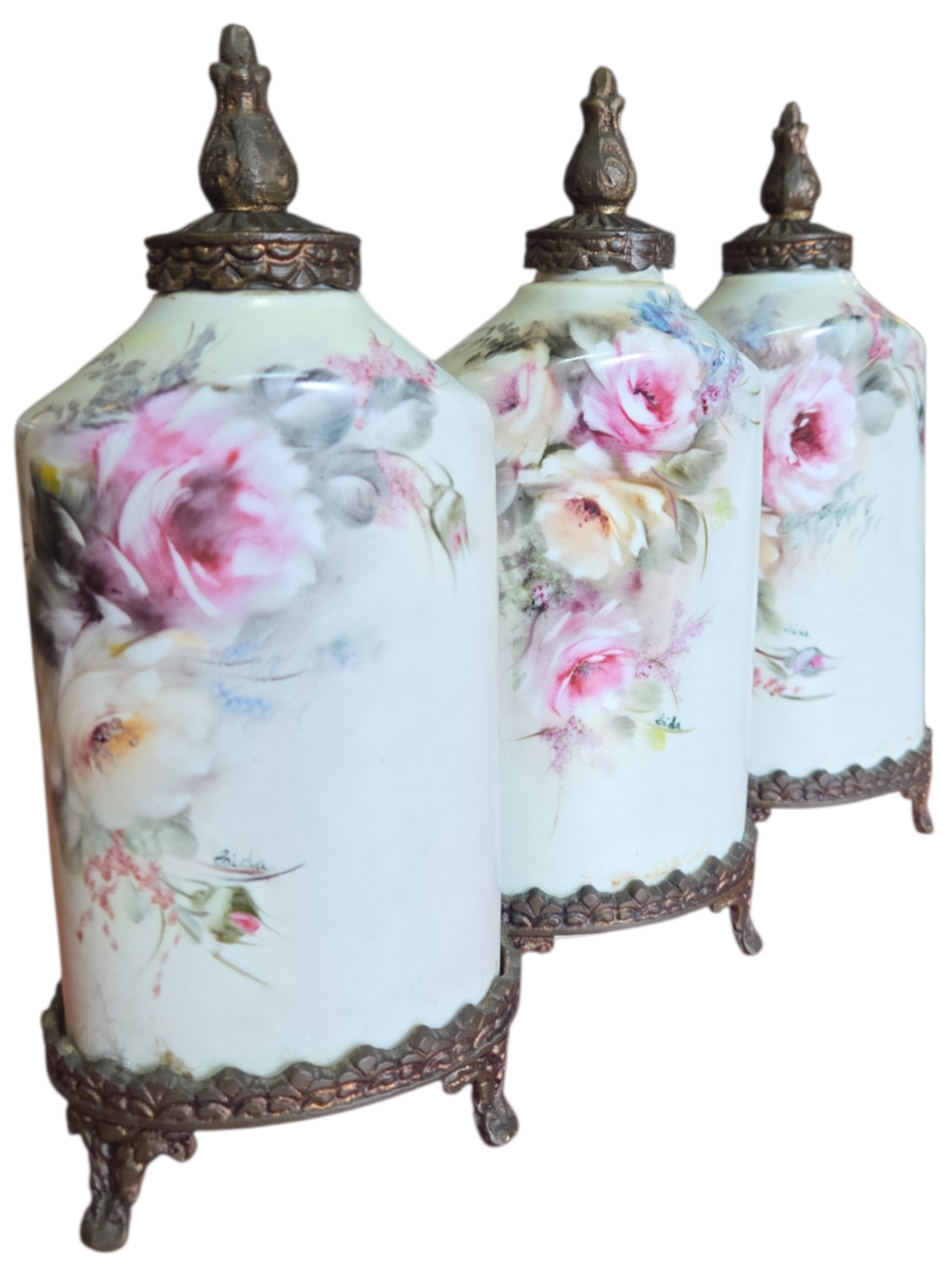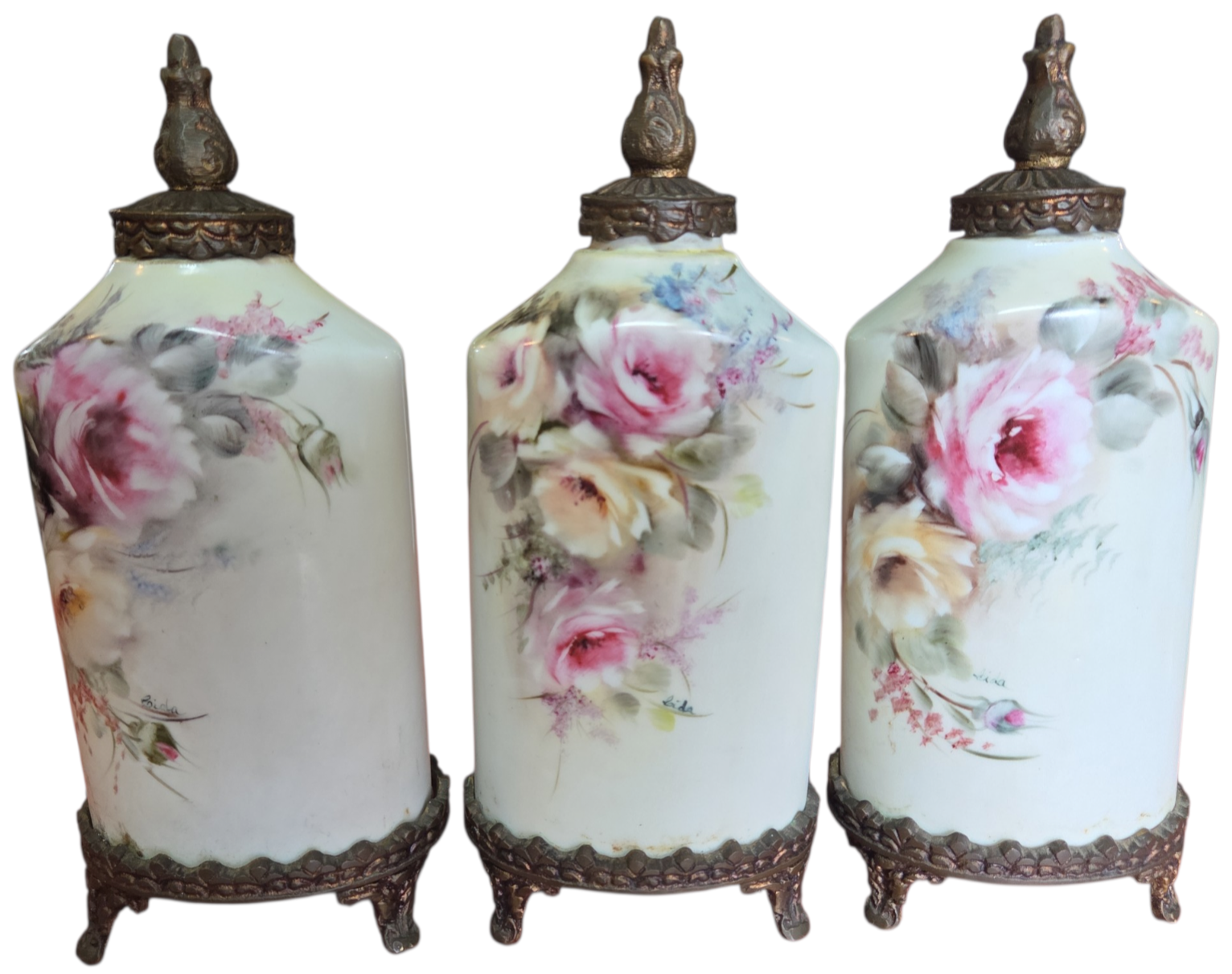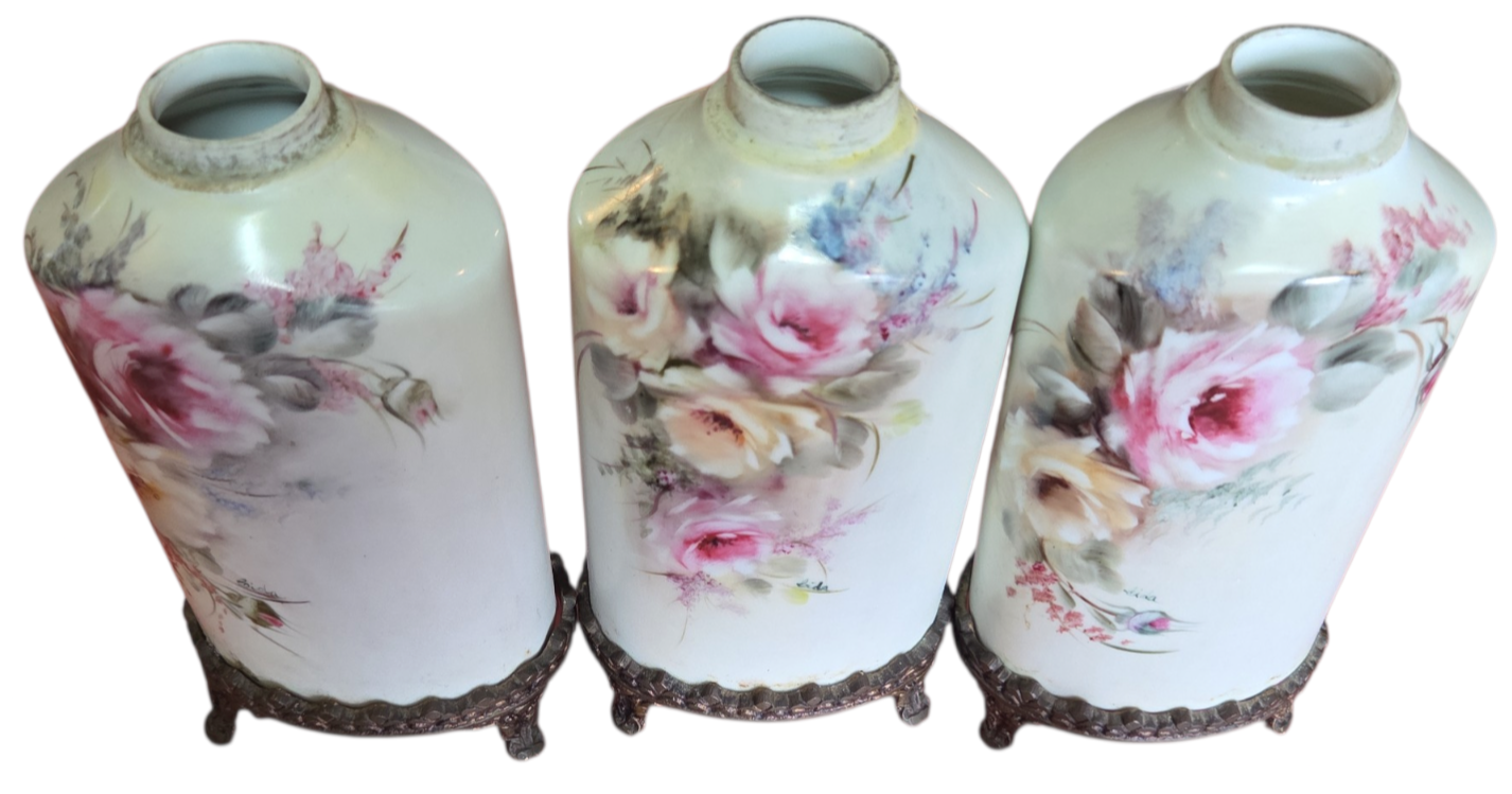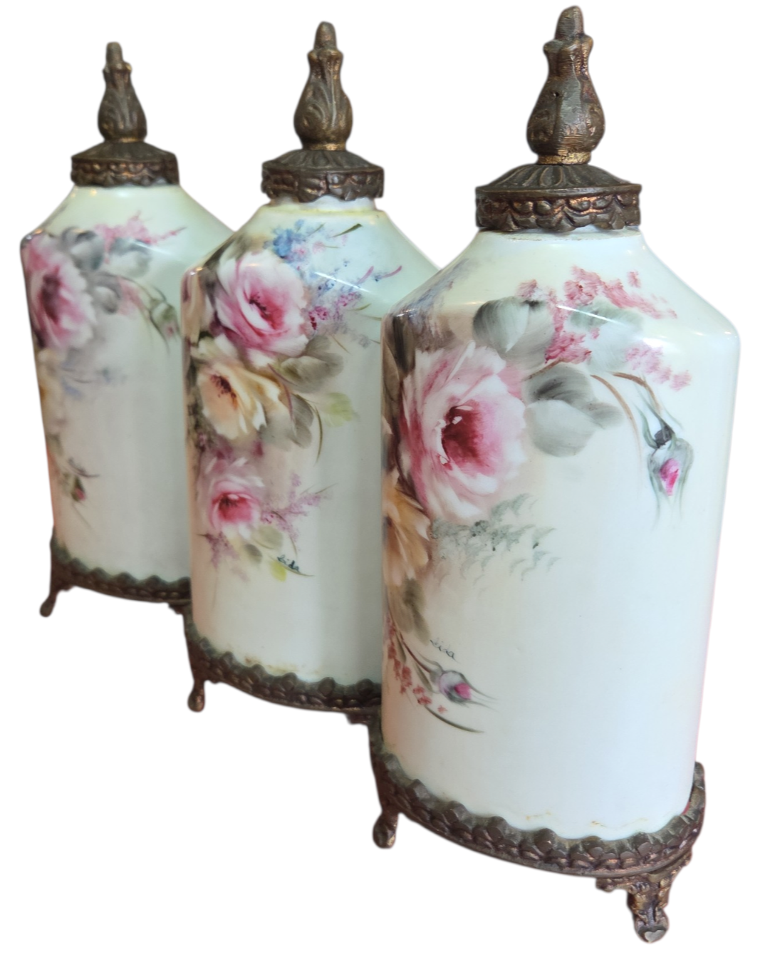 Apresentamos este magnífico trio de potiches (vasos com tampa) em porcelana de alta qualidade, apresentando um formato sextavado que confere modernidade à silhueta clássica. Cada peça é adornada com uma belíssima pintura floral feita à mão, destacando rosas em tons de rosa, creme e toques de azul, com acabamento artístico que confere profundidade e realismo à peça.
