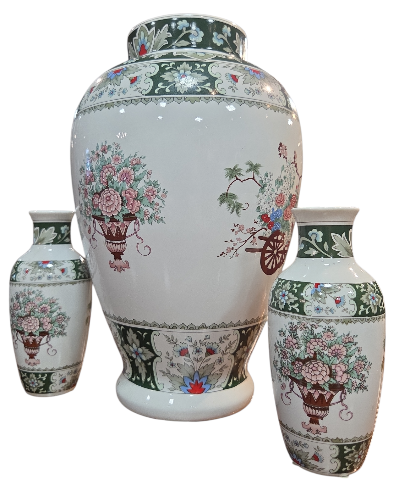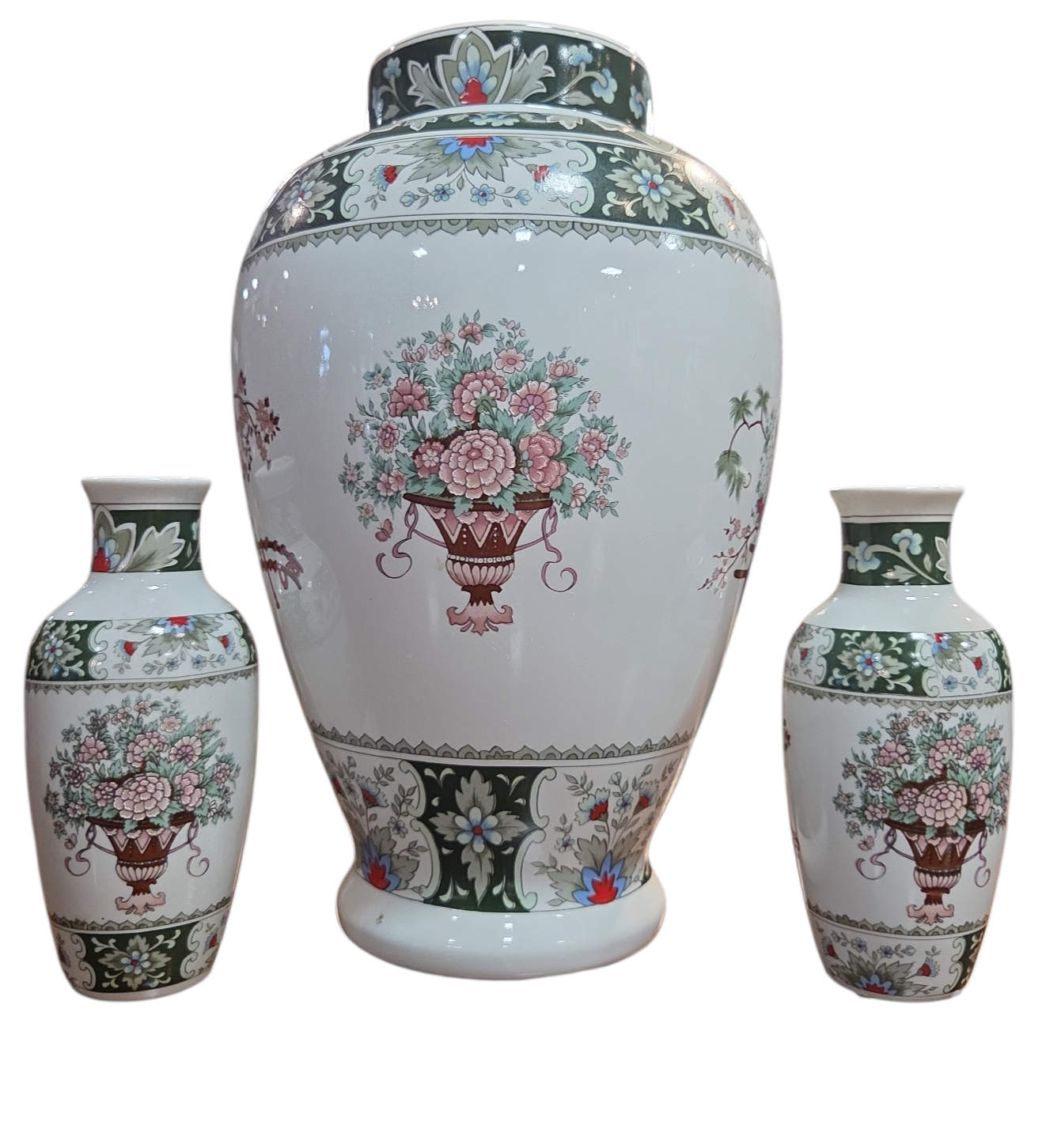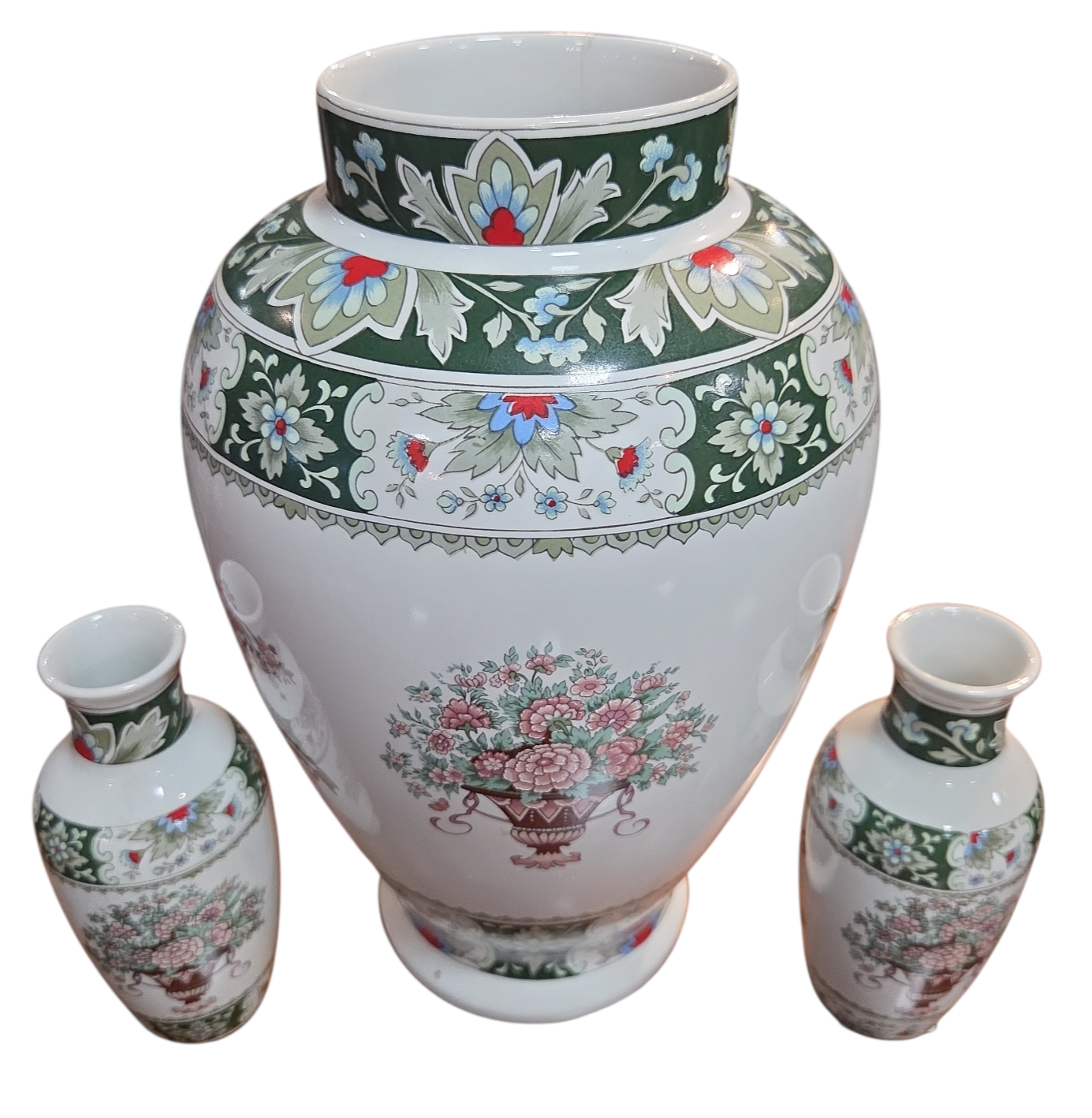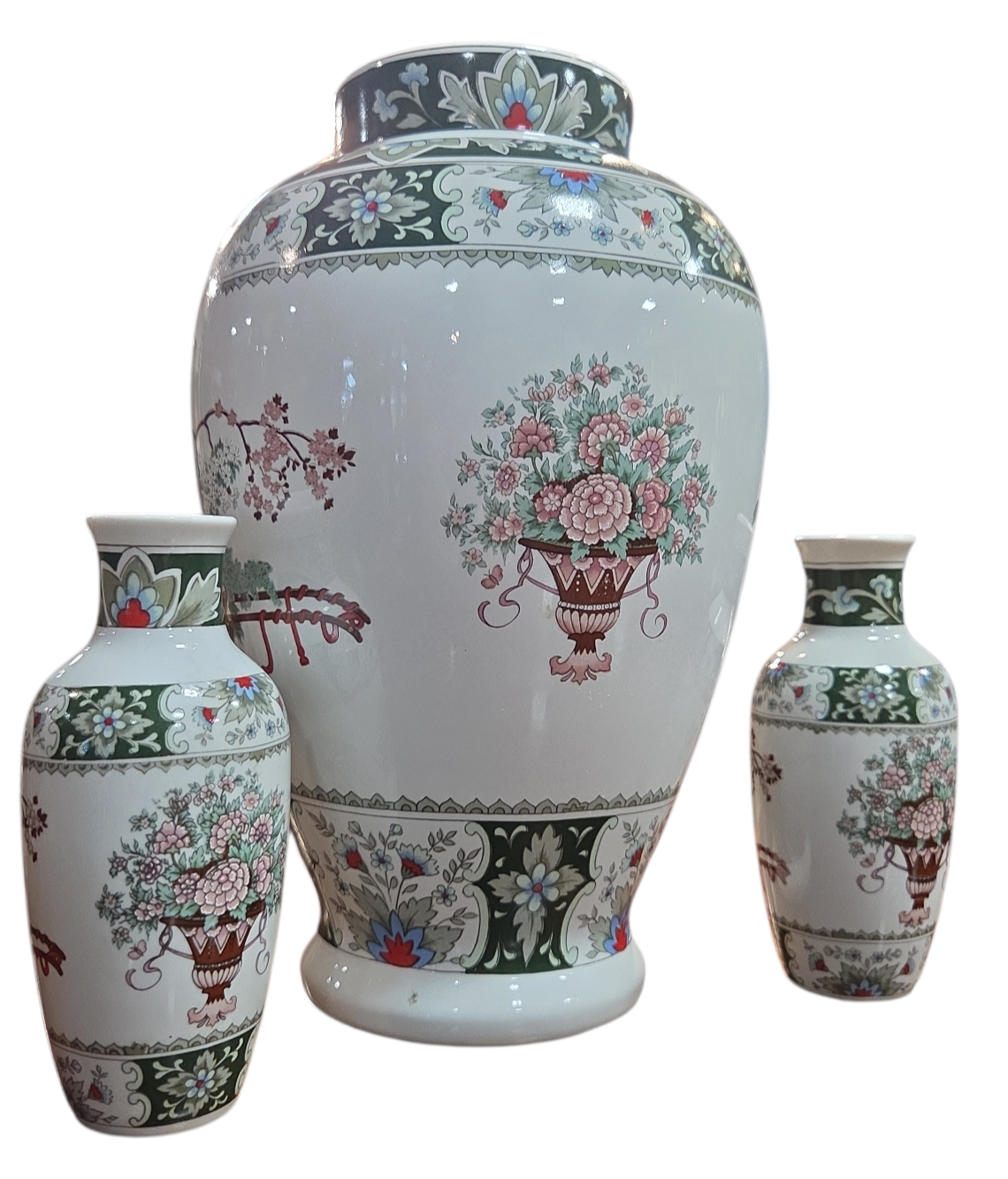 Encantador conjunto composto por três vasos de porcelana branca (um grande e dois menores), fabricados pela renomada marca brasileira Schmidt. As peças apresentam uma decoração rica em detalhes inspirada na estética oriental, com paleta de cores em tons de verde esmeralda, rosa, azul e terracota.