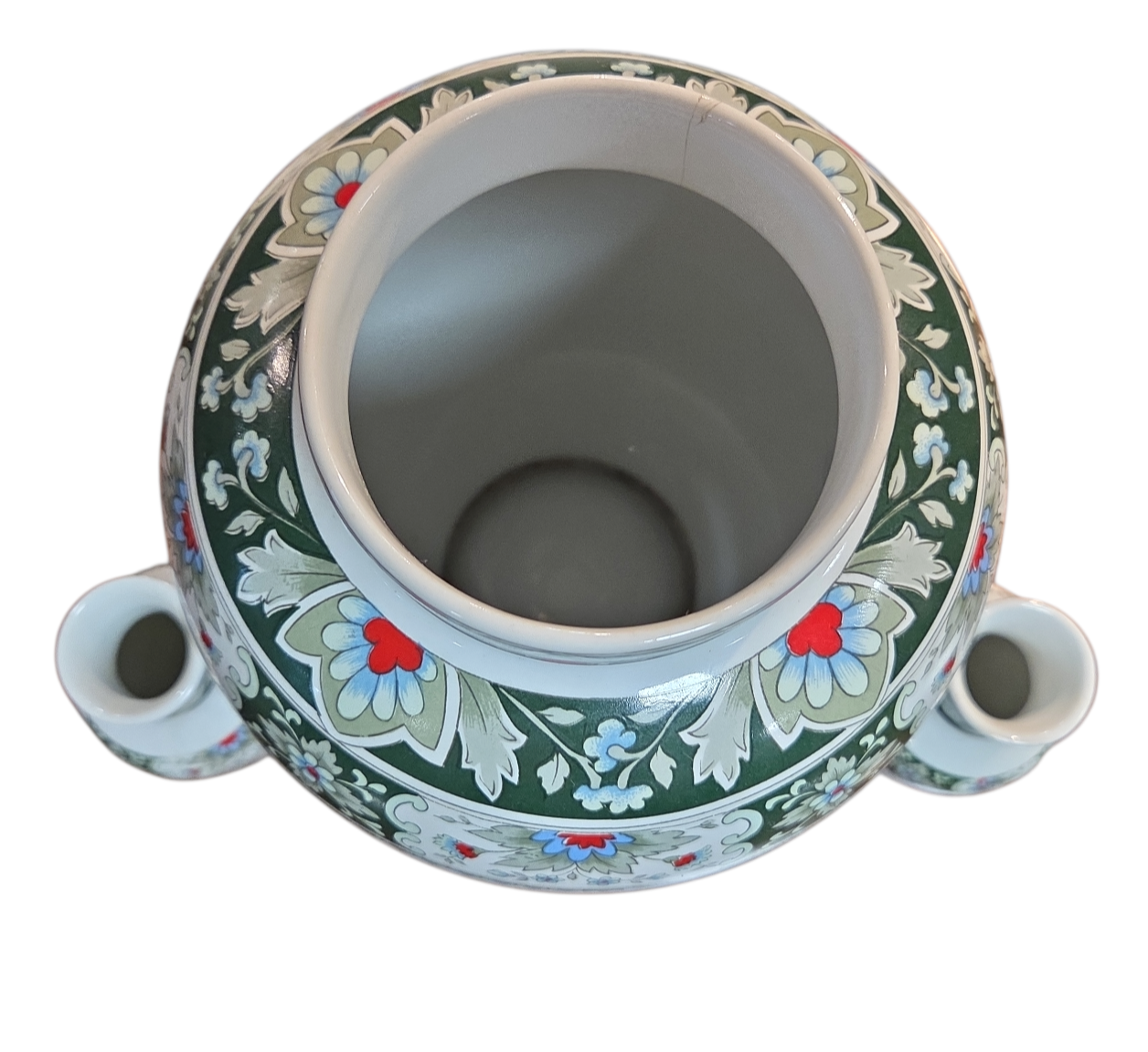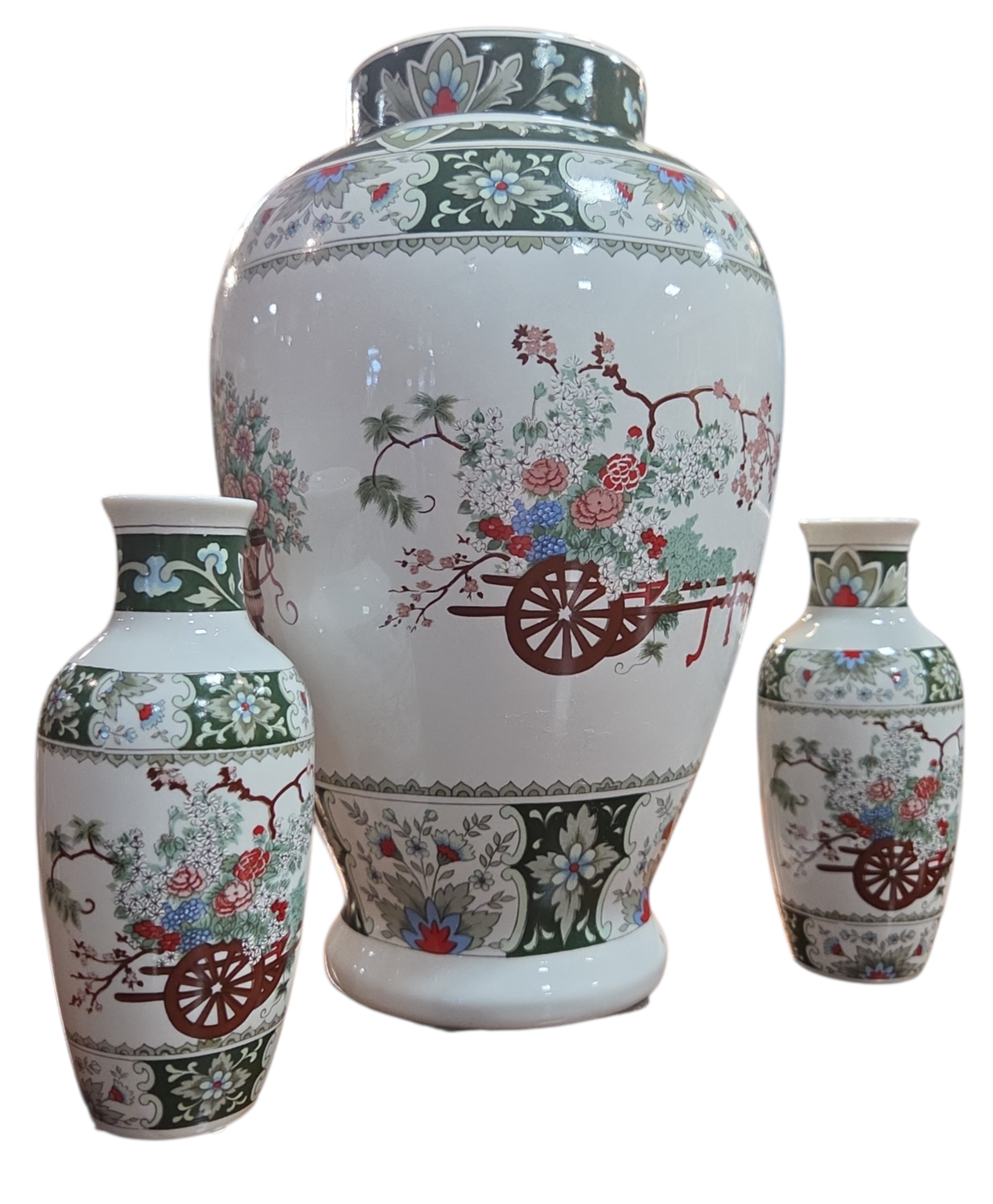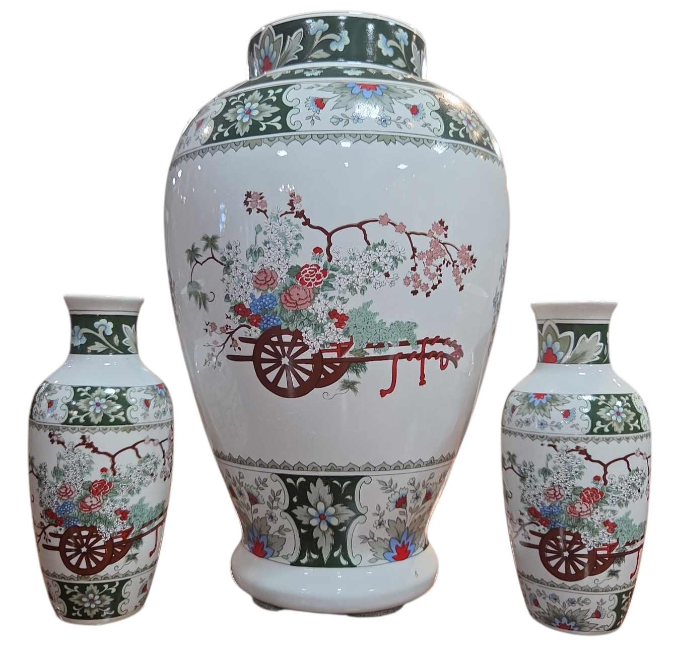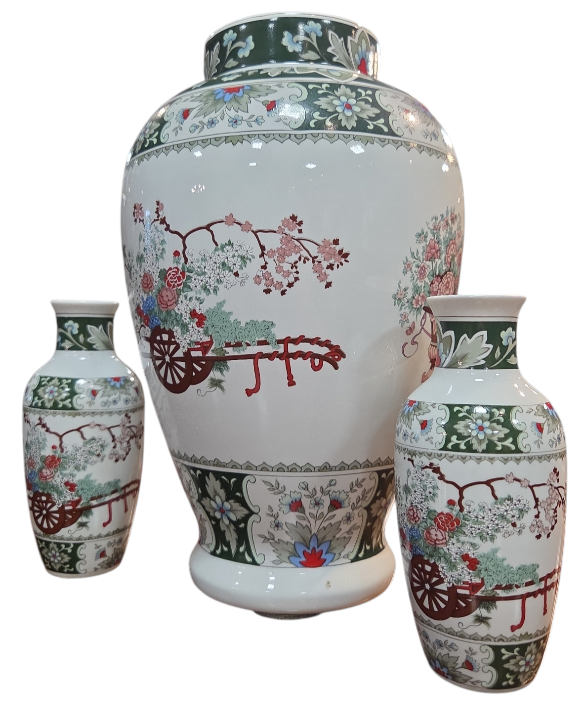 Encantador conjunto composto por três vasos de porcelana branca (um grande e dois menores), fabricados pela renomada marca brasileira Schmidt. As peças apresentam uma decoração rica em detalhes inspirada na estética oriental, com paleta de cores em tons de verde esmeralda, rosa, azul e terracota.