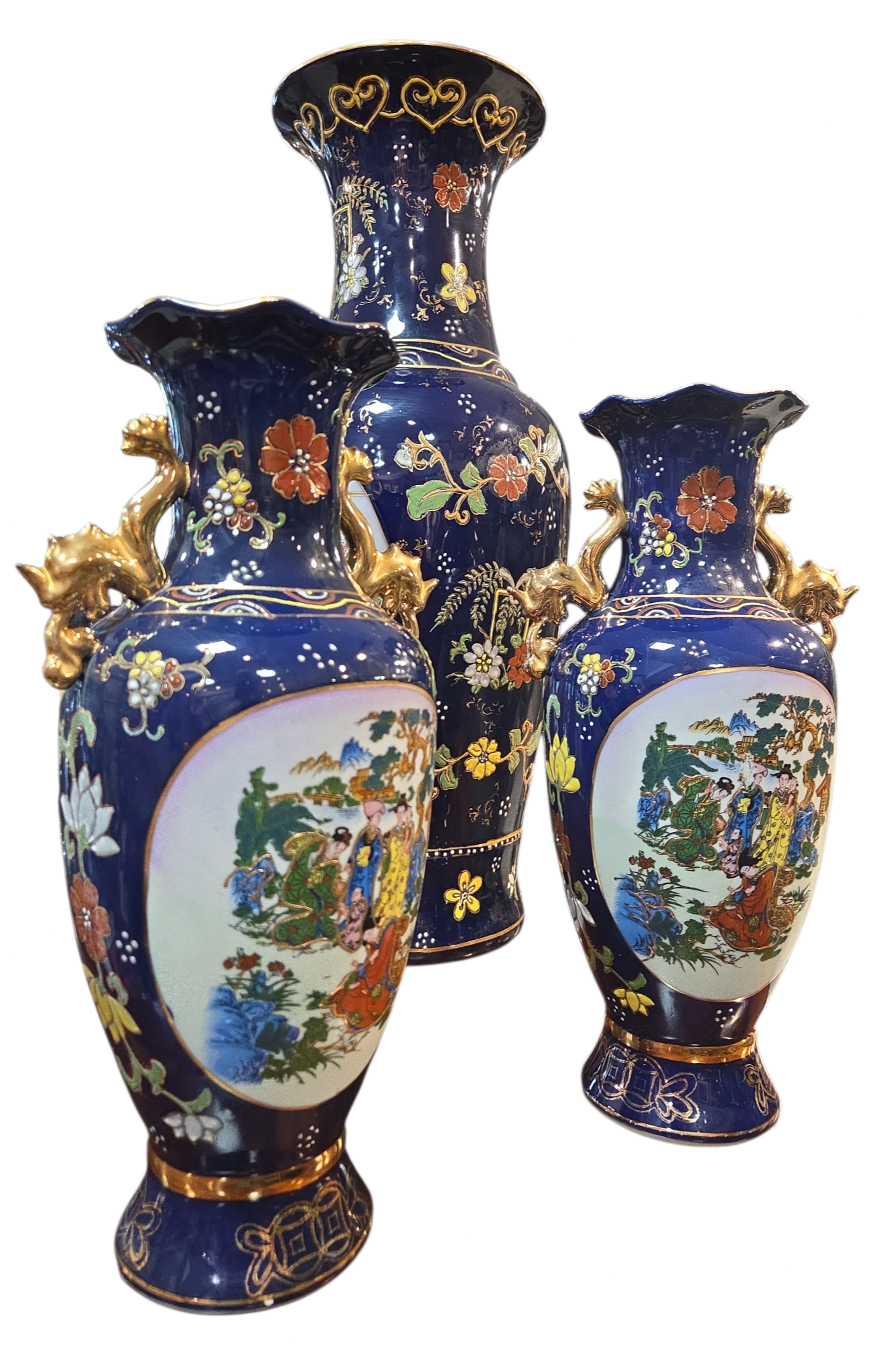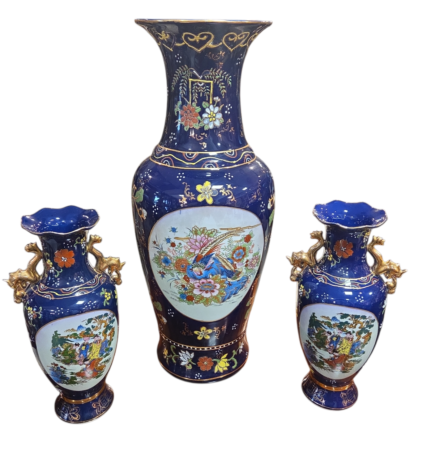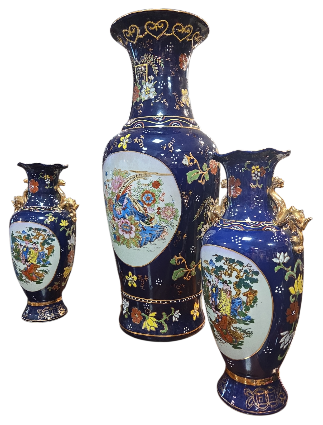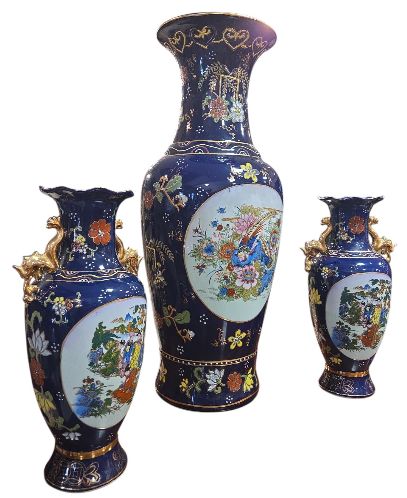 Imponente conjunto decorativo (Garniture) composto por três vasos em porcelana de alta qualidade, apresentando um acabamento luxuoso em tom Azul Cobalto e rica ornamentação manual. Este jogo é um exemplo clássico da estética oriental, ideal para compor aparadores, estantes ou coleções de porcelana fina.