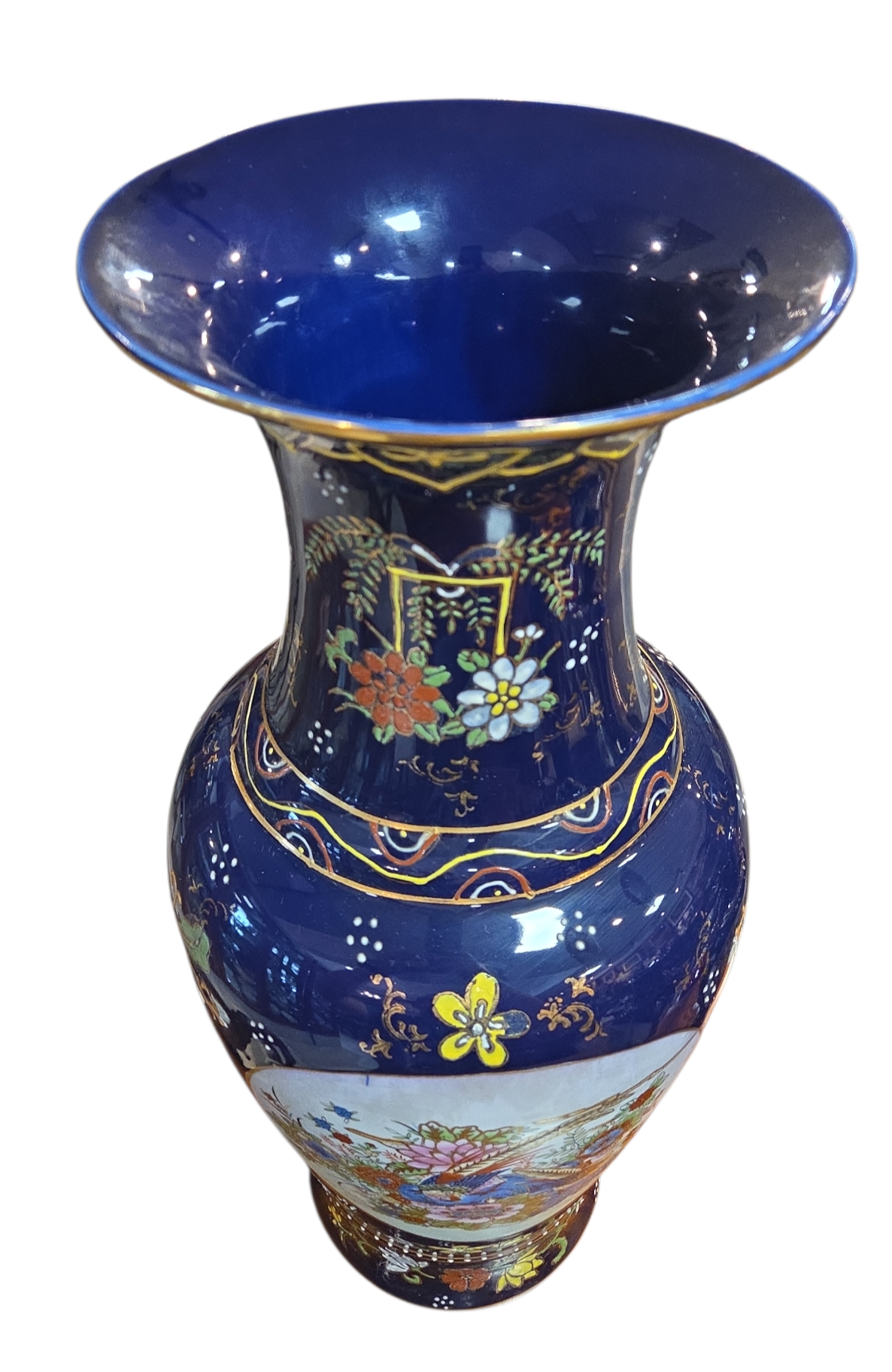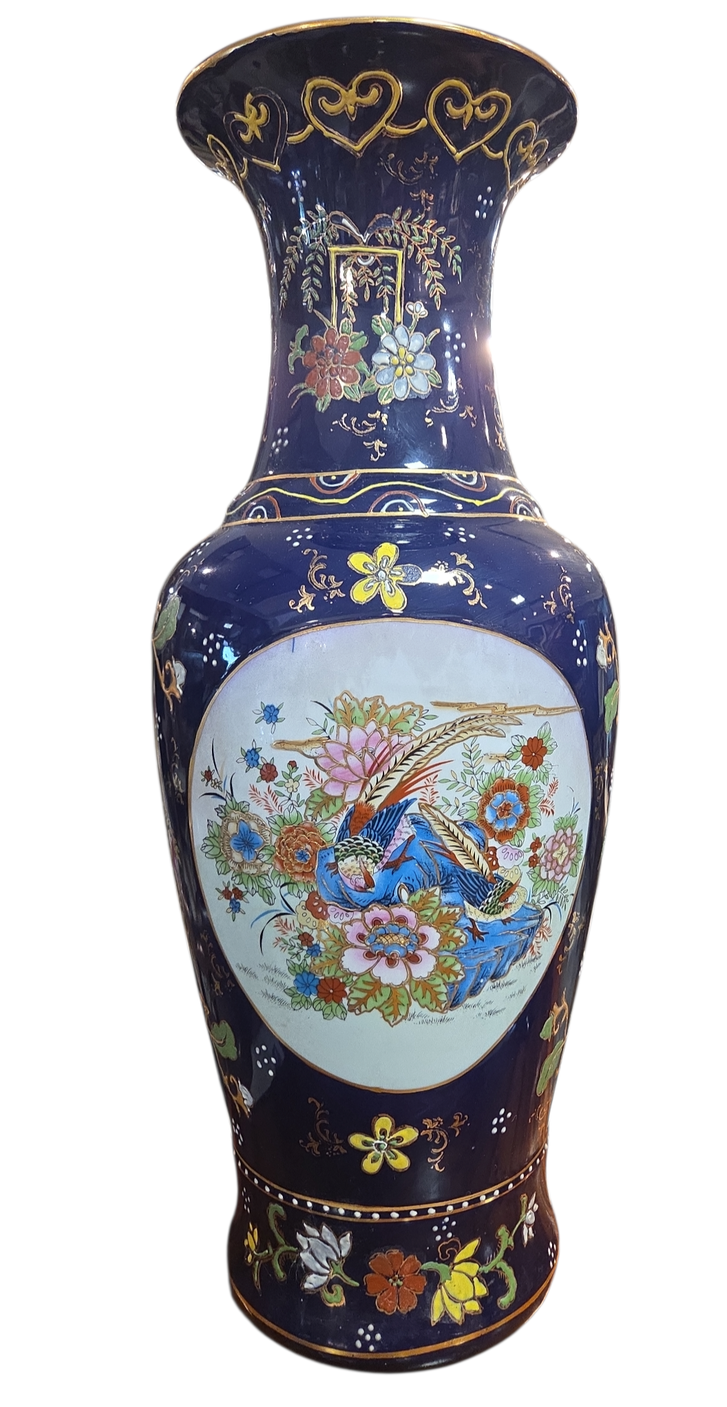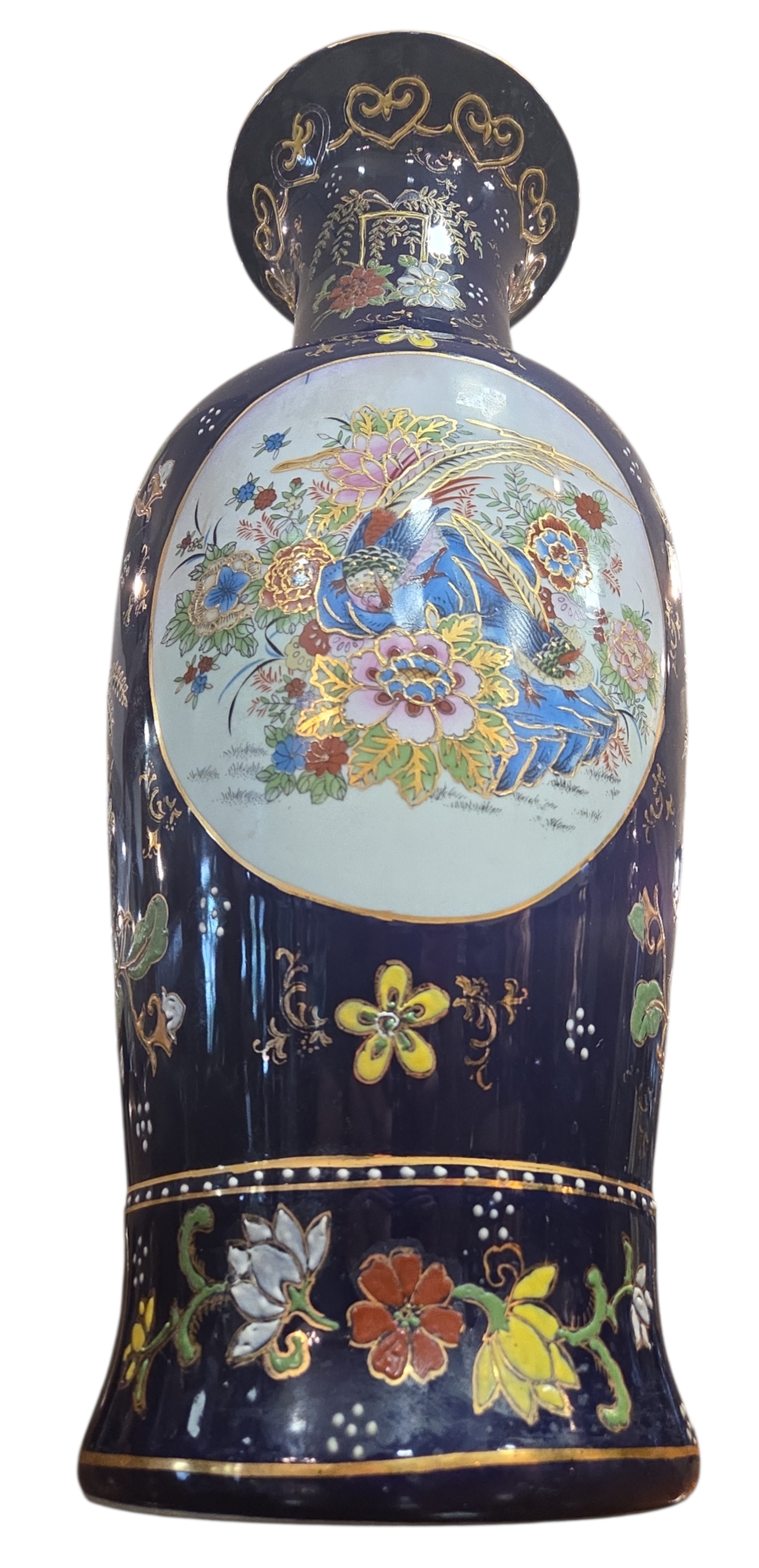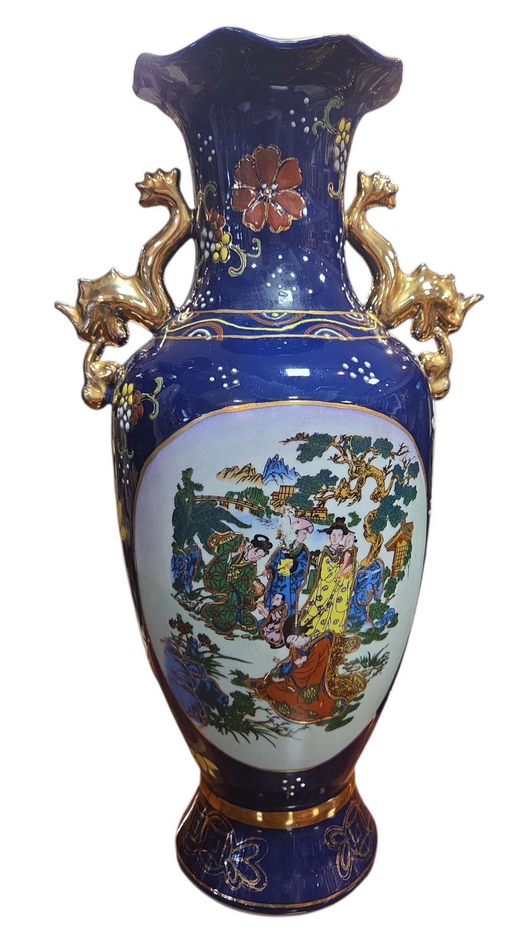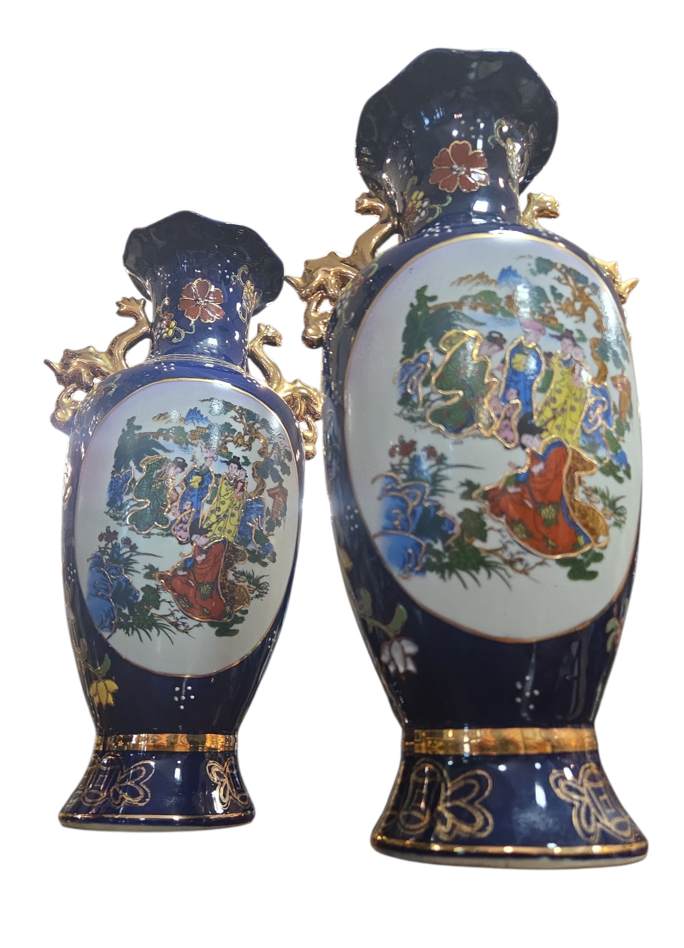 Imponente conjunto decorativo (Garniture) composto por três vasos em porcelana de alta qualidade, apresentando um acabamento luxuoso em tom Azul Cobalto e rica ornamentação manual. Este jogo é um exemplo clássico da estética oriental, ideal para compor aparadores, estantes ou coleções de porcelana fina.