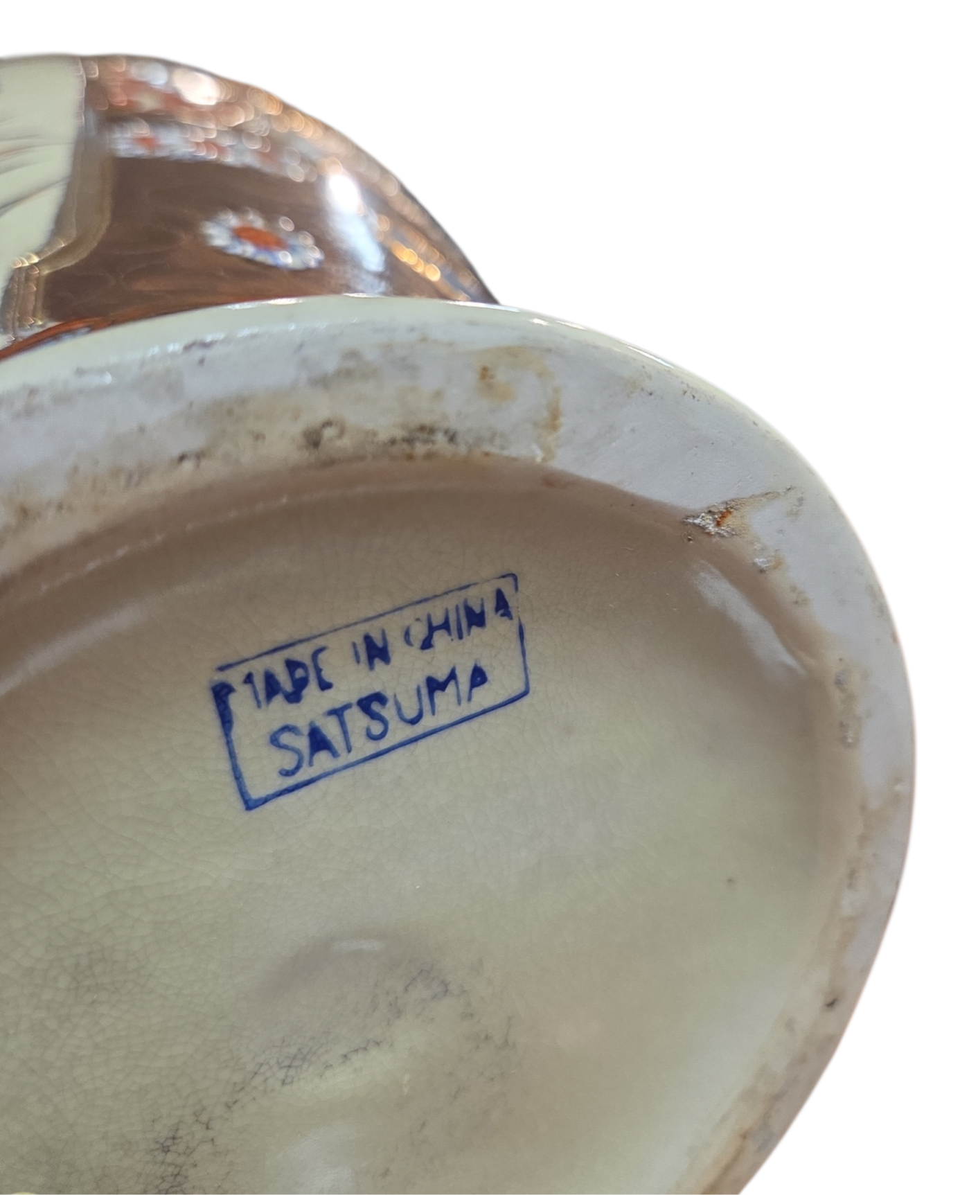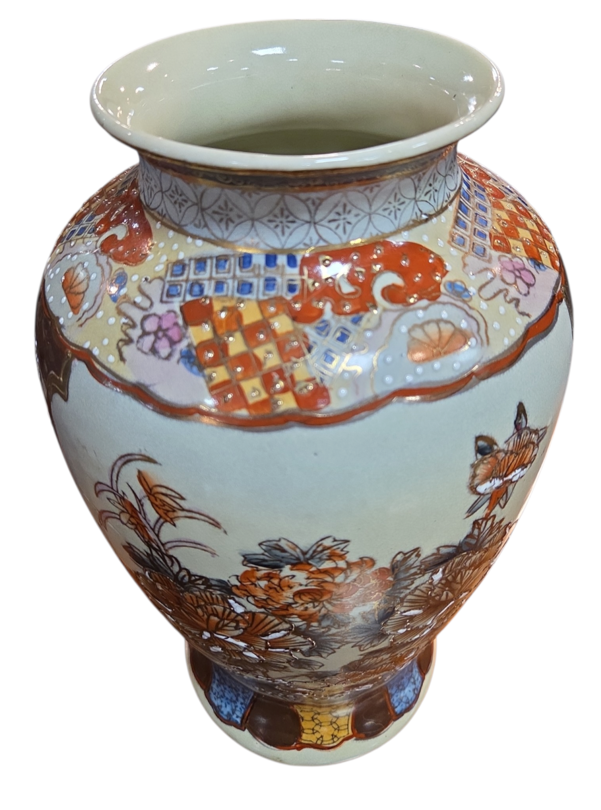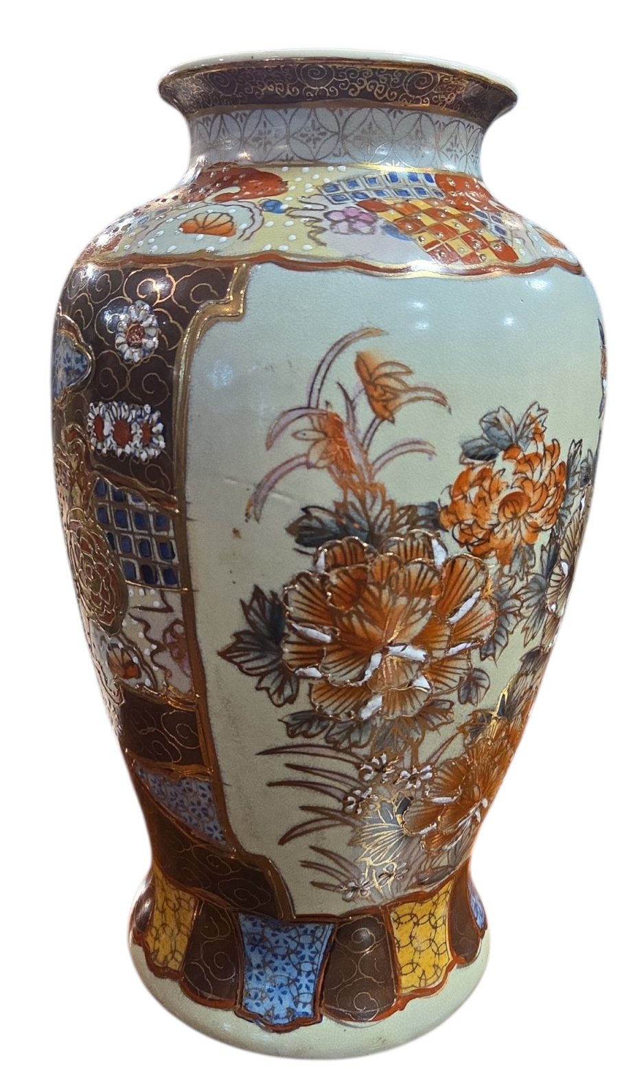 Encante-se com este elegante vaso decorativo que evoca a tradicional estética Satsuma. A peça apresenta um fundo em tom creme suave, servindo de tela para uma rica composição floral e geométrica.