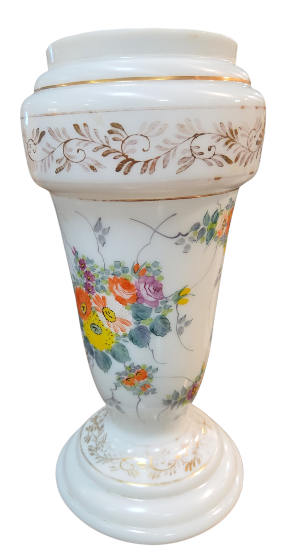 Apresentamos um delicado vaso decorativo em vidro leitoso branco, que combina a elegância da opalinagem com a vivacidade da pintura artesanal. Com um formato de taça estilizada e base circular robusta, esta peça é perfeita para colecionadores de vidraria vintage ou para compor decorações românticas e clássicas.