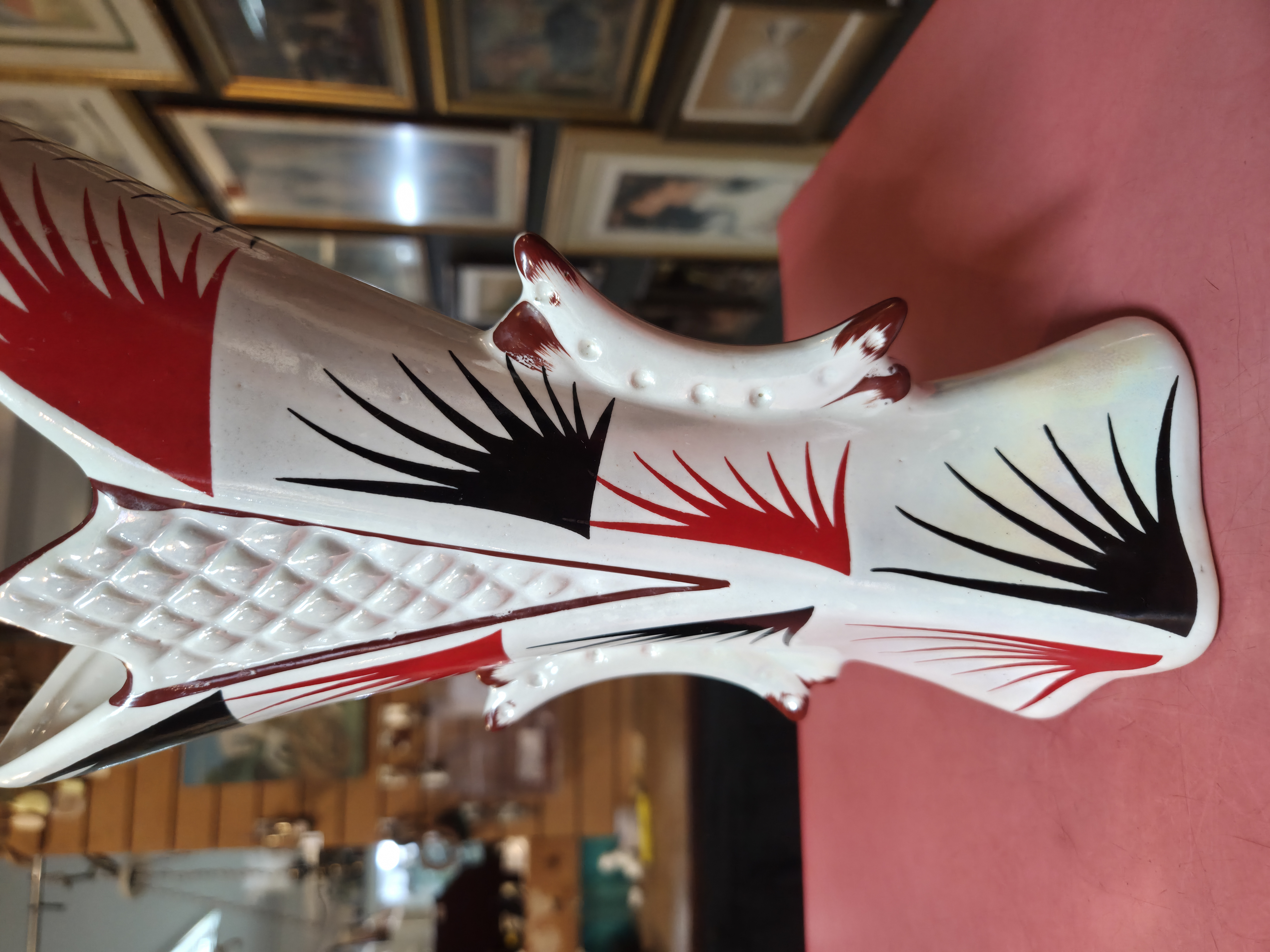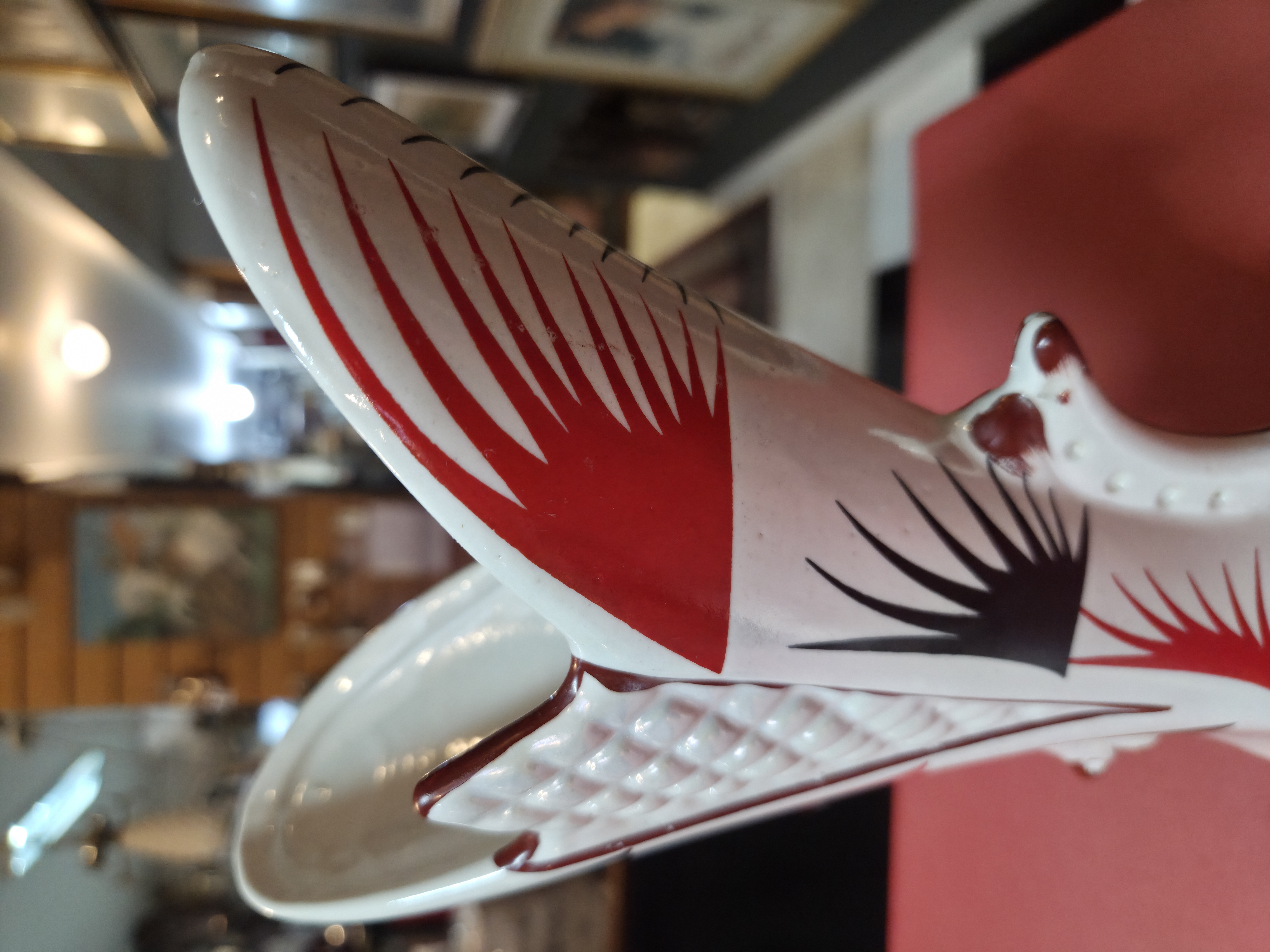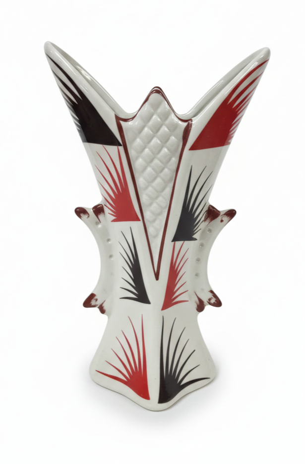 Vaso antigo em porcelana branca decorada com motivos geométricos e abstratos nas cores preto e vermelho. Possui detalhes em relevo e formato diferenciado com alças integradas ao design.