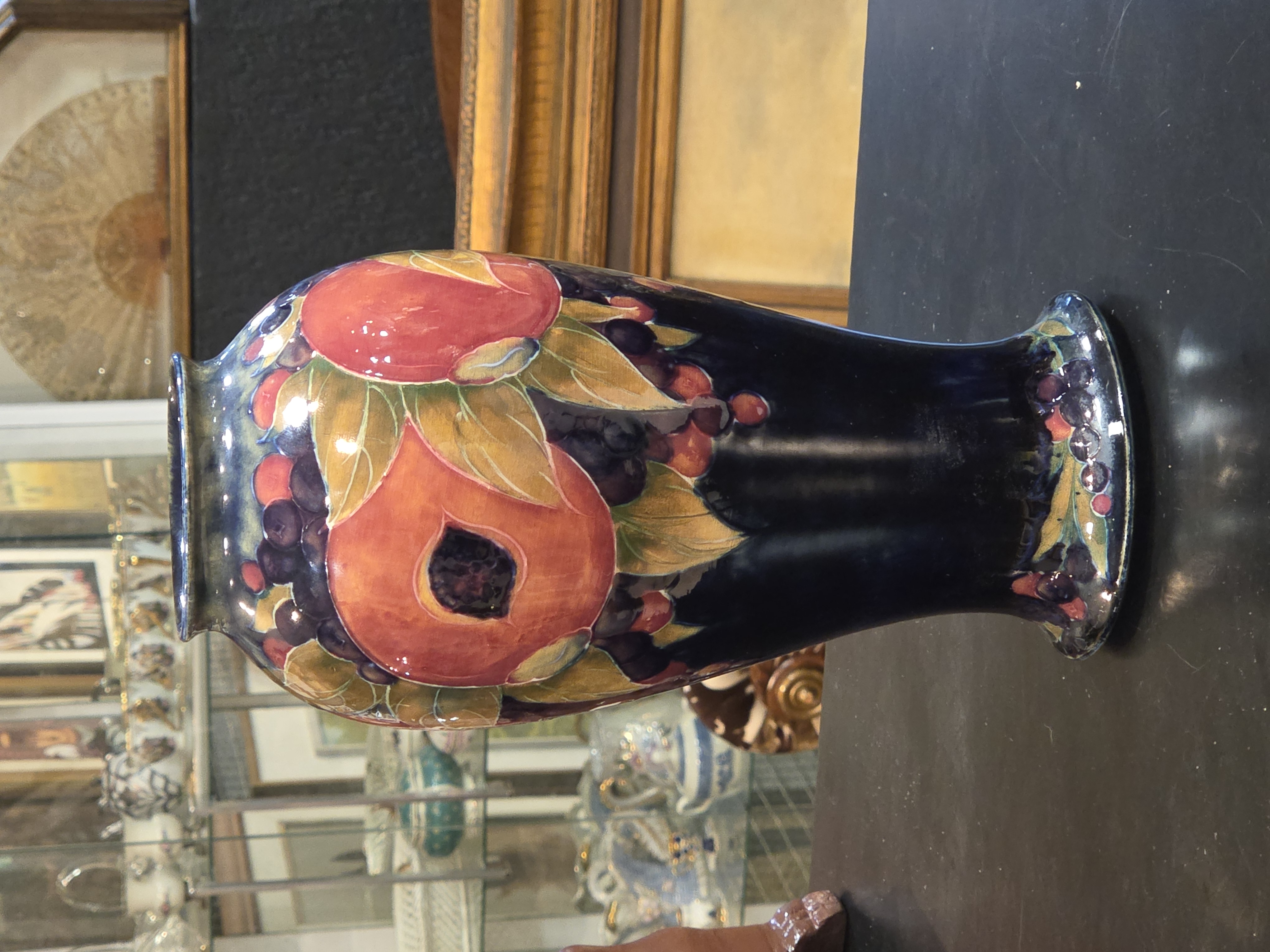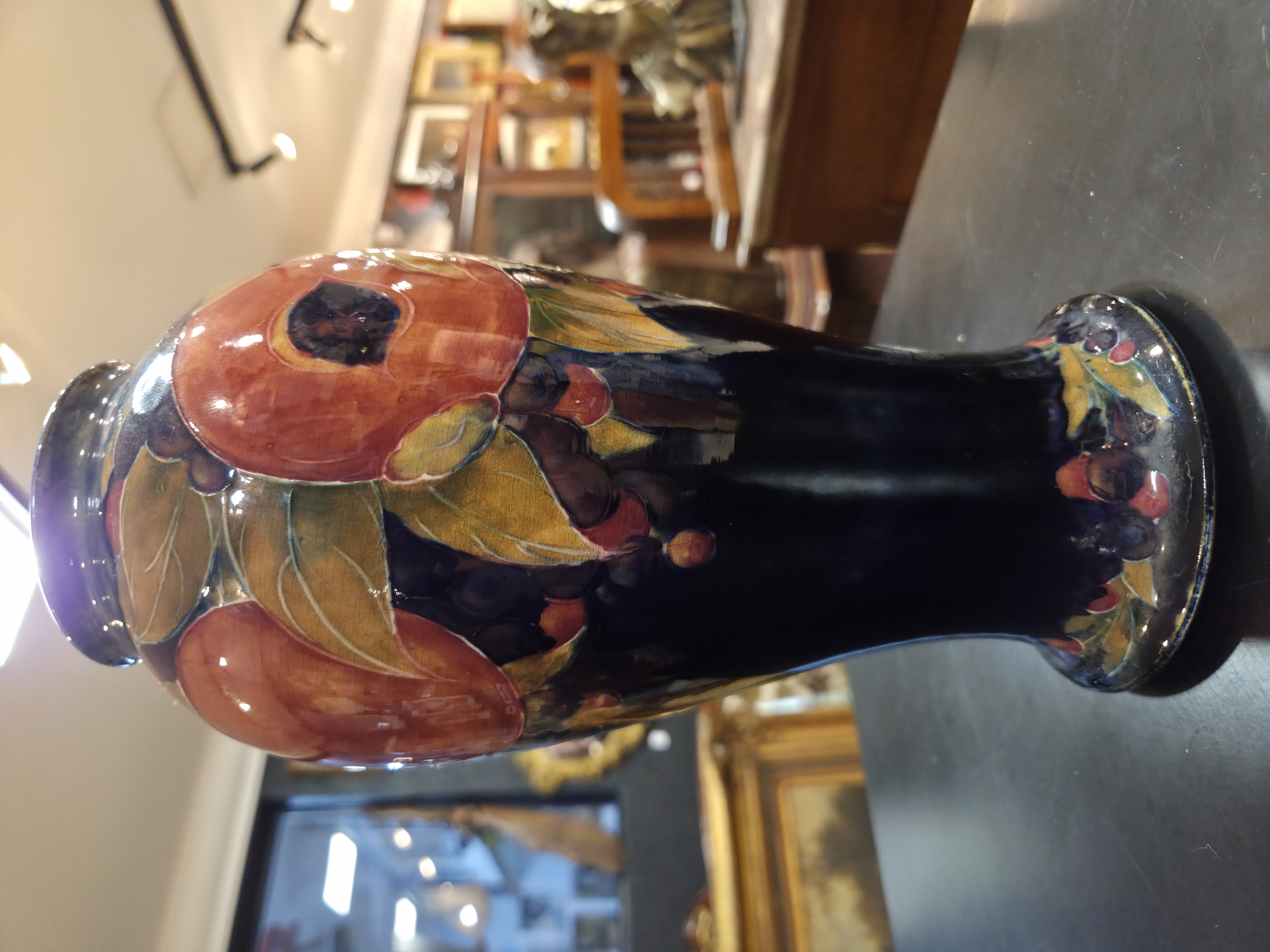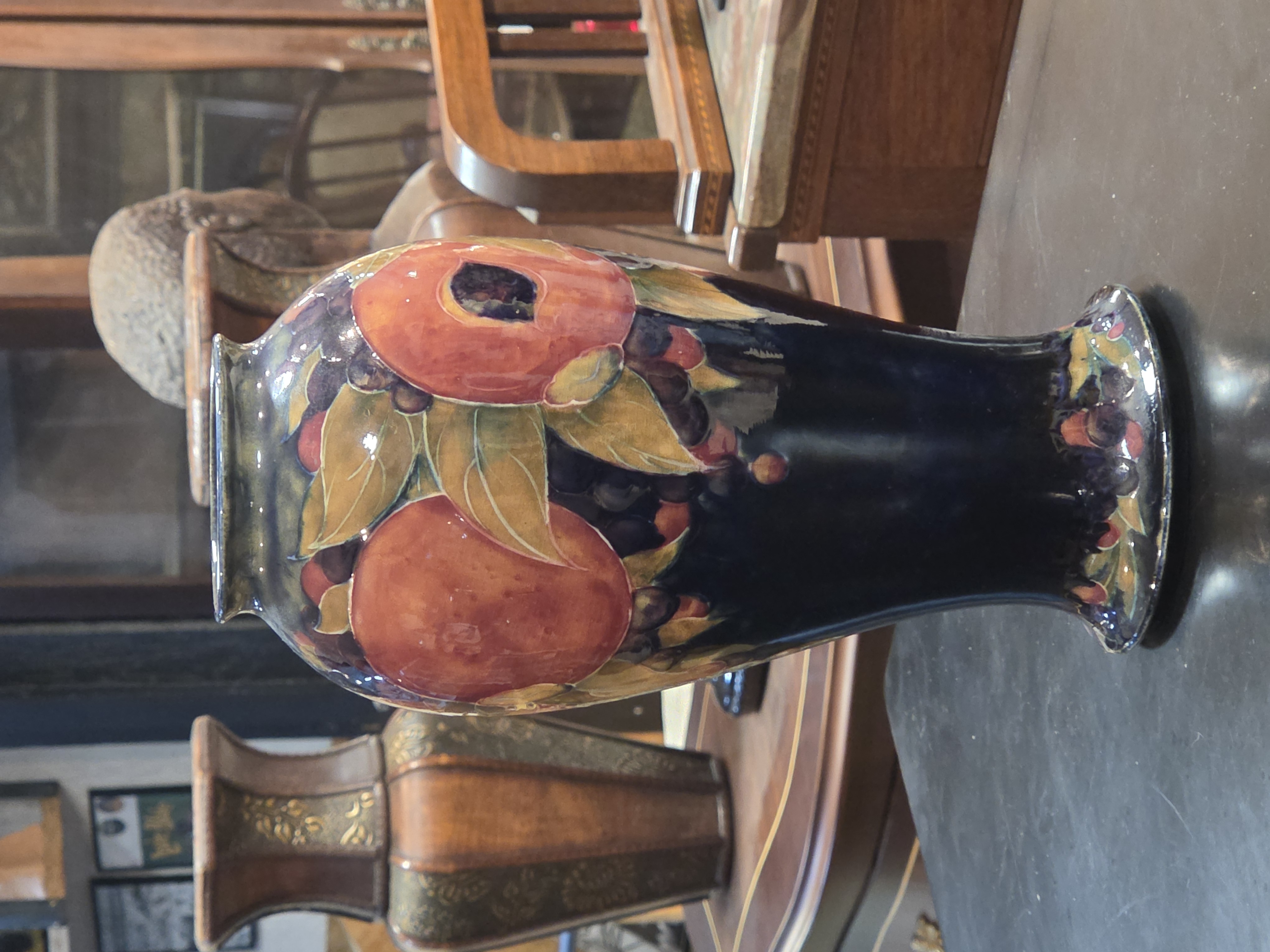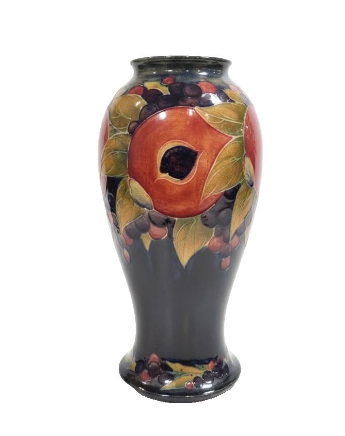 Excepcional vaso inglês da década de 1920, produzido pelo renomado ceramista William Moorcroft, um dos grandes nomes da cerâmica artística britânica. A peça apresenta o inconfundível trabalho artesanal de Moorcroft, com decoração rica, esmaltação de alta qualidade e acabamento primoroso.