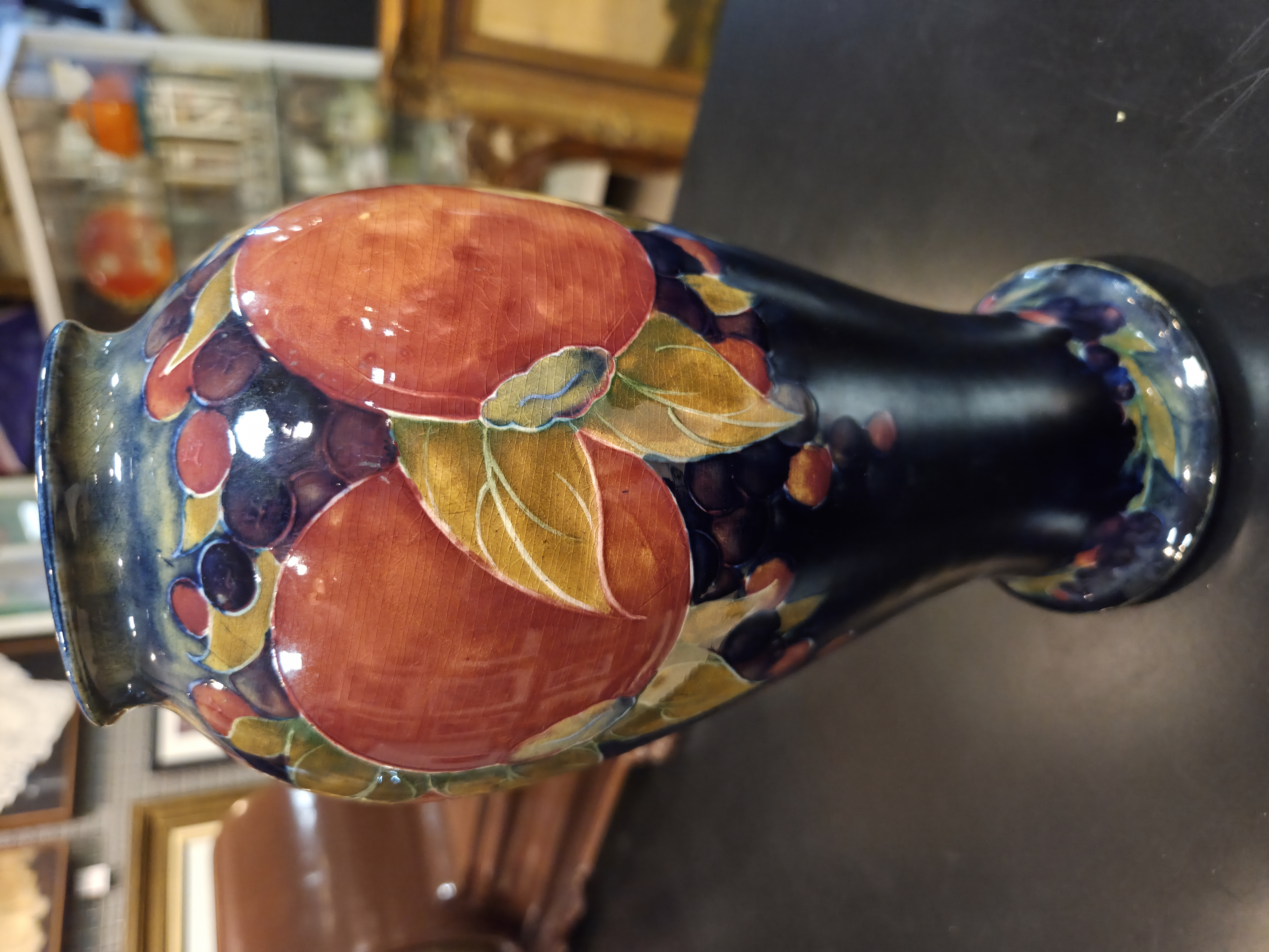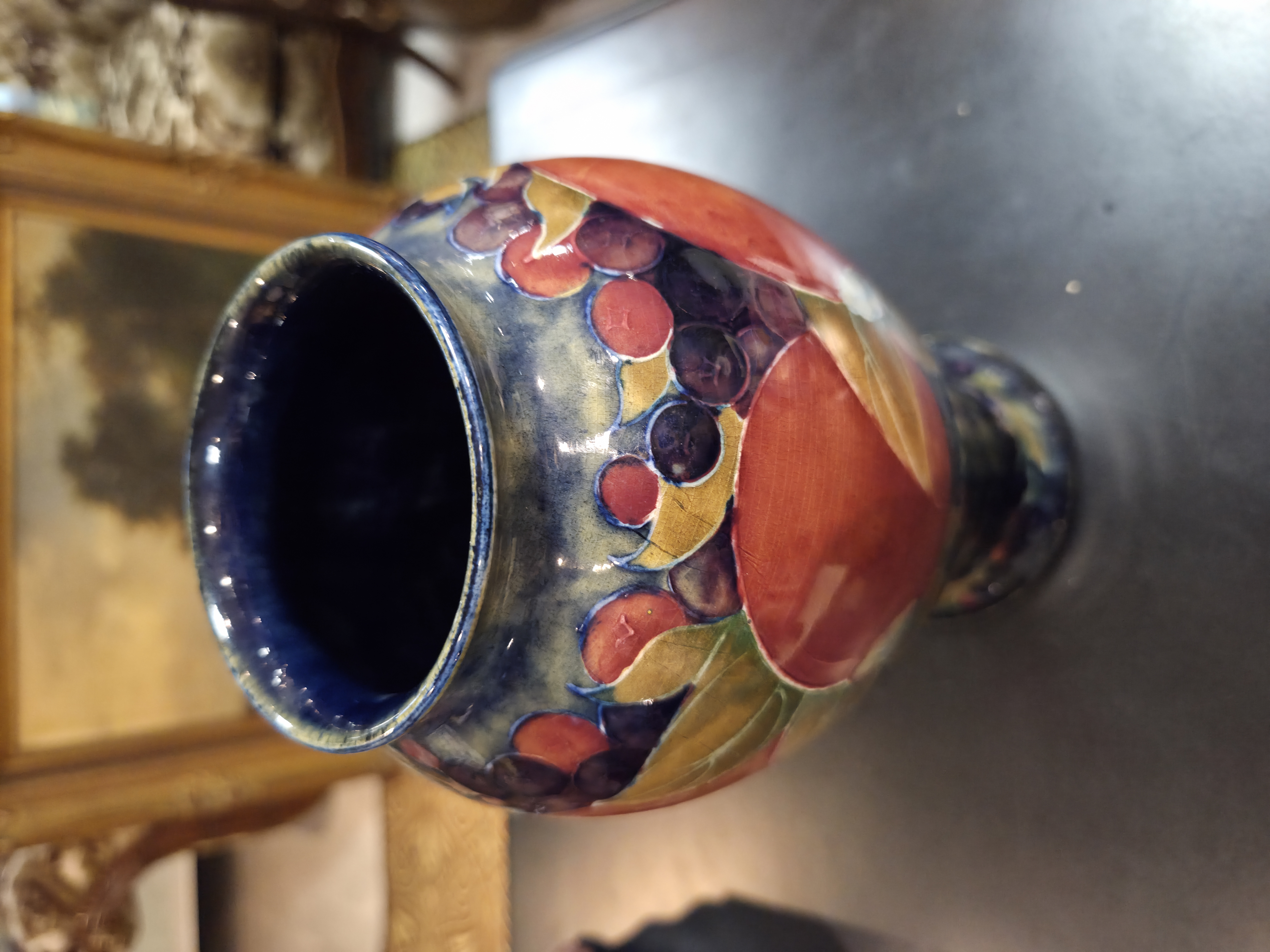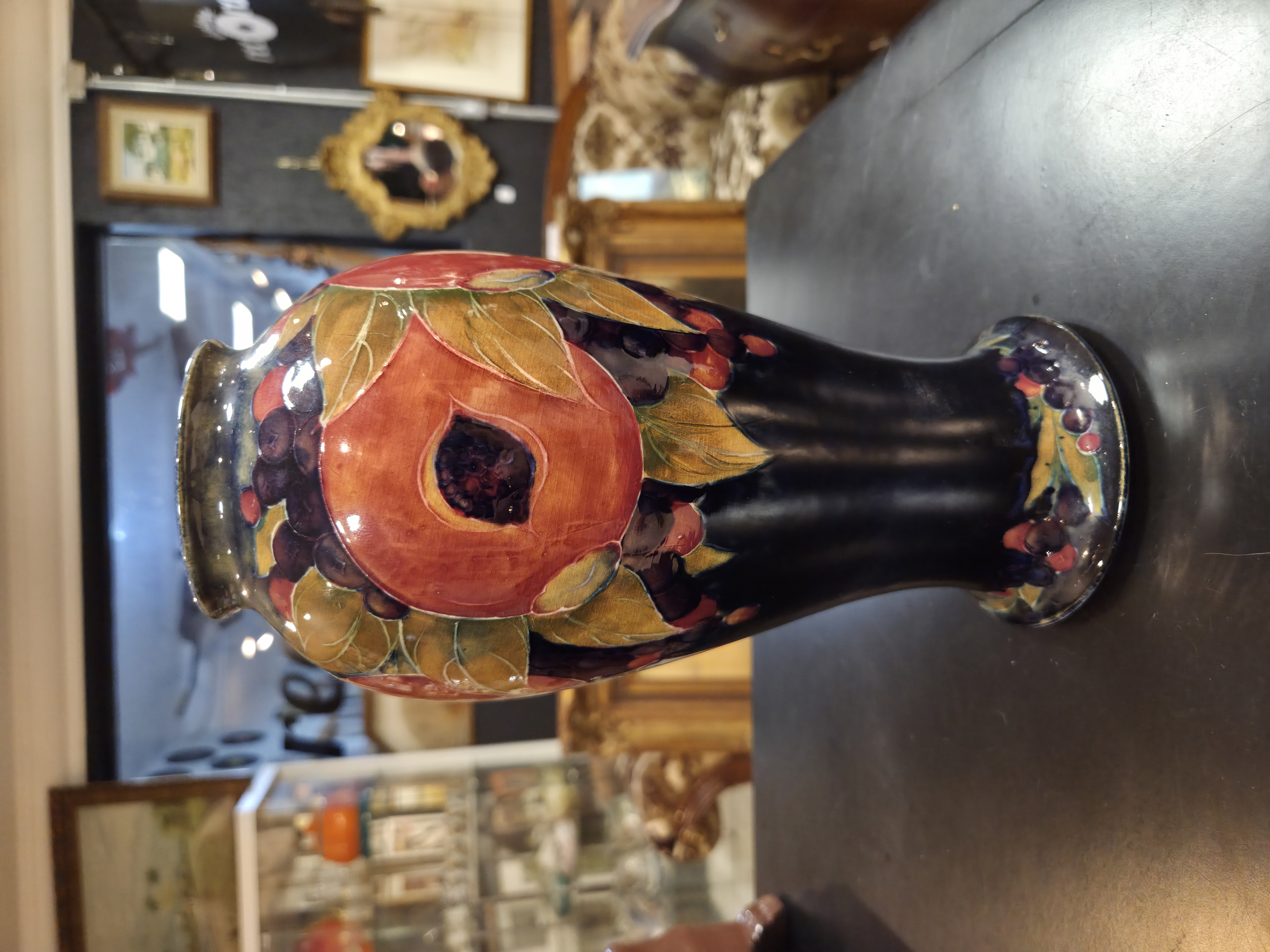 Excepcional vaso inglês da década de 1920, produzido pelo renomado ceramista William Moorcroft, um dos grandes nomes da cerâmica artística britânica. A peça apresenta o inconfundível trabalho artesanal de Moorcroft, com decoração rica, esmaltação de alta qualidade e acabamento primoroso.