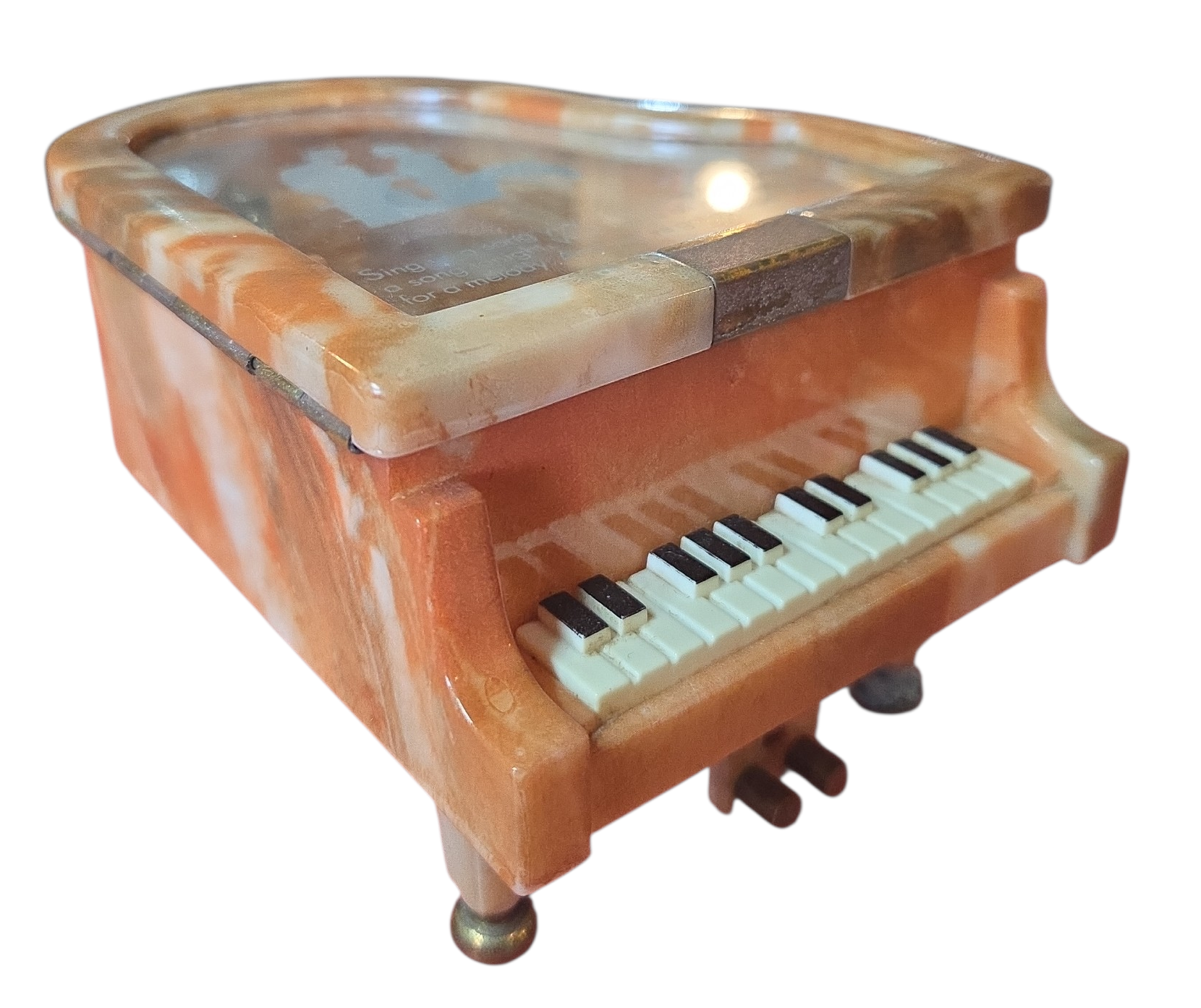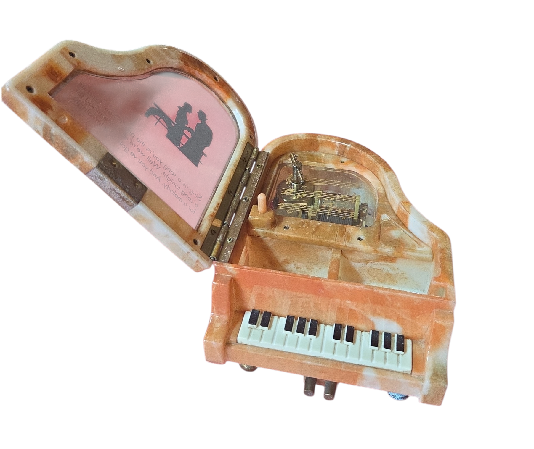 maestria da música em miniatura. Esta caixa de música reproduz fielmente as linhas elegantes de um piano de cauda, transformando-se em uma peça de destaque em qualquer ambiente. Com sua tampa articulada que revela o "mecanismo interno" ou um pequeno compartimento para joias, ela é uma homenagem à era de ouro dos concertos clássicos. O acabamento polido simula o brilho do verniz de um instrumento real, enquanto a melodia flui suavemente assim que a corda é acionada, encantando músicos e admiradores da arte.